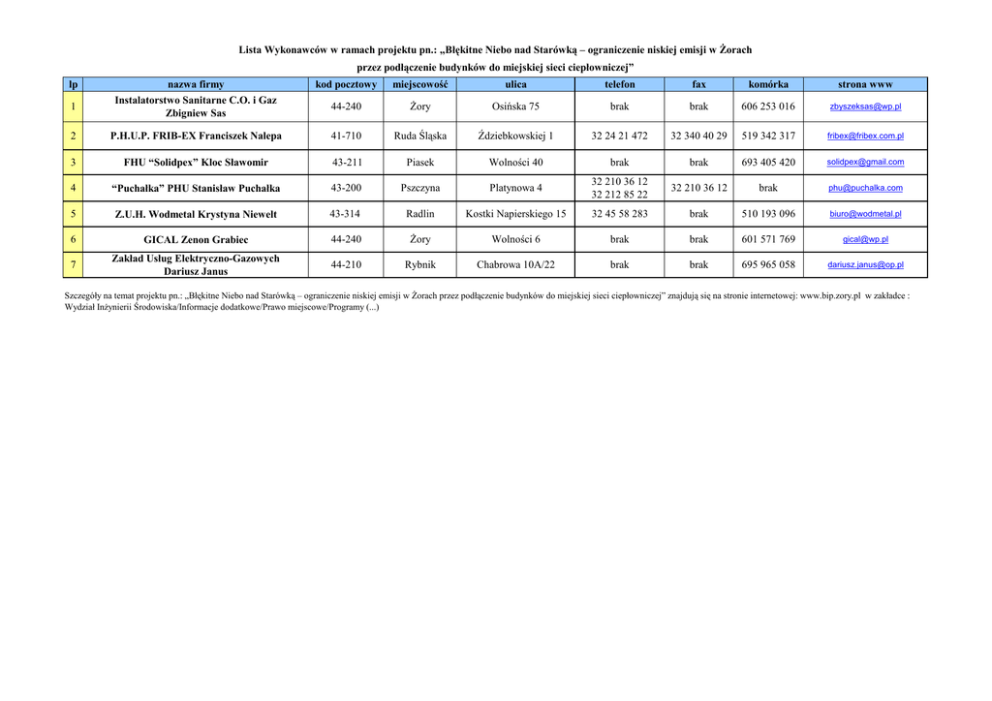 Lista Wykonawców w ramach projektu pn.: „Błękitne Niebo nad Starówką – ograniczenie niskiej emisji w śorach przez podłączenie budynków do miejskiej sieci ciepłowniczej” lp nazwa firmy Instalatorstwo Sanitarne C.O. i Gaz Zbigniew Sas kod pocztowy miejscowość ulica telefon fax komórka strona www 44-240 śory Osińska 75 brak brak 606 253 016 [email protected] 2 P.H.U.P. FRIB-EX Franciszek Nalepa 41-710 Ruda Śląska Ździebkowskiej 1 32 24 21 472 32 340 40 29 519 342 317 [email protected] 3 FHU “Solidpex” Kloc Sławomir 43-211 Piasek Wolności 40 brak brak 693 405 420 [email protected] 4 “Puchałka” PHU Stanisław Puchałka 43-200 Pszczyna Platynowa 4 32 210 36 12 32 212 85 22 32 210 36 12 brak [email protected] 5 Z.U.H. Wodmetal Krystyna Niewelt 43-314 Radlin Kostki Napierskiego 15 32 45 58 283 brak 510 193 096 [email protected] 6 GICAL Zenon Grabiec 44-240 śory Wolności 6 brak brak 601 571 769 [email protected] 7 Zakład Usług Elektryczno-Gazowych Dariusz Janus 44-210 Rybnik Chabrowa 10A/22 brak brak 695 965 058 [email protected] 1 Szczegóły na temat projektu pn.: „Błękitne Niebo nad Starówką – ograniczenie niskiej emisji w śorach przez podłączenie budynków do miejskiej sieci ciepłowniczej” znajdują się na stronie internetowej: www.bip.zory.pl w zakładce : Wydział InŜynierii Środowiska/Informacje dodatkowe/Prawo miejscowe/Programy (...)