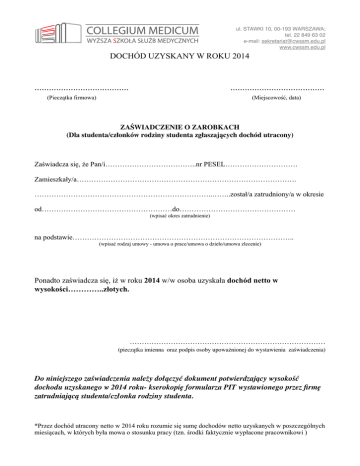 ul. STAWKI 10, 00-193 WARSZAWA; tel. 22 849 63 02 e-mail: [email protected] www.cwssm.edu.pl DOCHÓD UZYSKANY W ROKU 2014 ....................................... ....................................... (Pieczątka firmowa) (Miejscowość, data) ZAŚWIADCZENIE O ZAROBKACH (Dla studenta/członków rodziny studenta zgłaszających dochód utracony) Zaświadcza się, że Pan/i………………………………..nr PESEL………………………… Zamieszkały/a………………………………………………………………………………. ………………………………………………………………..……..został/a zatrudniony/a w okresie od………………………………………………do………………………………………… (wpisać okres zatrudnienie) na podstawie……………………………………………………………………………….. (wpisać rodzaj umowy - umowa o prace/umowa o dzieło/umowa zlecenie) Ponadto zaświadcza się, iż w roku 2014 w/w osoba uzyskała dochód netto w wysokości…………..złotych. ……………………………………………………………………… (pieczątka imienna oraz podpis osoby upoważnionej do wystawienia zaświadczenia) Do niniejszego zaświadczenia należy dołączyć dokument potwierdzający wysokość dochodu uzyskanego w 2014 roku- kserokopię formularza PIT wystawionego przez firmę zatrudniającą studenta/członka rodziny studenta. *Przez dochód utracony netto w 2014 roku rozumie się sumę dochodów netto uzyskanych w poszczególnych miesiącach, w których była mowa o stosunku pracy (tzn. środki faktycznie wypłacone pracownikowi )