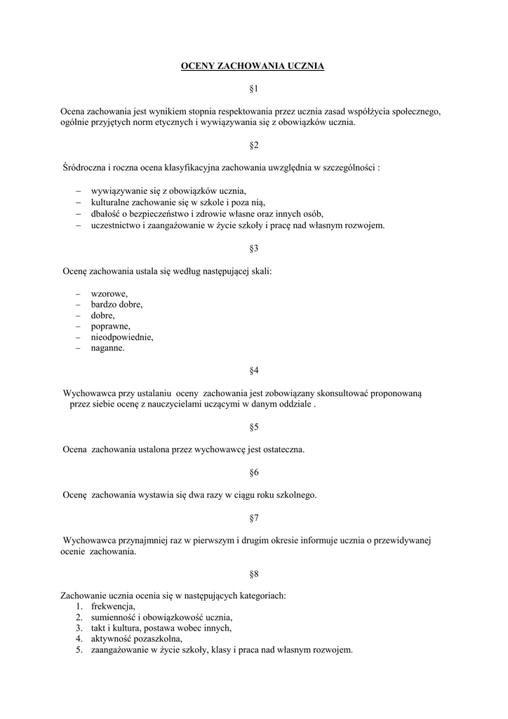OCENY ZACHOWANIA UCZNIA §1 Ocena zachowania jest wynikiem stopnia respektowania przez ucznia zasad współżycia społecznego, ogólnie przyjętych norm etycznych i wywiązywania się z obowiązków ucznia. §2 Śródroczna i roczna ocena klasyfikacyjna zachowania uwzględnia w szczególności : − − − − wywiązywanie się z obowiązków ucznia, kulturalne zachowanie się w szkole i poza nią, dbałość o bezpieczeństwo i zdrowie własne oraz innych osób, uczestnictwo i zaangażowanie w życie szkoły i pracę nad własnym rozwojem. §3 Ocenę zachowania ustala się według następującej skali: − − − − − − wzorowe, bardzo dobre, dobre, poprawne, nieodpowiednie, naganne. §4 Wychowawca przy ustalaniu oceny zachowania jest zobowiązany skonsultować proponowaną przez siebie ocenę z nauczycielami uczącymi w danym oddziale . §5 Ocena zachowania ustalona przez wychowawcę jest ostateczna. §6 Ocenę zachowania wystawia się dwa razy w ciągu roku szkolnego. §7 Wychowawca przynajmniej raz w pierwszym i drugim okresie informuje ucznia o przewidywanej ocenie zachowania. §8 Zachowanie ucznia ocenia się w następujących kategoriach: 1. frekwencja, 2. sumienność i obowiązkowość ucznia, 3. takt i kultura, postawa wobec innych, 4. aktywność pozaszkolna, 5. zaangażowanie w życie szkoły, klasy i praca nad własnym rozwojem. Zadaniem oceniającego jest wybór jednego spośród kilku opisów zachowania w danej kategorii – najpełniej oddającego postawę ucznia. Opisy we wszystkich kategoriach zachowania ułożone są w kolejności od najbardziej pożądanych (świadomie kształtowanych przez szkołę, składających się na oczekiwaną sylwetkę jej absolwenta) do uznawanych za nieodpowiednie. Liczba przy wybranym opisie oznacza ocenę – liczbę punktów przyznanych uczniowi w danej kategorii. Punktem wyjścia do ustalenia oceny zachowania w poszczególnych kategoriach przez wychowawcę jest porównanie samooceny ucznia z oceną jego zachowania przez wychowawcę. Semestralna ocena zachowania wyznaczana jest na podstawie średniej arytmetycznej ocen cząstkowych z uwzględnieniem zasad ogólnych regulaminu oceniania zachowania ucznia. Roczna ocena zachowania wyznaczana jest na podstawie średniej arytmetycznej ocen cząstkowych z całego roku z uwzględnieniem zasad ogólnych regulaminu oceniania zachowania ucznia. Zalecane zasady zaokrąglania średniej przy wyznaczaniu oceny semestralnej i rocznej: 6,0 – 5,5 – zachowanie wzorowe 5,4 – 4,5 – zachowanie bardzo dobre 4,4 – 3,5 – zachowanie dobre 3,4 – 2,5 – zachowanie poprawne 2,4 – 1,5 – zachowanie nieodpowiednie 1,4 – 1,0 – zachowanie naganne §9 Oceny w poszczególnych kategoriach wystawiane są przynajmniej na dwa tygodnie przed wystawianiem semestralnej lub rocznej oceny z zachowania (nie dotyczy kategorii „frekwencja”, gdzie ocena może być wystawiona najpóźniej w dniu wystawienia ostatecznej oceny z zachowania). Wszyscy uczący w danej klasie mają prawo zapoznania się z ocenami ucznia w kategoriach i obowiązek zgłoszenia wychowawcy ewentualnych uwag dotyczących zachowania danego ucznia. §10 Zasady wystawiania ocen w poszczególnych kategoriach FREKWENCJA NIEUSPRAWIEDLIWIONE GODZINY, SPÓŹNIENIA Liczba punktów – ocena Uczeń ma 0 godzin nieusprawiedliwionych i do 2 spóźnień. 6 – wzorowe Uczeń ma 0 godzin nieusprawiedliwionych i do 4 spóźnień. 5 – bardzo dobre Uczeń ma 1 – 5 godzin nieusprawiedliwionych i do 6 spóźnień. 4 – dobre Uczeń ma 6 – 10 godzin nieusprawiedliwionych i do 10 spóźnień. 3 – poprawne Uczeń ma 11 – 20 godzin nieusprawiedliwionych i do 16 spóźnień. 2 – nieodpowiednie Uczeń ma powyżej 20 godzin nieusprawiedliwionych i do 16 spóźnień. 1 – naganne Od 6 do 10 godzin nieusprawiedliwionych uczeń otrzymuje pisemne upomnienie wychowawcy wpisane do dziennika. Od 11 do 19 godzin nieusprawiedliwionych uczeń otrzymuje pisemną naganę wychowawcy wpisaną do dziennika. Od 20 do 26 godzin nieusprawiedliwionych uczeń otrzymuje pisemne upomnienie dyrektora wpisane do dziennika. 27 i więcej godzin nieusprawiedliwionych uczeń otrzymuje pisemną naganę dyrektora wpisaną do dziennika. § Dostarczanie usprawiedliwień godzin nieobecnych przez uczniów odbywać się musi w ciągu 7 dni kalendarzowych od ponownego przyjścia do szkoły. W przypadku ucznia, który ma powyżej 10 godzin nieobecnych nieusprawiedliwionych z poprzedniego miesiąca wychowawca musi podjąć interwencję (rozmowa z uczniem, kontakt z rodzicem). Jeśli ma powyżej 19 godzin nieobecnych zgłasza ten fakt pedagogowi lub psychologowi szkolnemu w celu ustalenia dalszego działania i zasad współpracy z domem ucznia. SUMIENNOŚĆ I OBOWIĄZKOWOŚĆ UCZNIA Charakterystyka ucznia a – Wyróżniająco, starannie, często w poszerzonym zakresie przygotowuje się do lekcji i zajęć pozalekcyjnych. b – Jest pracowity, systematyczny, w nauce w pełni wykorzystuje swoje możliwości. Zawsze aktywnie uczestniczy w zajęciach. c – Uczeń zawsze w terminie usprawiedliwia nieobecności i spóźnienia. Dotrzymuje ustalonych terminów, przestrzega regulaminów i zarządzeń, rzetelnie, wzorcowo wywiązuje się z powierzonych mu oraz podejmowanych dobrowolnie (indywidualnych i grupowych) zadań. Czuje się odpowiedzialny za pracę grupy. a – Rzetelnie, zgodnie z wymaganiami przedmiotowymi, przygotowuje się do zajęć lekcyjnych. Bardzo często aktywnie uczestniczy w zajęciach. b – Jest pracowity, w nauce wykorzystuje swoje możliwości. c – Zawsze w terminie usprawiedliwia nieobecności i spóźnienia. Uczeń dotrzymuje ustalonych terminów, należycie stara się wykonać powierzone mu prace i zadania oraz bardzo często podejmowane dobrowolnie zobowiązania. Rozumie swoją rolę w pracy grupy i zawsze w pełni stara się wykonać swoje zadanie. a – Właściwie przygotowuje się do zajęć lekcyjnych. b – Jest z reguły systematyczny, stara się o