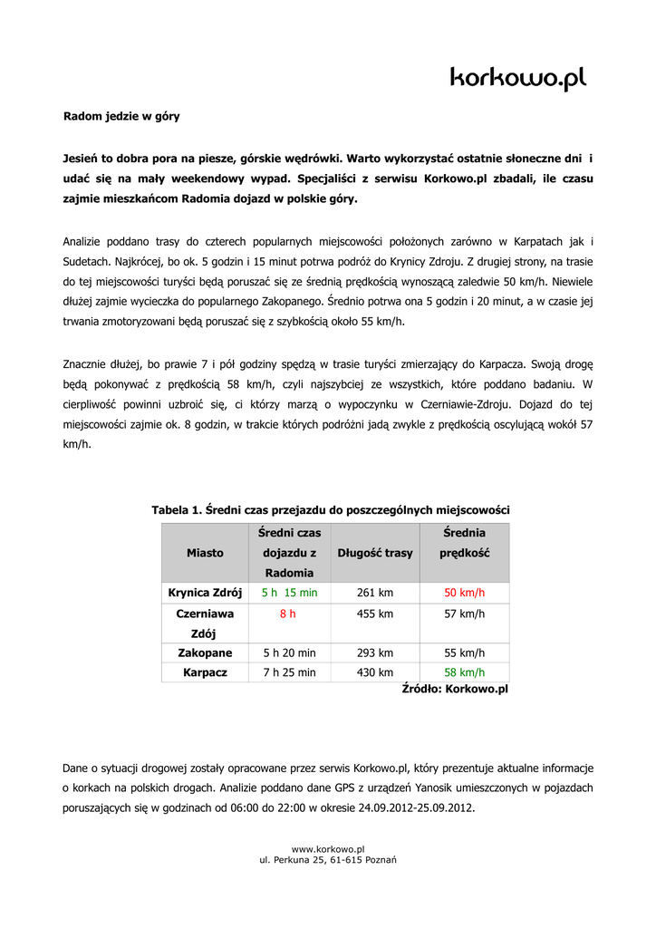 Radom jedzie w góry Jesień to dobra pora na piesze, górskie wędrówki. Warto wykorzystać ostatnie słoneczne dni i udać się na mały weekendowy wypad. Specjaliści z serwisu Korkowo.pl zbadali, ile czasu zajmie mieszkańcom Radomia dojazd w polskie góry. Analizie poddano trasy do czterech popularnych miejscowości położonych zarówno w Karpatach jak i Sudetach. Najkrócej, bo ok. 5 godzin i 15 minut potrwa podróż do Krynicy Zdroju. Z drugiej strony, na trasie do tej miejscowości turyści będą poruszać się ze średnią prędkością wynoszącą zaledwie 50 km/h. Niewiele dłużej zajmie wycieczka do popularnego Zakopanego. Średnio potrwa ona 5 godzin i 20 minut, a w czasie jej trwania zmotoryzowani będą poruszać się z szybkością około 55 km/h. Znacznie dłużej, bo prawie 7 i pół godziny spędzą w trasie turyści zmierzający do Karpacza. Swoją drogę będą pokonywać z prędkością 58 km/h, czyli najszybciej ze wszystkich, które poddano badaniu. W cierpliwość powinni uzbroić się, ci którzy marzą o wypoczynku w Czerniawie-Zdroju. Dojazd do tej miejscowości zajmie ok. 8 godzin, w trakcie których podróżni jadą zwykle z prędkością oscylującą wokół 57 km/h. Tabela 1. Średni czas przejazdu do poszczególnych miejscowości Średni czas Miasto dojazdu z Średnia Długość trasy prędkość Radomia Krynica Zdrój 5 h 15 min 261 km 50 km/h Czerniawa 8h 455 km 57 km/h Zakopane 5 h 20 min 293 km 55 km/h Karpacz 7 h 25 min 430 km Zdój 58 km/h Źródło: Korkowo.pl Dane o sytuacji drogowej zostały opracowane przez serwis Korkowo.pl, który prezentuje aktualne informacje o korkach na polskich drogach. Analizie poddano dane GPS z urządzeń Yanosik umieszczonych w pojazdach poruszających się w godzinach od 06:00 do 22:00 w okresie 24.09.2012-25.09.2012. www.korkowo.pl ul. Perkuna 25, 61-615 Poznań ------------------------------Dystrybucja materiałów: Kinga Przybysz [email protected] kom./+48/ 519-181-900 www.korkowo.pl ul. Perkuna 25, 61-615 Poznań