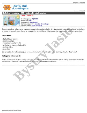 Informacje o produkcie Utworzono 06-03-2017 Haft krzyżykowy - 4M - zabawki edukacyjne Cena : 39,00 zł Nr katalogowy : BJ-0256 Producent : 4M Dostępność : Dostępny Stan magazynowy : poniżej średniego Średnia ocena : brak recenzji si o Zestaw zawiera informacje o podstawowych technikach haftu krzyżykowego oraz szczegółową instrukcję, projekty i materiały do wykonania eleganckiej torebki lub praktycznego etui na pióro i 4 modnych serwetek. Zawartość: ● ● ● ● ● 2 plastikowe kanwy, plastikowa igła, różnokolorowe kordonki, projekty do wykonania torebki, etui na pióro, serwetek. Ja ● Kategoria wiekowa: 8+ y Zawartość jest wystarczającą do wykonania jednej modnej torebki lub 1 etui na pióro, lub 4 serwetek. B ys tr Zestaw nieodpowiedni dla dzieci poniżej 3 roku życia z powodu zawartości małych elementów. Podczas zabawy zalecana obecność osoby dorosłej. Kolory i zawartość mogą się nieznacznie rożni od tych przedstawianych na zdjęciu. Wygenerowano w programie www.oscGold.com