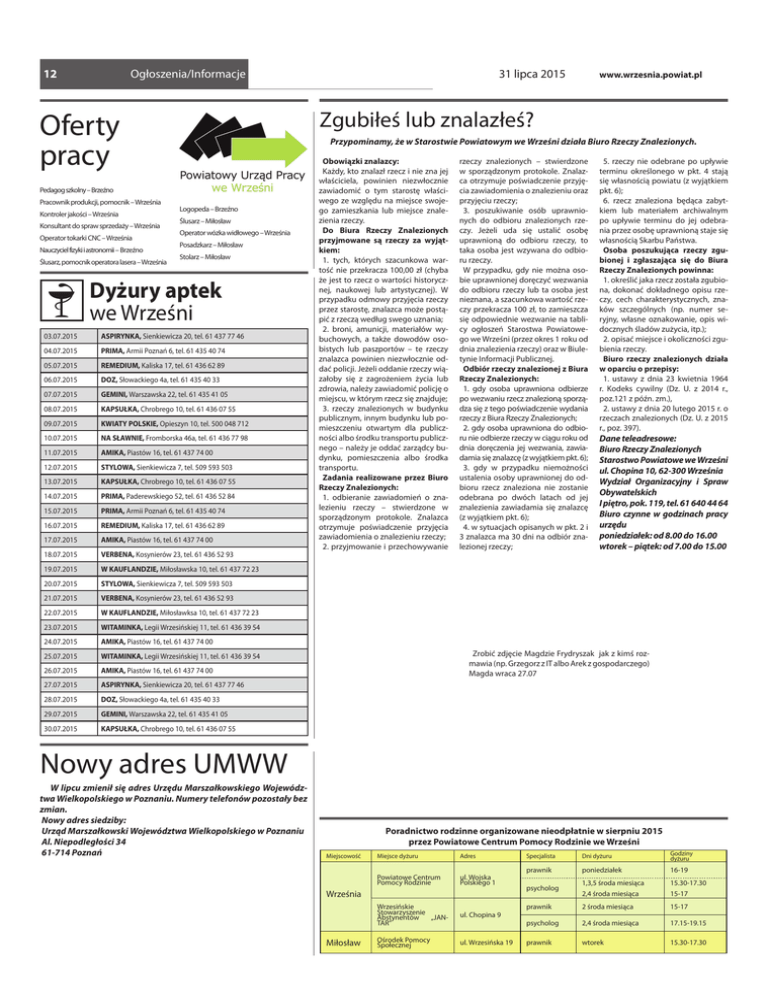 12 31 lipca 2015 Ogłoszenia/Informacje Zgubiłeś lub znalazłeś? Oferty pracy Przypominamy, że w Starostwie Powiatowym we Wrześni działa Biuro Rzeczy Znalezionych. Pedagog szkolny – Brzeźno Pracownik produkcji, pomocnik – Września Kontroler jakości – Września Konsultant do spraw sprzedaży – Września Operator tokarki CNC – Września Nauczyciel fizyki i astronomii – Brzeźno Ślusarz, pomocnik operatora lasera – Września www.wrzesnia.powiat.pl Logopeda – Brzeźno Ślusarz – Miłosław Operator wózka widłowego – Września Posadzkarz – Miłosław Stolarz – Miłosław Dyżury aptek we Wrześni 03.07.2015 ASPIRYNKA, Sienkiewicza 20, tel. 61 437 77 46 04.07.2015 PRIMA, Armii Poznań 6, tel. 61 435 40 74 05.07.2015 REMEDIUM, Kaliska 17, tel. 61 436 62 89 06.07.2015 DOZ, Słowackiego 4a, tel. 61 435 40 33 07.07.2015 GEMINI, Warszawska 22, tel. 61 435 41 05 08.07.2015 KAPSUŁKA, Chrobrego 10, tel. 61 436 07 55 09.07.2015 KWIATY POLSKIE, Opieszyn 10, tel. 500 048 712 10.07.2015 NA SŁAWNIE, Fromborska 46a, tel. 61 436 77 98 11.07.2015 AMIKA, Piastów 16, tel. 61 437 74 00 12.07.2015 STYLOWA, Sienkiewicza 7, tel. 509 593 503 13.07.2015 KAPSUŁKA, Chrobrego 10, tel. 61 436 07 55 14.07.2015 PRIMA, Paderewskiego 52, tel. 61 436 52 84 15.07.2015 PRIMA, Armii Poznań 6, tel. 61 435 40 74 16.07.2015 REMEDIUM, Kaliska 17, tel. 61 436 62 89 17.07.2015 AMIKA, Piastów 16, tel. 61 437 74 00 18.07.2015 VERBENA, Kosynierów 23, tel. 61 436 52 93 19.07.2015 W KAUFLANDZIE, Miłosławska 10, tel. 61 437 72 23 20.07.2015 STYLOWA, Sienkiewicza 7, tel. 509 593 503 21.07.2015 VERBENA, Kosynierów 23, tel. 61 436 52 93 22.07.2015 W KAUFLANDZIE, Miłosławksa 10, tel. 61 437 72 23 23.07.2015 WITAMINKA, Legii Wrzesińskiej 11, tel. 61 436 39 54 24.07.2015 AMIKA, Piastów 16, tel. 61 437 74 00 25.07.2015 WITAMINKA, Legii Wrzesińskiej 11, tel. 61 436 39 54 26.07.2015 AMIKA, Piastów 16, tel. 61 437 74 00 27.07.2015 ASPIRYNKA, Sienkiewicza 20, tel. 61 437 77 46 28.07.2015 DOZ, Słowackiego 4a, tel. 61 435 40 33 29.07.2015 GEMINI, Warszawska 22, tel. 61 435 41 05 30.07.2015 KAPSUŁKA, Chrobrego 10, tel. 61 436 07 55 Obowiązki znalazcy: Każdy, kto znalazł rzecz i nie zna jej właściciela, powinien niezwłocznie zawiadomić o tym starostę właściwego ze względu na miejsce swojego zamieszkania lub miejsce znalezienia rzeczy. Do Biura Rzeczy Znalezionych przyjmowane są rzeczy za wyjątkiem: 1. tych, których szacunkowa wartość nie przekracza 100,00 zł (chyba że jest to rzecz o wartości historycznej, naukowej lub artystycznej). W przypadku odmowy przyjęcia rzeczy przez starostę, znalazca może postąpić z rzeczą według swego uznania; 2. broni, amunicji, materiałów wybuchowych, a także dowodów osobistych lub paszportów – te rzeczy znalazca powinien niezwłocznie oddać policji. Jeżeli oddanie rzeczy wiązałoby się z zagrożeniem życia lub zdrowia, należy zawiadomić policję o miejscu, w którym rzecz się znajduje; 3. rzeczy znalezionych w budynku publicznym, innym budynku lub pomieszczeniu otwartym dla publiczności albo środku transportu publicznego – należy je oddać zarządcy budynku, pomieszczenia albo środka transportu. Zadania realizowane przez Biuro Rzeczy Znalezionych: 1. odbieranie zawiadomień o znalezieniu rzeczy – stwierdzone w sporządzonym protokole. Znalazca otrzymuje poświadczenie przyjęcia zawiadomienia o znalezieniu rzeczy; 2. przyjmowanie i przechowywanie rzeczy znalezionych – stwierdzone w sporządzonym protokole. Znalazca otrzymuje poświadczenie przyjęcia zawiadomienia o znalezieniu oraz przyjęciu rzeczy; 3. poszukiwanie osób uprawnionych do odbioru znalezionych rzeczy. Jeżeli uda się ustalić osobę uprawnioną do odbioru rzeczy, to taka osoba jest wzywana do odbioru rzeczy. W przypadku, gdy nie można osobie uprawnionej doręczyć wezwania do odbioru rzeczy lub ta osoba jest nieznana, a szacunkowa wartość rzeczy przekracza 100 zł, to zamieszcza się odpowiednie wezwanie na tablicy ogłoszeń Starostwa Powiatowego we Wrześni (przez okres 1 roku od dnia znalezienia rzeczy) oraz w Biuletynie Informacji Publicznej. Odbiór rzeczy znalezionej z Biura Rzeczy Znalezionych: 1. gdy osoba uprawniona odbierze po wezwaniu rzecz znalezioną sporządza się z tego poświadczenie wydania rzeczy z Biura Rzeczy Znalezionych; 2. gdy osoba uprawniona do odbioru nie odbierze rzeczy w ciągu roku od dnia doręczenia jej wezwania, zawiadamia się znalazcę (z wyjątkiem pkt. 6); 3. gdy w przypadku niemożności ustalenia osoby uprawnionej do odbioru rzecz znaleziona nie zostanie odebrana po dwóch latach od jej znalezienia zawiadamia się znalazcę (z wyjątkiem pkt. 6); 4. w sytuacjach opisanych w pkt. 2 i 3 znalazca ma 30 dni na odbiór znalezionej rzeczy; 5. rzeczy nie odebrane po upływie terminu określonego w pkt. 4 stają się własnością powiatu (z wyjątkiem pkt. 6); 6. rzecz znaleziona będąca zabytkiem lub materiałem archiwalnym po upływie terminu do jej odebrania przez osobę uprawnioną staje się własnością Skarbu Państwa. Osoba poszukująca rzeczy zgubionej i zgłaszająca się do Biura Rzeczy Znalezionych powinna: 1. określić jaka rzecz została zgubiona, dokonać dokładnego opisu rzeczy, cech charakterystycznych, znaków szczególnych (np. numer seryjny, własne oznakowanie, opis widocznych śladów zużycia, itp.); 2. opisać miejsce i okoliczności zgubienia rzeczy. Biuro rzeczy znalezionych działa w oparciu o przepisy: 1. ustawy z dnia 23 kwietnia 1964 r. Kodeks cywilny (Dz. U. z 2014 r., poz.121 z późn. zm.), 2. ustawy z dnia 20 lutego 2015 r. o rzeczach znalezionych (Dz. U. z 2015 r., poz. 397). Dane teleadresowe: Biuro Rzeczy Znalezionych Starostwo Powiatowe we Wrześni ul. Chopina 10, 62-300 Września Wydział Organizacyjny i Spraw Obywatelskich I piętro, pok. 119, tel. 61 640 44 64 Biuro czynne w godzinach pracy urzędu poniedziałek: od 8.00 do 16.00 wtorek – piątek: od 7.00 do 15.00 Zrobić zd
