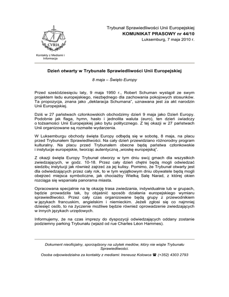 Trybunał Sprawiedliwości Unii Europejskiej KOMUNIKAT PRASOWY nr 44/10 Luksemburg, 7 maja 2010 r. Kontakty z Mediami i Informacja Dzień otwarty w Trybunale Sprawiedliwości Unii Europejskiej 8 maja – Święto Europy Przed sześćdziesięciu laty, 9 maja 1950 r., Robert Schuman wystąpił ze swym projektem ładu europejskiego, niezbędnego dla zachowania pokojowych stosunków. Ta propozycja, znana jako „deklaracja Schumana”, uznawana jest za akt narodzin Unii Europejskiej. Dziś w 27 państwach członkowskich obchodzimy dzień 9 maja jako Dzień Europy. Podobnie jak flaga, hymn, hasło i jednolita waluta (euro), ten dzień świadczy o tożsamości Unii Europejskiej jako bytu politycznego. Z tej okazji w 27 państwach Unii organizowane są rozmaite wydarzenia. W Luksemburgu obchody święta Europy odbędą się w sobotę, 8 maja, na placu przed Trybunałem Sprawiedliwości. Na cały dzień przewidziano różnorodny program kulturalny. Na placu przed Trybunałem obecne będą państwa członkowskie i instytucje europejskie, tworząc autentyczną „wioskę europejską”. Z okazji święta Europy Trybunał otworzy w tym dniu swój gmach dla wszystkich zwiedzających, w godz. 10-18. Przez cały dzień chętni będą mogli odwiedzać siedzibę instytucji jak również zajrzeć za jej kulisy. Pomimo, że Trybunał otwarty jest dla odwiedzających przez cały rok, to w tym wyjątkowym dniu obywatele będą mogli obejrzeć miejsca symboliczne, jak chociażby Wielką Salę Narad, z której okien rozciąga się wspaniała panorama miasta. Opracowana specjalnie na tę okazję trasa zwiedzania, indywidualnie lub w grupach, będzie prowadziła tak, by objaśnić sposób działania europejskiego wymiaru sprawiedliwości. Przez cały czas organizowane będą grupy z przewodnikiem w językach francuskim, angielskim i niemieckim. Jeżeli zgłosi się co najmniej dziesięć osób, to na życzenie możliwe będzie również oprowadzenie zwiedzających w innych językach urzędowych. Informujemy, że na czas imprezy do dyspozycji odwiedzających oddany zostanie podziemny parking Trybunału (wjazd od rue Charles Léon Hammes). Dokument nieoficjalny, sporządzony na użytek mediów, który nie wiąże Trybunału Sprawiedliwości. Osoba odpowiedzialna za kontakty z mediami: Ireneusz Kolowca (+352) 4303 2793