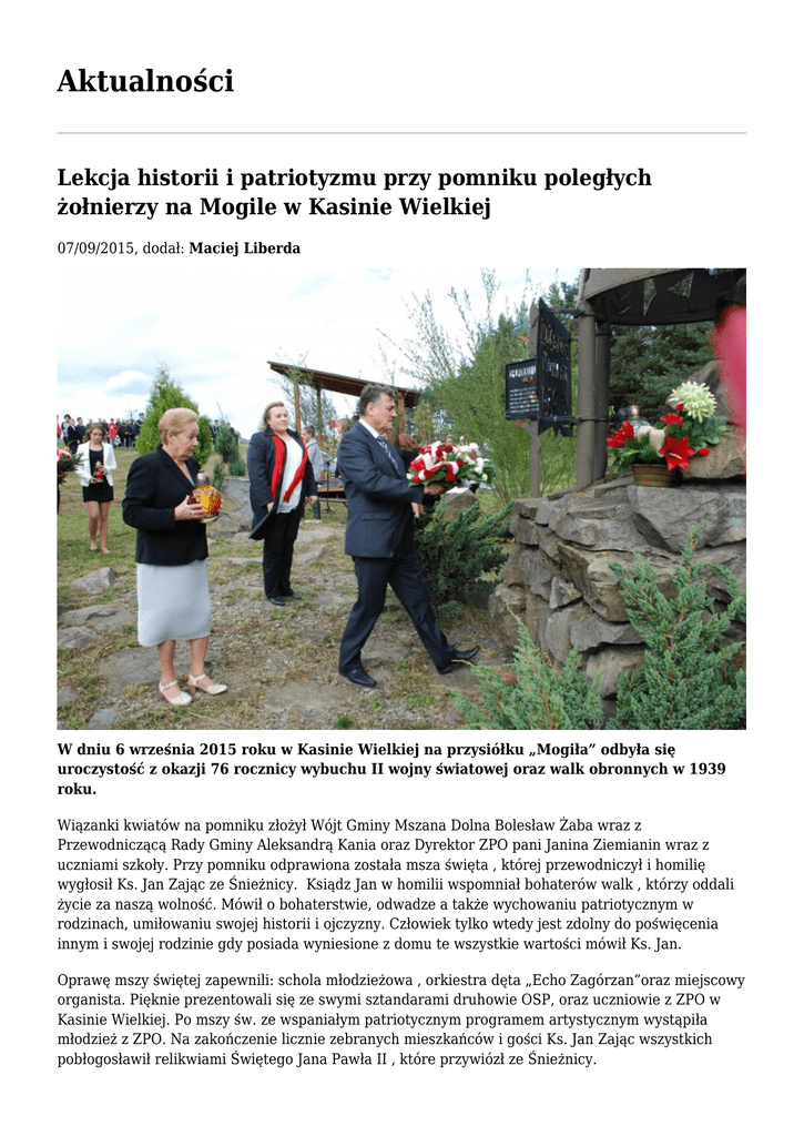 Aktualności Lekcja historii i patriotyzmu przy pomniku poległych żołnierzy na Mogile w Kasinie Wielkiej 07/09/2015, dodał: Maciej Liberda W dniu 6 września 2015 roku w Kasinie Wielkiej na przysiółku „Mogiła” odbyła się uroczystość z okazji 76 rocznicy wybuchu II wojny światowej oraz walk obronnych w 1939 roku. Wiązanki kwiatów na pomniku złożył Wójt Gminy Mszana Dolna Bolesław Żaba wraz z Przewodniczącą Rady Gminy Aleksandrą Kania oraz Dyrektor ZPO pani Janina Ziemianin wraz z uczniami szkoły. Przy pomniku odprawiona została msza święta , której przewodniczył i homilię wygłosił Ks. Jan Zając ze Śnieżnicy. Ksiądz Jan w homilii wspomniał bohaterów walk , którzy oddali życie za naszą wolność. Mówił o bohaterstwie, odwadze a także wychowaniu patriotycznym w rodzinach, umiłowaniu swojej historii i ojczyzny. Człowiek tylko wtedy jest zdolny do poświęcenia innym i swojej rodzinie gdy posiada wyniesione z domu te wszystkie wartości mówił Ks. Jan. Oprawę mszy świętej zapewnili: schola młodzieżowa , orkiestra dęta „Echo Zagórzan”oraz miejscowy organista. Pięknie prezentowali się ze swymi sztandarami druhowie OSP, oraz uczniowie z ZPO w Kasinie Wielkiej. Po mszy św. ze wspaniałym patriotycznym programem artystycznym wystąpiła młodzież z ZPO. Na zakończenie licznie zebranych mieszkańców i gości Ks. Jan Zając wszystkich pobłogosławił relikwiami Świętego Jana Pawła II , które przywiózł ze Śnieżnicy. Wójt Gminy w swoim wystąpieniu w skrócie przypomniał przebieg walk obronnych na terenie Kasiny Wielkiej i ziemi mszańskiej oto co powiedział. Co roku w pierwszych dniach września obchodzimy rocznicę wybuchu II wojny światowej oraz walk obronnych naszej ojczyzny i na terenie ziemi zagórzańskiej. Dzisiaj obchodzimy już 76 rocznicę tego wydarzenia. Walki trwały od pierwszych dni września natomiast na naszym terenie walki miały miejsce w dniach 3-4 września 1939 roku. Najeźdźcy niemieccy od strony Słowacji wkroczyli na teren naszej Ojczyzny. Spotkali jednak bardzo duży opór zarówno ze strony naszego wojska 10 Brygady Kawalerii Pancernej dowodzonej przez płk. Stanisława Maczka, jak również ze strony ludności cywilnej, która nie chciała podporządkować się okupantowi. 10 Brygada Kawalerii Pancerno-Zmotoryzowanej wywodziła się z Rzeszowa gdzie posiadała macierzystą jednostkę i wchodziła w skład Armii “Kraków” jako szybki odwód reagowania. Oto kilka ważnych dat z tego okresu: 1 września 1939 roku Brygada walczyła w okolicach Myślenic i Dobczyc, aby nie dopuścić do wyjścia wroga z wąwozów górskich. 2 września 24 Pułk Ułanów i szwadron przeciwpancerny stacza zacięte walki z 2 niemiecką Dywizją Pancerną, walki toczyły się o wzgórze Wysoka koło Jordanowa. W nocy z 2-3 września Brygada wycofała się na północ od doliny Skawy, zamykając przejścia do Krzeczowa, Naprawy i Mszany Dolnej. 3 września toczył się całodniowy bój pod Jordanowem, w rejonie Krzeczowa i Mszany Dolnej. Zmasowany i heroiczny atak z różnych stron pozwolił zlikwidować włamanie uczynione przez Niemców. W dniu 3 września 1939 roku Niemcy wkraczając do wsi Olszówka mordują 13 osób wśród których są również mieszkańcy okolicznych wiosek. Biorą 12 zakładników, których na drugi dzień uwalniają . Podczas pacyfikacji wioski spalono 18 zabudowań , był to odwet za stawiany opór przez wojsko polskie oraz za udzielanie pomocy w walkach przez ludność cywilną. 4 września Brygada otrzymuje zadanie odwrotu nad Dunajec w kierunku Tarnowa. 24 Pułk Ułanów uderza na oddziały niemieckiej 4 Dywizji Lekkiej zmuszając je do wycofania się . Odebrano Niemcom dwa pasma wzgórz pod Kasiną Wielką i Mszaną Dolną. 4 września w Kasinie Wielkiej ginie 14 żołnierzy 24 pułku ułanów – siedmiu z nich wraz ze swoim dowódcą porucznikiem Zdzisławem Hemplem spoczywa na naszym parafialnym cmentarzu, pozostali zostali zabrani i pochowani w swoich rodzinnych miejscowościach. 5 września 10 Pułk Strzelców Konnych zaatakował duże siły niemieckie pod Pcimiem, oddziały 3 Dywizji Górskiej i 2 Dywizji Pancernej lecz wobec dużej przewagi wroga musiał się wycofać. Jakże wiele tragicznych i ważnych wydarzeń miało miejsce na terenie ziemi zagórzańskiej a także naszej wioski podczas II Wojny Światowej. To tu kilkadziesiąt metrów od pomnika przebiegała linia obrony w 1939 roku gdzie armia niemiecka od Słowacji atakowała nasz kraj. To w Kasinie i okolicy bohaterskie i zaciekłe walki z najeźdźcą powodowały ,że na tym terenie powstawały oddziały partyzanckie, które włączały się w czasie II wojny światowej do różnych akcji przeciwko okupantowi. Słynne na naszym terenie oddziały „Adama”, „Luboń” i „Wilk”, które w różny sposób utrudniały życie okupantowi. Wśród miejscowej ludności panowała duża solidarność z partyzantami udzielano im wszelakiej pomocy. Za taką pomoc sąsiednia wieś Porąbka i Gruszowiec zostały spalone, a śmierć poniosło 36 zakładników. W dniu 14 listopada 1943 r, w Kasinie Wielkiej ginie z rąk hitlerowskich 11 zakładników, była to zemsta hitlerowców za zastrzelenie w dniu 13 listopada przez partyzantów Michała Stefana Remera folksdojcza. Zakładnicy rozstrzelani zostali w zakolu rzeki Kasina naprzeciwko dawnego dworu i w pobliżu obecnego Ośrodka Zdrowia . W dniu 23 grudnia 1943 roku gestapo rozstrzelało kolejnych 8 zakładników młodych gimnazjalistów przywiezionych z więzienia z Nowego Sącza wśród nich byli Kaciki z Poręby Wielkiej, którzy zginęli w odwecie za akcje partyzantów i zastrzelenie w dniu 13 listopada sołtysa wsi Kasina Wielka. Ciała pomordowanych zarówno z pierwszej jak też drugiej egzekucji znajdują się na cmentarzu parafialnym w Mszanie Dolnej. Dzisiejsza msza święta w 76 rocznicę walk o ziemię zagórzańską i Kasinę Wielką przypomina nam te tragiczne dl