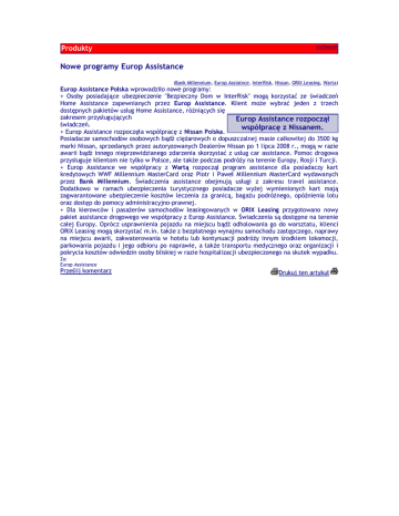 Produkty archiwum Nowe programy Europ Assistance (Bank Millennium, Europ Assiatnce, InterRisk, Nissan, ORIX Leasing, Warta) Europ Assistance Polska wprowadziło nowe programy: + Osoby posiadające ubezpieczenie "Bezpieczny Dom w InterRisk" mogą korzystać ze świadczeń Home Assistance zapewnianych przez Europ Assistance. Klient może wybrać jeden z trzech dostępnych pakietów usług Home Assistance, różniących się zakresem przysługujących Europ Assistance rozpoczął świadczeń. współpracę z Nissanem. + Europ Assistance rozpoczęła współpracę z Nissan Polska. Posiadacze samochodów osobowych bądź ciężarowych o dopuszczalnej masie całkowitej do 3500 kg marki Nissan, sprzedanych przez autoryzowanych Dealerów Nissan po 1 lipca 2008 r., mogą w razie awarii bądź innego nieprzewidzianego zdarzenia skorzystać z usług car assistance. Pomoc drogowa przysługuje klientom nie tylko w Polsce, ale także podczas podróży na terenie Europy, Rosji i Turcji. + Europ Assistance we współpracy z Wartą rozpoczął program assistance dla posiadaczy kart kredytowych WWF Millennium MasterCard oraz Piotr i Paweł Millennium MasterCard wydawanych przez Bank Millennium. Świadczenia assistance obejmują usługi z zakresu travel assistance. Dodatkowo w ramach ubezpieczenia turystycznego posiadacze wyżej wymienionych kart mają zagwarantowane ubezpieczenie kosztów leczenia za granicą, bagażu podróżnego, opóźnienia lotu oraz dostęp do pomocy administracyjno-prawnej. + Dla kierowców i pasażerów samochodów leasingowanych w ORIX Leasing przygotowano nowy pakiet assistance drogowego we współpracy z Europ Assistance. Świadczenia są dostępne na terenie całej Europy. Oprócz usprawnienia pojazdu na miejscu bądź odholowania go do warsztatu, klienci ORIX Leasing mogą skorzystać m.in. także z bezpłatnego wynajmu samochodu zastępczego, naprawy na miejscu awarii, zakwaterowania w hotelu lub kontynuacji podróży innym środkiem lokomocji, parkowania pojazdu i jego odbioru po naprawie, a także transportu medycznego oraz organizacji i pokrycia kosztów odwiedzin osoby bliskiej w razie hospitalizacji ubezpieczonego na skutek wypadku. Za: Europ Assistance Prześlij komentarz Drukuj ten artykuł