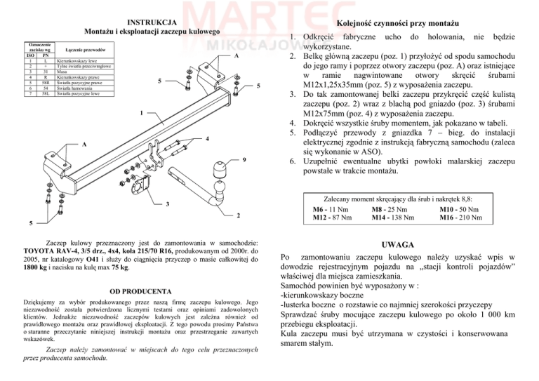INSTRUKCJA MontaŜu i eksploatacji zaczepu kulowego Oznaczenie zacisku wg ISO PN 1 L 2 + 3 31 4 R 5 58R 6 54 7 58L Kolejność czynności przy montaŜu Łączenie przewodów A Kierunkowskazy lewe Tylne światła przeciwmgłowe Masa Kierunkowskazy prawe Światła pozycyjne prawe Światła hamowania Światła pozycyjne lewe 5 5 1 4 A 9 3 2 5 Zaczep kulowy przeznaczony jest do zamontowania w samochodzie: TOYOTA RAV-4, 3/5 drz., 4x4, koła 215/70 R16, produkowanym od 2000r. do 2005, nr katalogowy O41 i słuŜy do ciągnięcia przyczep o masie całkowitej do 1800 kg i nacisku na kulę max 75 kg. OD PRODUCENTA Dziękujemy za wybór produkowanego przez naszą firmę zaczepu kulowego. Jego niezawodność została potwierdzona licznymi testami oraz opiniami zadowolonych klientów. JednakŜe niezawodność zaczepów kulowych jest zaleŜna równieŜ od prawidłowego montaŜu oraz prawidłowej eksploatacji. Z tego powodu prosimy Państwa o staranne przeczytanie niniejszej instrukcji montaŜu oraz przestrzeganie zawartych wskazówek. Zaczep naleŜy zamontować w miejscach do tego celu przeznaczonych przez producenta samochodu. 1. Odkręcić fabryczne ucho do holowania, nie będzie wykorzystane. 2. Belkę główną zaczepu (poz. 1) przyłoŜyć od spodu samochodu do jego ramy i poprzez otwory zaczepu (poz. A) oraz istniejące w ramie nagwintowane otwory skręcić śrubami M12x1,25x35mm (poz. 5) z wyposaŜenia zaczepu. 3. Do tak zamontowanej belki zaczepu przykręcić część kulistą zaczepu (poz. 2) wraz z blachą pod gniazdo (poz. 3) śrubami M12x75mm (poz. 4) z wyposaŜenia zaczepu. 4. Dokręcić wszystkie śruby momentem, jak pokazano w tabeli. 5. Podłączyć przewody z gniazdka 7 – bieg. do instalacji elektrycznej zgodnie z instrukcją fabryczną samochodu (zaleca się wykonanie w ASO). 6. Uzupełnić ewentualne ubytki powłoki malarskiej zaczepu powstałe w trakcie montaŜu. Zalecany moment skręcający dla śrub i nakrętek 8,8: M6 - 11 Nm M8 - 25 Nm M10 - 50 Nm M12 - 87 Nm M14 - 138 Nm M16 - 210 Nm UWAGA Po zamontowaniu zaczepu kulowego naleŜy uzyskać wpis w dowodzie rejestracyjnym pojazdu na „stacji kontroli pojazdów” właściwej dla miejsca zamieszkania. Samochód powinien być wyposaŜony w : -kierunkowskazy boczne -lusterka boczne o rozstawie co najmniej szerokości przyczepy Sprawdzać śruby mocujące zaczepu kulowego po około 1 000 km przebiegu eksploatacji. Kula zaczepu musi być utrzymana w czystości i konserwowana smarem stałym. PPUH AUTO-HAK Sp.J. WyposaŜenie zaczepu: Produkcja Zaczepów Kulowych Henryk & Zbigniew Nejman 76-200 SŁUPSK ul. Słoneczna 16K tel/fax (059) 8-414-414; 8-414-413 E-mail: [email protected] www. autohak.com.pl Zaczep kulowy bez wyposaŜenia elektrycznego O41 Klasa: A50-X Nr kat. Przeznaczony do zamontowania w samochodzie: Producent: TOYOTA Model: RAV-4 Typ: 3/5 drz., 4x4, koła 215/70 R16 produkowanego od 2000r. do 2005r. Dane techniczne: Wartość siły D : 8,95 kN maksymalna masa przyczepy: 1800 kg maksymalny nacisk na kulę: 75 kg Numer homologacji zgodnie z wytycznymi regulaminu EKG/ONZ 55.01: E20-55R-01 1250 KARTA GWARANCYJNA Producent udziela gwarancji niniejszą kartą gwarancyjną na okres 24 miesięcy licząc od dnia zakupu zaczepu kulowego do samochodu: TOYOTA RAV-4 3/5 drz., 4x4, koła 215/70 R16 produkowanego od 2000r. do 2005r. Data produkcji .............................. Data zakupu........................................... Zakres gwarancji obejmuje wyłącznie wady jakościowe wynikające z winy producenta. Gwarancja nie obejmuje natomiast uszkodzeń zawinionych przez nabywcę, wynikających z niewłaściwego montaŜu, uŜytkowania lub konserwacji, uszkodzeń mechanicznych, normalnego zuŜycia podczas eksploatacji itp. Gwarancja udzielona na zakupiony towar nie wyłącza, nie ogranicza ani nie zawiesza uprawnień kupującego wynikających z niezgodności towaru z umową. Reklamacje naleŜy zgłaszać w punkcie sprzedaŜy, składając jednocześnie kartę gwarancyjną. Usunięcie "wady" następuje po stwierdzeniu przez punkt sprzedaŜy wspólnie z producentem słuszności złoŜonej reklamacji. Reklamacja powinna być załatwiona w ciągu 14 dni od dnia uznania reklamacji. Karta gwarancyjna jest niewaŜna jeŜeli nie jest wypełniona i podpisana. Data zgłoszenia reklamacji: ................................................................... INFORMACJA WSTĘPNA Zaczep kulowy jest skonstruowany zgodnie z zasadami bezpieczeństwa ruchu drogowego. Zaczep kulowy jest elementem wpływającym na bezpieczeństwo jazdy i moŜe zostać zainstalowany wyłącznie przez personel wyspecjalizowany. Niedopuszczalne jest dokonywanie jakichkolwiek zmian w konstrukcji zaczepu. Powoduje to wygaśniecie dopuszczenia do stosowania. W przypadku obecności masy izolacyjnej lub osłony podwozia w miejscu przylegania zaczepu, naleŜy ją usunąć. Nieosłonięte miejsca karoserii oraz wywiercone otwory naleŜy pomalować farbą antykorozyjną. Informacjami wiąŜącymi odnośnie wartości obciąŜeń są dane podawane przez producenta samochodu, względnie wartości maksymalnej masy przyczepy oraz maksymalnego nacisku na kulę, przy czym wartości parametrów zaczepu kulowego nie mogą być przekroczone. Wzór do obliczania wartości siły D: Maks. masa przyczepy [kg] x Maks. masa samochodu [kg] Maks. masa przyczepy [kg] + Maks. masa samochodu [kg] X 9,81 = 1000 D [kN]
