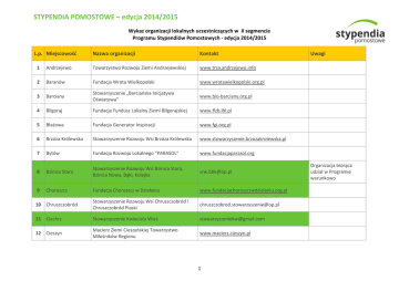 STYPENDIA POMOSTOWE – edycja 2014/2015 Wykaz organizacji lokalnych uczestniczących w II segmencie Programu Stypendiów Pomostowych - edycja 2014/2015 L.p. Miejscowość Nazwa organizacji Kontakt 1 Andrzejewo Towarzystwo Rozwoju Ziemi Andrzejewskiej www.trza.andrzejewo.info 2 Baranów Fundacja Wrota Wielkopolski www.wrotawielkopolski.org.pl 3 Barciany Stowarzyszenie „Barciańska Inicjatywa Oświatowa” www.bio-barciany.org.pl 4 Biłgoraj Fundacja Fundusz Lokalny Ziemi Biłgorajskiej www.flzb.lbl.pl 5 Błażowa Fundacja Generator Inspiracji www.fgi.org.pl 6 Brzóza Królewska Stowarzyszenie Rozwoju Wsi Brzóza Królewska www.stowarzyszenie.brzozakrolewska.pl 7 Bytów Fundacja Rozwoju Lokalnego "PARASOL" www.fundacjaparasol.org 8 Bzinica Stara Stowarzyszenie Rozwoju Wsi Bzinica Stara, Bzinica Nowa, Bąki, Kolejka [email protected] 9 Choroszcz Fundacja Choroszcz w Działaniu www.fundacjachoroszczwdzialaniu.org.pl 10 Chruszczobród Stowarzyszenie Rozwoju Wsi Chruszczobród i Chruszczobród Piaski [email protected] 11 Ciechrz Stowarzyszenie Kwiecista Wieś [email protected] 12 Cieszyn Macierz Ziemi Cieszyńskiej Towarzystwo Miłośników Regionu www.macierz.cieszyn.pl 1 Uwagi Organizacja biorąca udział w Programie warunkowo STYPENDIA POMOSTOWE – edycja 2014/2015 Wykaz organizacji lokalnych uczestniczących w II segmencie Programu Stypendiów Pomostowych - edycja 2014/2015 13 Człuchów Stowarzyszenie Wspierania Rozwoju Powiatu Człuchowskiego 14 Dąbrowice Stowarzyszenie Przyjaciół Dąbrowic 15 Dębno Stowarzyszenie Rozwoju Wsi Dębno www.stowdebno 16 Dubiecko Towarzystwo Przyjaciół Ziemi Dubieckiej www.tpzd.republika.pl 17 Dwikozy Stowarzyszenie Świat Wiedzy i Techniki "ŚWiT" [email protected] 18 Dziemiany Stowarzyszenie na Rzecz Rozwoju Gminy Dziemiany 19 Dzierzgowo Stowarzyszenie Wspierania Inicjatyw Społecznych Gminy Dzierzgowo „ARKA” www.stowarzyszeniearka.pl 20 Frombork Fromborski Fundusz Stypendialny www.ffsfrombork.cba.pl 21 Garnek Fundacja im. Edwarda, Jana, Józefiny Reszków www.reszke.pl 22 Głubczyce Stowarzyszenie Pożytku Publicznego im. B. Adamskiej Absolwentów I LO im. A. Mickiewicza www.absolwencilo.glubczyce.pl 23 Gołąb k/Puław Stowarzyszenie Mieszkańców Doliny Wisły 24 Górowo Iławeckie Grupa Nieformalna - Ochotnicza Straż Pożarna 25 Grzybów k/Słubic Fundacja Fundusz Lokalny Ziemi Płockiej "Młodzi www.mlodzirazem.pl Razem" 26 Ilkowice Stowarzyszenie Rozwoju Wsi Ilkowice www.stowarzyszenie.org.pl www.gorowoilaweckie.osp.org.pl 2 STYPENDIA POMOSTOWE – edycja 2014/2015 Wykaz organizacji lokalnych uczestniczących w II segmencie Programu Stypendiów Pomostowych - edycja 2014/2015 27 Iława Stowarzyszenie PRZYSTAŃ www.przystan.ilawa.pl 28 Iwkowa Stowarzyszenie Rozwoju i Promocji Gminy Iwkowa www.iwkowa.pl/stowarzyszenie 29 Jamy Fundacja na Rzecz Spacyfikowanej przez Hitlerowców Wsi Jamy 30 Janiszewko Fundacja Pokolenia www.fundacjapokolenia.pl 31 Jastków Towarzystwo Przyjaciół Ziemi Jastkowskiej www.tpzj.pl 32 Jeżowe Centrum Realizacji Inicjatyw ANIMUS w Jeżowem www.animusjezowe.pl 33 Jeżowe Niezależne Stowarzyszenie Inicjatyw Kulturalnych - "Pułap" [email protected] 34 Kamionka Nidzicki Fundusz Lokalny www.funduszlokalny.nidzica.pl 35 Kielce Stowarzyszenie Świętokrzyski Fundusz Lokalny www.funduszlokalny.kielce.pl 36 Kolbuszowa Regionalna Fundacja Rozwoju "Serce" www.fundacjaserce.org 37 Konin Towarzystwo Samorządowe [email protected] 38 Kościan Stowarzyszenie Oświatowe im. Dezyderego Chłapowskiego www.so.koscian.net 39 Kozarze k/ Ciechanowca Stowarzyszenie TUTOR www.stowarzyszenie-tutor.pl 3 Organizacja biorąca udział w Programie warunkowo STYPENDIA POMOSTOWE – edycja 2014/2015 Wykaz organizacji lokalnych uczestniczących w II segmencie Programu Stypendiów Pomostowych - edycja 2014/2015 40 Kwiatonowice Kwiatonowickie Stowarzyszenie HOMINI www.kwiatonowice.pl 41 Lasocice k/Leszna Fundacja Centrum Aktywności Twórczej www.fundacja-cat.pl 42 Lipnica Murowana Podgórskie Stowarzyszenie Kulturalno-Społeczne www.psks.eu 43 Lipusz Stowarzyszenie Lokalna Grupa Działania STOLEM www.lgdstolem.pl 44 Lipusz Stowarzyszenie na Rzecz Rozwoju Gminy Lipusz 45 Łącko Fundacja Stypendialna "Dzieło św. Kingi" 46 Łukta Fundacja Rozwoju Regionu Łukta www.frrl.org.pl 47 Międzychód Stowarzyszenie Nowy Międzychód www.nowymiedzychod.pl 48 Młynary Stowarzyszenie na Rzecz Dzieci i Młodzieży Gminy Młynary [email protected] 49 Muszyna Stowarzyszenie Przyjaciół Almanachu Muszyny www.almanachmuszyny.pl 50 Myszyniec Związek Stowarzyszeń "Kurpsie Razem" www.kurpsierazem.eu 51 Nakło Śląskie Fundacja "Dzieci Śląska im. Kai Mireckiej Ploss" www.dziecislaska.org 52 Nisko Lokalna Grupa Działania Stowarzyszenie „Partnerstwo dla Ziemi Niżańskiej” www.lgdnisko.pl 53 Odporyszów Fundacja Rozwoju Społecznego DEMOS www.demos.org.pl www.lipusz.org 4 Organizacja biorąca udział w Programie warunkowo STYPENDIA POMOSTOWE – edycja 2014/2015 Wykaz organizacji lokalnych uczestniczących w II segmencie Programu Stypendiów Pomostowych - edycja 2014/2015 54 Ogrodzieniec Lokalna Organizacja Społeczna 55 Olkusz Stowarzyszenie Dobroczynne Res Sacra Miser www.rsm.olkusz.pl 56 Pawłosiów Lokalna Grupa Działania Stowarzyszenie "Z Tradycją w Nowoczesność" www.ztradycjawnowoczesnosc.pl 57 Pierzchnica Fundacja Rozwoju Regionu Pierzchnica www.frrp.pl 58 Pyzdry Towarzystwo Kulturalne "Echo Pyzdr" www.echo.org.pl 59 Raba Wyżna Stowarzyszenie Oświatowe "Echo" http://www.soecho.rabawyzna.pl 60 Rdzawka Stowarzyszenie na Rzecz Rozwoju Kulturalnego Wsi Rdzawka www.rdzawka.rabka-net.pl 61 Rogi Stowarzyszenie Miłośników Wsi Rogi www.rogi.org.pl 62 Ruciane-Nida Stowarzyszenie Pomocy Dzieciom i Młodzieży www.spdim.pl 63 Samostrzel Stowarzyszenie Kobiet na Rzecz Środowiska Wiejskiego 64 Siecień Stowarzyszenie Mieszkańców Siecienia i Okolic na Rzecz Wspierania Aktywności Lokalnej 65 Skarżysko Kamienna Fundacja "Daj Szansę" 66 Skomlin Stowar