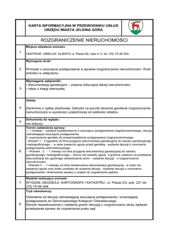 KARTA INFORMACYJNA W PRZEWODNIKU USŁUG URZĘDU MIASTA JELENIA GÓRA ROZGRANICZENIE NIERUCHOMOŚCI Miejsce składania wniosku: 1. CENTRUM OBSŁUGI KLIENTA ul. Ptasia 6A, sala nr 3, tel. (75) 75-46-354. Wymagane druki: 2. 3. Wniosek o wszczęcie postępowania w sprawie rozgraniczenia nieruchomości. Wzór wniosku w załączeniu. Wymagane załączniki: • dokumentacja geodezyjno – prawna dotycząca danej nieruchomości, • odpis z księgi wieczystej. Opłaty: 4. 5. 6. Zwolnione z opłaty skarbowej. Zaliczka na poczet zlecenia geodecie rozgraniczenia nieruchomości w wysokości uzależnionej od wielkości obiektu. Dokumenty do wglądu: nie dotyczy Termin załatwienia sprawy: 1. 1 miesiąc – wydanie postanowienia o wszczęciu postępowania rozgraniczeniowego, decyzji odmawiającej wszczęcie postępowania, 2. wyznaczenie geodety do przeprowadzenia postępowania rozgraniczeniowego - Wariant 1 - 2 tygodnie od dnia przyjęcia dokumentacji geodezyjnej do zasobu geodezyjnego i kartograficznego - w razie zawarcia ugody przed geodetą - wydanie decyzji o umorzeniu postępowania administracyjnego, – Wariant 2 - 1 miesiąc od dnia przyjęcia dokumentacji geodezyjnej do zasobu geodezyjnego i kartograficznego – strony nie zawarły ugody a granice ustalono na podstawie dokumentacji lub zgodnego oświadczenia stron – wydanie decyzji o rozgraniczeniu nieruchomości, - Wariant 3 – 1 miesiąc od dnia dostarczenia dokumentacji geodezyjnej - w razie nie zawarcia ugody oraz braku podstaw do wydania decyzji - wydanie decyzji o umorzeniu postępowania i skierowanie sprawy z urzędu do rozpatrzenia sądowi. Wydział realizujący wniosek: 7. WYDZIAŁ GEODEZJI, KARTOGRAFII I KATASTRU– ul. Ptasia 2/3, pok. 221 tel. (75) 75-46-394. Tryb odwoławczy: 8. Odwołanie od decyzji odmawiającej wszczęcia postępowania i umarzającej postępowanie do Samorządowego Kolegium Odwoławczego. Stronie niezadowolonej z ustalenia granic decyzją o rozgraniczeniu służy żądanie przekazania sprawy do rozpatrzenia przez sąd. 9. Opłata za odwołanie: Zwolnione z opłaty skarbowej. Podstawa prawna: 10. 11. • Prawo geodezyjne i kartograficzne z dnia 17 maja 1989r. (t.j., Dz. U. z 2016r. poz. 1629 ze zm.). • Kodeks postępowania administracyjnego z dnia 14 czerwca 1960r. ( t.j.,Dz. U z 2016 r. poz. 23 ze zm.). • Rozporządzenie Ministrów Spraw Wewnętrznych i Administracji oraz Rolnictwa i Gospodarki Żywnościowej z dnia 14 kwietnia 1999 roku w sprawie rozgraniczenia nieruchomości ( t.j., Dz. U. z 1999 r., nr 45, poz. 453 ) Uwagi: Brak data utworzenia: 1.02.2016 r. zatwierdzona przez: Naczelnika Wydziału Geodezji, Kartografi i Katastru