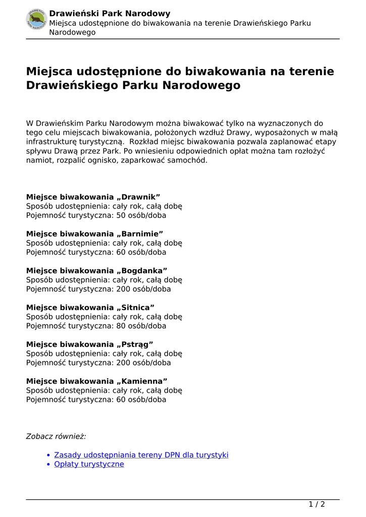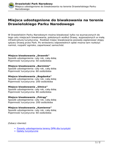 Drawieński Park Narodowy Miejsca udostępnione do biwakowania na terenie Drawieńskiego Parku Narodowego Miejsca udostępnione do biwakowania na terenie Drawieńskiego Parku Narodowego W Drawieńskim Parku Narodowym można biwakować tylko na wyznaczonych do tego celu miejscach biwakowania, położonych wzdłuż Drawy, wyposażonych w małą infrastrukturę turystyczną. Rozkład miejsc biwakowania pozwala zaplanować etapy spływu Drawą przez Park. Po wniesieniu odpowiednich opłat można tam rozłożyć namiot, rozpalić ognisko, zaparkować samochód. Miejsce biwakowania „Drawnik” Sposób udostępnienia: cały rok, całą dobę Pojemność turystyczna: 50 osób/doba Miejsce biwakowania „Barnimie” Sposób udostępnienia: cały rok, całą dobę Pojemność turystyczna: 60 osób/doba Miejsce biwakowania „Bogdanka” Sposób udostępnienia: cały rok, całą dobę Pojemność turystyczna: 200 osób/doba Miejsce biwakowania „Sitnica” Sposób udostępnienia: cały rok, całą dobę Pojemność turystyczna: 80 osób/doba Miejsce biwakowania „Pstrąg” Sposób udostępnienia: cały rok, całą dobę Pojemność turystyczna: 200 osób/doba Miejsce biwakowania „Kamienna” Sposób udostępnienia: cały rok, całą dobę Pojemność turystyczna: 60 osób/doba Zobacz również: Zasady udostępniania tereny DPN dla turystyki Opłaty turystyczne 1/2 Drawieński Park Narodowy Miejsca udostępnione do biwakowania na terenie Drawieńskiego Parku Narodowego Data wydruku: 06.03.2017 21:39:06 Adres URL: http://dpn.pl/miejsca-biwakowania 2/2 Powered by TCPDF (www.tcpdf.org)