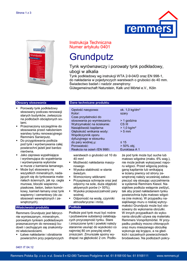 Strona 1 z 3 Instrukcja Techniczna Numer artykułu 0401 Grundputz Tynk wyrównawczy i porowaty tynk podkładowy, ubogi w alkalia Tynk podkładowy wg instrukcji WTA 2-9-04/D oraz EN 998-1, do nakładania w pojedynczych warstwach o grubości do 40 mm. Świadectwo badań i nadzór zewnętrzny: Gütegemeinschaft Naturstein, Kalk und Mörtel e.V., Köln Obszary stosowania Porowaty tynk podkładowy stosowany podczas renowacji starych budynków, zwłaszcza na podłożach obciążonych solami. Przeznaczony szczególnie do stosowania przed nałożeniem warstwy tynku renowacyjnego Remmers Sanierputz. Do przygotowania podłoża pod tynk i wyrównywania całej powierzchni jeżeli jest bardzo nierówna. Jako zaprawa wypełniająca i wyrównująca do wypełniania i wyrównywania wyłomów w murze z kamienia łamanego. Może być stosowany na wszystkich mineralnych, nadających się do tynkowania materiałach ściennych, jak np. cegła murowa, bloczki wapiennopiaskowe, beton, beton komórkowy, kamień łamany oraz tynk wapienny i cementowy (do zastosowań wewnętrznych i zewnętrznych). Dane techniczne produktu Gęstość nasypowa: Kolor: Czas przydatności do stosowania po wymieszaniu: Wytrzymałość na ściskanie: Nasiąkliwość kapilarna: Głębokość wnikania wody: Współczynnik oporu dyfuzyjnego w stosunku do pary wodnej µ: Porowatość: Reakcja na ogień (EN 998): warstwach o grubości od 10 do 40 mm! Możliwość nakładania maszynowego Wysoka stabilność w stanie świeżym. Wzmocniony włóknami Przyspiesza schnięcie oraz jest odporny na sole, duża objętość aktywnych porów (> 50%). Wysoka przepuszczalność pary wodnej. Odporność na wodę, czynniki atmosferyczne i mróz. Właściwości produktu Podłoże Remmers Grundputz jest fabrycznie wymieszanym, mineralnym, porowatym tynkiem podkładowym przeznaczonym do renowacji budowli i cechującym się znakomitymi właściwościami. Łatwe nakładanie i obrabianie powierzchni przy pojedynczych Podłoże pod tynk musi być nośne i pozbawione substancji osłabiających przyczepność tynku. Stare i zniszczone tynki i powłoki należy starannie usunąć do wysokości co najmniej 80 cm powyżej strefy zniszczeń. Zmurszałe spoiny wydrapać na głębokość 2 cm. Podło- ok. 1,0 kg/dm³ szary > 1 godzina CS III > 1,0 kg/m² > 5 mm ≤ 15 > 50% obj. Euroklasa A 1 że pod tynk może być suche lub matowo wilgotne (maks. 6% wag.), nie może jednak wykazywać naporu wilgoci. Przed wilgocią podciąganą kapilarnie lub wnikającą w ściany piwnicy od strony zewnętrznej należy wcześniej zabezpieczyć się stosując uszczelnienia w systemie Remmers Kiesol. Nasiąkliwe podłoża wstępnie zwilżyć, tak aby przed nakładaniem tynku powierzchnia była matowo wilgotna (nie mokra). W przypadku nasiąkliwego muru o niskiej wytrzymałości Grundputz może być stosowany do wykonania obrzutki. W innych przypadkach do wykonania obrzutki używa się materiału Remmers Vorspritzmörtel. W przypadku podłoży mocno chłonących oraz muru mieszanego obrzutkę wykonuje się kryjąco, a na gładkich i szczelnych powierzchniach brodawkowo. Na podłożach pokry- 0401 IT 04.12 Remmers Polska Sp. z o.o. ul. Sowia 8 62-080 Tarnowo Podgórne tel. 61 8168100 fax: 61 8168111 www.remmers.pl Strona 2 z 3 tych mineralnymi szlamami uszczelniającymi (np. Sulfatexschlämme, art. 0430) obrzutkę nakłada się kryjąco na ostatnią, jeszcze świeżą warstwę szlamu. Przyczepność obrzutki na gładkich i szczelnych powierzchniach można poprawić przez dodanie preparatu Remmers Haftfest (art. 0220). Po stwardnieniu obrzutki (24-48 godzin) można nakładać tynk. Sposób stosowania Wlać najpierw ok. 7,0 l wody do czystego pojemnika na zaprawę, wsypać 20 kg Remmers Grundputz i wymieszać za pomocą mieszarki/mieszadła śrubowego przez ok. 3 min., aż do uzyskania właściwej, jednorodnej konsystencji. Przy stosowaniu agregatów tynkarskich ustawić odpowiednią ilość podawanej wody w zależności od zastosowanego podajnika ślimakowego. Po przygotowaniu podłoża nakłada się zaprawę ręcznie lub za pomocą agregatu tynkarskiego. Tynk Remmers Grundputz nanosi się w warstwach o grubości od 1 do 4 cm. Przy czym najpierw nanosi się tynk jako warstwę kontaktową, pozostawia na krótki czas aby zaprawa lekko związała i uzupełnia do przewidzianej grubości tynku. Przy pracach renowacyjnych z późniejszym nakładaniem tynku renowacyjnego Remmers Sanierputz oraz w przypadku warstw wyrównawczych wymaga się aby minimalna grubość warstwy wynosiła 10 mm. Tynk o grubości ponad 40 mm należy wykonywać dwuwarstwowo. W przypadku bardzo nierównego i spękanego podłoża, należy nakładać tynk w dwóch warstwach aby uniknąć dużych różnic w grubości warstwy tynku co grozi powstawaniem rys i odspojeniem. Przy wielowarstwowym nakładaniu, pierwszej warstwie należy nadać szorstkość w celu zapewnienia dobrej przyczepności drugiej warstwy, np. grzebieniem tyn- karskim. Nakładanie drugiej warstwy następuje po wystarczającym wyschnięciu pierwszej warstwy, najwcześniej na drugi dzień. Jeżeli jednak pozostaje do dyspozycji jedynie krótki czas, można pracować w jednym cyklu, a mianowicie nakładać dwie warstwy "mokre na mokre" (mokre na wilgotne). Pomiędzy warstwami należy wtedy ułożyć tkaninę zbrojącą Remmers iQ-Tex 6,5/100 (art. 0236). W przypadku późniejszego wykonywania tynków renowacyjnych Remmers lub innych tynków, czas odczekania wynosi co najmniej 7 dni względnie 3 dni przy stosowaniu wkładki zbrojącej. Zewnętrznej powierzchni należy nadać szorstkość. Wskazówki Stężałej zaprawy nie wolno ponownie zarabiać dodając wody lub świeżej zaprawy. Nie stosować, gdy temperatura otaczającego powietrza, podłoża i materiału budowlanego wynosi mniej niż +5°C lub przekracza + 30°C. Podane parametry produktu zostały określone w warunkach laboratoryjnych, w temperaturze 20°C i wilgotności względnej powietrza 65%. Niższe t