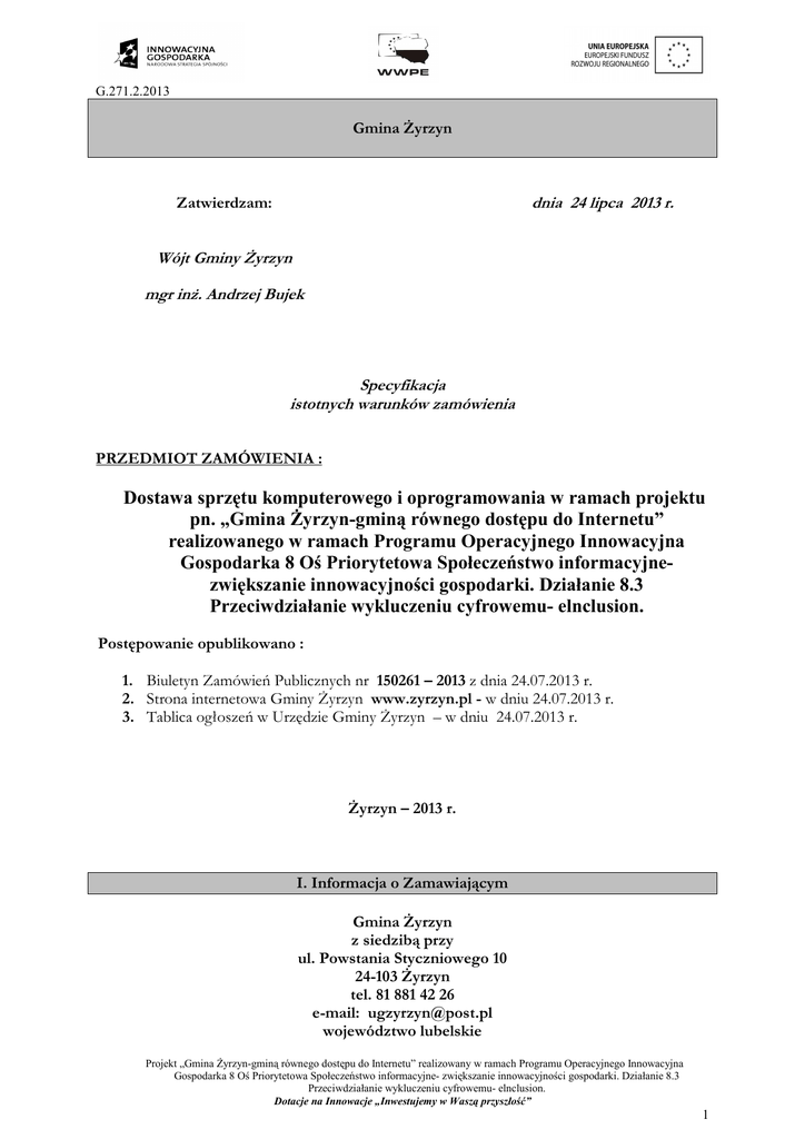 G.271.2.2013 Gmina Żyrzyn dnia 24 lipca 2013 r. Zatwierdzam: Wójt Gminy Żyrzyn mgr inż. Andrzej Bujek Specyfikacja istotnych warunków zamówienia PRZEDMIOT ZAMÓWIENIA : Dostawa sprzętu komputerowego i oprogramowania w ramach projektu pn. „Gmina Żyrzyn-gminą równego dostępu do Internetu” realizowanego w ramach Programu Operacyjnego Innowacyjna Gospodarka 8 Oś Priorytetowa Społeczeństwo informacyjnezwiększanie innowacyjności gospodarki. Działanie 8.3 Przeciwdziałanie wykluczeniu cyfrowemu- elnclusion. Postępowanie opublikowano : 1. Biuletyn Zamówień Publicznych nr 150261 – 2013 z dnia 24.07.2013 r. 2. Strona internetowa Gminy Żyrzyn www.zyrzyn.pl - w dniu 24.07.2013 r. 3. Tablica ogłoszeń w Urzędzie Gminy Żyrzyn – w dniu 24.07.2013 r. Żyrzyn – 2013 r. I. Informacja o Zamawiającym Gmina Żyrzyn z siedzibą przy ul. Powstania Styczniowego 10 24-103 Żyrzyn tel. 81 881 42 26 e-mail: [email protected] województwo lubelskie Projekt „Gmina Żyrzyn-gminą równego dostępu do Internetu” realizowany w ramach Programu Operacyjnego Innowacyjna Gospodarka 8 Oś Priorytetowa Społeczeństwo informacyjne- zwiększanie innowacyjności gospodarki. Działanie 8.3 Przeciwdziałanie wykluczeniu cyfrowemu- elnclusion. Dotacje na Innowacje „Inwestujemy w Waszą przyszłość” 1 G.271.2.2013 powiat puławski www.zyrzyn.pl II. Informacja Ogólne 1. Osobą uprawnioną do kontaktów z wykonawcami jest p. Beata Osiak – dyrektor Samorzadowej Administracji Placówek Oświatowych w Żyrzynie 2. Specyfikację istotnych warunków zamówienia, wraz z załącznikami w wersji elektronicznej (płyta CD) można odebrać u p. Beaty Osiak w siedzibie Zamawiającego, nieodpłatnie. 3. Oświadczenia, wnioski, zawiadomienia oraz informacje Zamawiający oraz wykonawcy przekazują faksem na numer jw. lub drogą elektroniczną na adres: [email protected]. Każda ze stron na żądanie drugiej niezwłocznie potwierdza fakt ich otrzymania. Zawsze dopuszczalna jest forma pisemna. 4. Zamawiający udzieli wyjaśnień treści SIWZ na wniosek wykonawcy nie później niż na 2 dni przed upływem terminu składania ofert – pod warunkiem, że wniosek o wyjaśnienie treści SIWZ wpłynął do zamawiającego nie później niż do końca dnia, w którym upływa połowa wyznaczonego terminu składania ofert. Treść wyjaśnień zostanie przesłana wykonawcom, którym przekazano SIWZ oraz zamieszczona na stronie internetowej Gminy. 5. W uzasadnionych przypadkach, przed upływem terminu składania ofert, Zamawiający może zmienić treść specyfikacji istotnych warunków zamówienia. W przypadku, gdy jest niezbędny dodatkowy czas na wprowadzenie zmian w ofertach, Zamawiający przedłuży termin składania ofert i poinformuje o tym wykonawców, którym przekazano SIWZ oraz zamieści informację na stronie internetowej. Przedłużenie terminu składania ofert nie wpływa na bieg terminu składania wniosków, o których mowa w ust. 3. 6. Zamawiający nie dopuszcza składania ofert częściowych. 7. Zamawiający nie dopuszcza składania ofert wariantowych. 8. Zamawiający nie przewiduje wyboru oferty najkorzystniejszej z użyciem aukcji elektronicznej. 9. Zamawiający nie przewiduje możliwość udzielenia zamówień uzupełniających zgodnie z art. 67 ust. 1 pkt. 6 ustawy P.z.p. 10. Przedmiotem zamówienia nie jest zawarcie umowy ramowej. 11. W toku badania i oceny ofert Zamawiający może żądać od Wykonawców wyjaśnień dotyczących treści złożonej oferty. III. Tryb udzielenia zamówienia Do udzielenia zamówienia stosuje się przepisy ustawy z dnia 29 stycznia 2004 r. - Prawo zamówień publicznych (Dz. U. z 2010 r. Nr 113, poz. 759 ze zmianami), zwanej dalej „ustawą” oraz w sprawach nieuregulowanych ustawą, przepisy ustawy - Kodeks cywilny. Postępowanie jest prowadzone w trybie przetargu nieograniczonego na podstawie art. 39 ustawy, dla zamówień o wartości nieprzekraczającej kwot określonych na podstawie art. 11 ust. 8 ustawy, tj. 5 000 000 euro. Projekt „Gmina Żyrzyn-gminą równego dostępu do Internetu” realizowany w ramach Programu Operacyjnego Innowacyjna Gospodarka 8 Oś Priorytetowa Społeczeństwo informacyjne- zwiększanie innowacyjności gospodarki. Działanie 8.3 Przeciwdziałanie wykluczeniu cyfrowemu- elnclusion. Dotacje na Innowacje „Inwestujemy w Waszą przyszłość” 2 G.271.2.2013 IV. Opis przedmiotu zamówienia. 1. Przepisy prawne regulujące podstawę wykonywania zamówienia: 1) ustawa z dnia 29 stycznia 2004 r. Prawo zamówień publicznych (Dz. U. z 2010 r. Nr 113, poz. 759 ze zmianami ); 2) przepisy i wytyczne branżowe. 2. Przedmiot zamówienia: Wspólny Słownik Zamówień (CPV) 30200000-1 Urządzenia komputerowe 30213100-6 Komputery przenośne 30213000-5 Komputery osobiste 48000000-8 Pakiety oprogramowania 48620000-0 Systemy operacyjne 30232110-8 Drukarki laserowe 3. Opis przedmiotu zamówienia: • Przedmiotem zamówienia jest dostawa sprzętu komputerowego i oprogramowania w ramach projektu pn. Dostawa sprzętu komputerowego i oprogramowania w ramach projektu pn. „Gmina Żyrzyn-gminą równego dostępu do Internetu” realizowanego w ramach Programu Operacyjnego Innowacyjna Gospodarka 8 Oś Priorytetowa Społeczeństwo informacyjne- zwiększanie innowacyjności gospodarki. Działanie 8.3 Przeciwdziałanie wykluczeniu cyfrowemu- elnclusion, zgodnie ze szczegółowym opisem zamówienia stanowiącym załącznik nr 1 do SIWZ. Przedmiot zamówienia zostanie dostarczony do 4 szkół z terenu Gminy Żyrzyn: • 1. Gimnazjum im. Jana Pawła II w Żyrzynie, ul. Tysiąclecia 143/1, 24-103 Żyrzyn - komputer przenośny typu A z oprogramowaniem dla beneficjentów- 30 szt. - komputer stacjonarny z oprogramowaniem dla jednostki podległej- 12 szt. - komputer przenośny typu B z oprogramowaniem dla jednostki podległej- 3 szt. - urządzenie wielofunkcyjne (drukarka ze skanerem)- 1 szt. 2. Szkoła Podstawowa im. A. Mickiewicza w Żyrzynie, ul. Tysiąclecia 