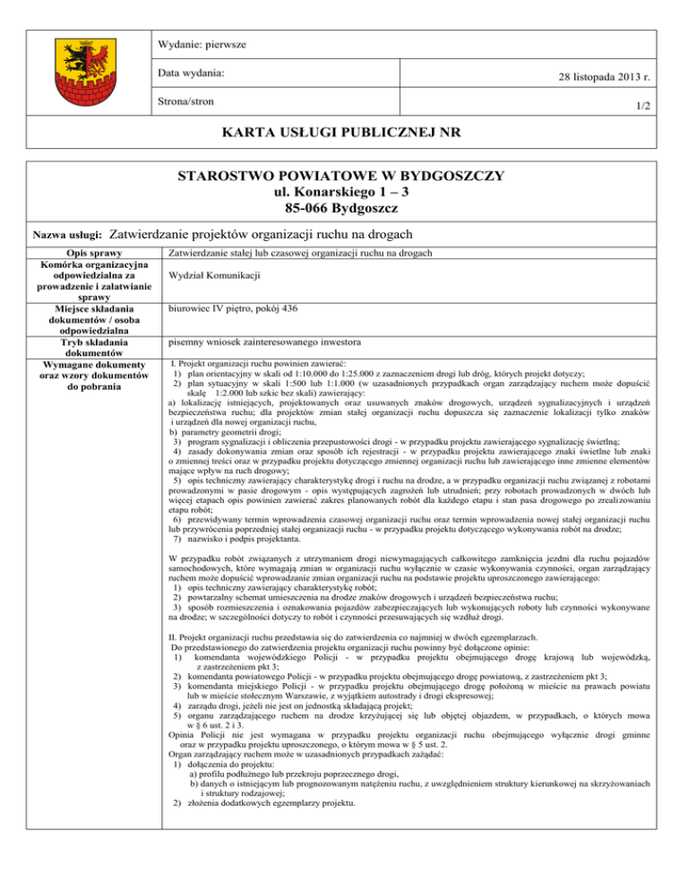 Wydanie: pierwsze Data wydania: Strona/stron 28 listopada 2013 r. 1/2 KARTA USŁUGI PUBLICZNEJ NR STAROSTWO POWIATOWE W BYDGOSZCZY ul. Konarskiego 1 – 3 85-066 Bydgoszcz Nazwa usługi: Zatwierdzanie projektów organizacji ruchu na drogach Opis sprawy Komórka organizacyjna odpowiedzialna za prowadzenie i załatwianie sprawy Miejsce składania dokumentów / osoba odpowiedzialna Tryb składania dokumentów Wymagane dokumenty oraz wzory dokumentów do pobrania Zatwierdzanie stałej lub czasowej organizacji ruchu na drogach Wydział Komunikacji biurowiec IV piętro, pokój 436 pisemny wniosek zainteresowanego inwestora I. Projekt organizacji ruchu powinien zawierać: 1) plan orientacyjny w skali od 1:10.000 do 1:25.000 z zaznaczeniem drogi lub dróg, których projekt dotyczy; 2) plan sytuacyjny w skali 1:500 lub 1:1.000 (w uzasadnionych przypadkach organ zarządzający ruchem może dopuścić skalę 1:2.000 lub szkic bez skali) zawierający: a) l a) lokalizację istniejących, projektowanych oraz usuwanych znaków drogowych, urządzeń sygnalizacyjnych i urządzeń bezpieczeństwa ruchu; dla projektów zmian stałej organizacji ruchu dopuszcza się zaznaczenie lokalizacji tylko znaków i urządzeń dla nowej organizacji ruchu, b) b) parametry geometrii drogi; 3) program sygnalizacji i obliczenia przepustowości drogi - w przypadku projektu zawierającego sygnalizację świetlną; 4) zasady dokonywania zmian oraz sposób ich rejestracji - w przypadku projektu zawierającego znaki świetlne lub znaki o zmiennej treści oraz w przypadku projektu dotyczącego zmiennej organizacji ruchu lub zawierającego inne zmienne elementów mające wpływ na ruch drogowy; 5) opis techniczny zawierający charakterystykę drogi i ruchu na drodze, a w przypadku organizacji ruchu związanej z robotami prowadzonymi w pasie drogowym - opis występujących zagrożeń lub utrudnień; przy robotach prowadzonych w dwóch lub więcej etapach opis powinien zawierać zakres planowanych robót dla każdego etapu i stan pasa drogowego po zrealizowaniu etapu robót; 6) przewidywany termin wprowadzenia czasowej organizacji ruchu oraz termin wprowadzenia nowej stałej organizacji ruchu lub przywrócenia poprzedniej stałej organizacji ruchu - w przypadku projektu dotyczącego wykonywania robót na drodze; 7) nazwisko i podpis projektanta. W przypadku robót związanych z utrzymaniem drogi niewymagających całkowitego zamknięcia jezdni dla ruchu pojazdów samochodowych, które wymagają zmian w organizacji ruchu wyłącznie w czasie wykonywania czynności, organ zarządzający ruchem może dopuścić wprowadzanie zmian organizacji ruchu na podstawie projektu uproszczonego zawierającego: 1) opis techniczny zawierający charakterystykę robót; 2) powtarzalny schemat umieszczenia na drodze znaków drogowych i urządzeń bezpieczeństwa ruchu; 3) sposób rozmieszczenia i oznakowania pojazdów zabezpieczających lub wykonujących roboty lub czynności wykonywane na drodze; w szczególności dotyczy to robót i czynności przesuwających się wzdłuż drogi. a) b) II. Projekt organizacji ruchu przedstawia się do zatwierdzenia co najmniej w dwóch egzemplarzach. Do przedstawionego do zatwierdzenia projektu organizacji ruchu powinny być dołączone opinie: 1) komendanta wojewódzkiego Policji - w przypadku projektu obejmującego drogę krajową lub wojewódzką, z zastrzeżeniem pkt 3; 2) komendanta powiatowego Policji - w przypadku projektu obejmującego drogę powiatową, z zastrzeżeniem pkt 3; 3) komendanta miejskiego Policji - w przypadku projektu obejmującego drogę położoną w mieście na prawach powiatu lub w mieście stołecznym Warszawie, z wyjątkiem autostrady i drogi ekspresowej; 4) zarządu drogi, jeżeli nie jest on jednostką składającą projekt; 5) organu zarządzającego ruchem na drodze krzyżującej się lub objętej objazdem, w przypadkach, o których mowa w § 6 ust. 2 i 3. Opinia Policji nie jest wymagana w przypadku projektu organizacji ruchu obejmującego wyłącznie drogi gminne oraz w przypadku projektu uproszczonego, o którym mowa w § 5 ust. 2. Organ zarządzający ruchem może w uzasadnionych przypadkach zażądać: 1) dołączenia do projektu: a) profilu podłużnego lub przekroju poprzecznego drogi, b) danych o istniejącym lub prognozowanym natężeniu ruchu, z uwzględnieniem struktury kierunkowej na skrzyżowaniach i struktury rodzajowej; 2) złożenia dodatkowych egzemplarzy projektu. Wydanie: pierwsze Data wydania: 28 listopada 2013 r. Strona/stron Kogo dotyczy 2/2 Projekt organizacji ruchu może przedstawić do zatwierdzenia: 1) zarząd drogi; 2) organ zarządzający ruchem; 3) inwestor lub jednostka, o której mowa w § 11 pkt 1-6 rozporządzenia – ( Dz.U z 2003r., nr 177, poz.1729), 4) osoba realizująca zamówienie jednostek, o których mowa w pkt 1-3. Termin i sposób załatwienia sprawy Podstawa prawna bez zbędnej zwłoki, zatwierdzenie projektu kończy sprawę Ewentualne opłaty Tryb odwoławczy Odwołanie na decyzję wnosi się do Samorządowego Kolegium Odwoławczego w Bydgoszczy za pośrednictwem Starosty Bydgoskiego w terminie 14 dni od dnia doręczenia decyzji stronie. Informacje dodatkowe Art.10 ustawy z dnia 20 czerwca 1997r. Prawo o ruchu drogowym ( Dz. U. z 2012r. , poz. 1137 z późn. zm.), Rozporządzenie Ministra Infrastruktury z dnia 23 września 2003r. w sprawie szczegółowych warunków zarządzania ruchem na drogach oraz wykonywaniem nadzoru nad tym zarządzaniem – ( Dz.U z 2003r., nr 177, poz.1729)