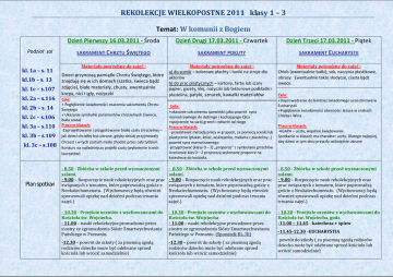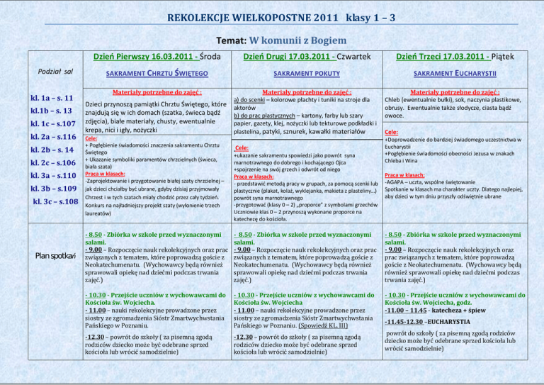 REKOLEKCJE WIELKOPOSTNE 2011 klasy 1 – 3 Temat: W komunii z Bogiem Podział sal kl. 1a – s. 11 kl.1b – s. 13 kl. 1c – s.107 kl. 2a – s.116 kl. 2b – s. 14 kl. 2c – s.106 kl. 3a – s.110 kl. 3b – s.109 kl. 3c – s.108 Plan spotkań Dzień Pierwszy 16.03.2011 - Środa Dzień Drugi 17.03.2011 - Czwartek Dzień Trzeci 17.03.2011 - Piątek SAKRAMENT CHRZTU ŚWIĘTEGO SAKRAMENT POKUTY SAKRAMENT EUCHARYSTII Materiały potrzebne do zajęć : Materiały potrzebne do zajęć : a) do scenki – kolorowe płachty i tuniki na stroje dla aktorów b) do prac plastycznych – kartony, farby lub szary papier, gazety, klej, nożyczki lub tekturowe podkładki i plastelina, patyki, sznurek, kawałki materiałów Dzieci przynoszą pamiątki Chrztu Świętego, które znajdują się w ich domach (szatka, świeca bądź zdjęcia), białe materiały, chusty, ewentualnie krepa, nici i igły, nożyczki Cele: + Pogłębienie świadomości znaczenia sakramentu Chrztu Świętego + Ukazanie symboliki paramentów chrzcielnych (świeca, biała szata) Praca w klasach: -Zaprojektowanie i przygotowanie białej szaty chrzcielnej – jak dzieci chciałby być ubrane, gdyby dzisiaj przyjmowały Chrzest i w tych szatach miały chodzić przez cały tydzień. Konkurs na najładniejszy projekt szaty (wyłonienie trzech laureatów) Cele: +ukazanie sakramentu spowiedzi jako powrót syna marnotrawnego do dobrego i kochającego Ojca +spojrzenie na swój grzech i odwrót od niego Praca w klasach: - przedstawić metodą pracy w grupach, za pomocą scenki lub plastycznie (plakat, kolaż, wyklejanka, makieta z plasteliny…) powrót syna marnotrawnego -przygotować (klasy 0 – 2) „proporce” z symbolami grzechów Uczniowie klas 0 – 2 przynoszą wykonane proporce na katechezę do kościoła. Materiały potrzebne do zajęć : Chleb (ewentualnie bułki), sok, naczynia plastikowe, obrusy. Ewentualnie także słodycze, ciasta bądź owoce. Cele: +Doprowadzenie do bardziej świadomego uczestnictwa w Eucharystii +Pogłębienie świadomości obecności Jezusa w znakach Chleba i Wina Praca w klasach: -AGAPA – uczta, wspólne świętowanie Spotkanie w klasach ma charakter uczty. Dlatego najlepiej, aby dzieci w tym dniu przyszły odświętnie ubrane - 8.50 - Zbiórka w szkole przed wyznaczonymi salami. - 9.00 – Rozpoczęcie nauk rekolekcyjnych oraz prac związanych z tematem, które poprowadzą goście z Neokatechumenatu. (Wychowawcy będą również sprawowali opiekę nad dziećmi podczas trwania zajęć.) - 8.50 - Zbiórka w szkole przed wyznaczonymi salami. - 9.00 – Rozpoczęcie nauk rekolekcyjnych oraz prac związanych z tematem, które poprowadzą goście z Neokatechumenatu. (Wychowawcy będą również sprawowali opiekę nad dziećmi podczas trwania zajęć.) - 8.50 - Zbiórka w szkole przed wyznaczonymi salami. - 9.00 – Rozpoczęcie nauk rekolekcyjnych oraz prac związanych z tematem, które poprowadzą goście z Neokatechumenatu. (Wychowawcy będą również sprawowali opiekę nad dziećmi podczas trwania zajęć.) - 10.30 - Przejście uczniów z wychowawcami do Kościoła św. Wojciecha. - 11.00 – nauki rekolekcyjne prowadzone przez siostry ze zgromadzenia Sióstr Zmartwychwstania Pańskiego w Poznaniu. - 10.30 - Przejście uczniów z wychowawcami do Kościoła św. Wojciecha - 11.00 – nauki rekolekcyjne prowadzone przez siostry ze zgromadzenia Sióstr Zmartwychwstania Pańskiego w Poznaniu. (Spowiedź KL. III) - 10.30 - Przejście uczniów z wychowawcami do Kościoła św. Wojciecha, godz. -11.00 – 11.45 - katecheza + śpiew -12.30 – powrót do szkoły ( za pisemną zgodą rodziców dziecko może być odebrane sprzed kościoła lub wrócić samodzielnie) -12.30 – powrót do szkoły ( za pisemną zgodą rodziców dziecko może być odebrane sprzed kościoła lub wrócić samodzielnie) -11.45-12.30 –EUCHARYSTIA powrót do szkoły ( za pisemną zgodą rodziców dziecko może być odebrane sprzed kościoła lub wrócić samodzielnie)