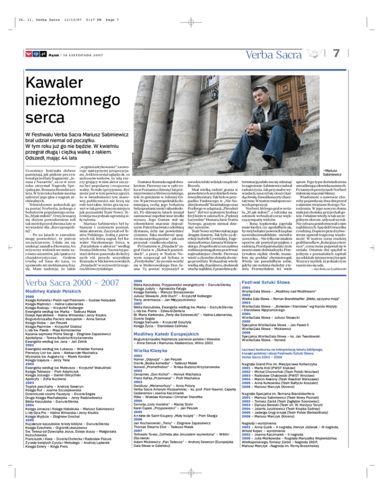 16. 11. Verba Sacra ◊ rp .pl 11/13/07 5:17 PM Page 7 7 Verba Sacra Pi ą te k | 1 6 l istopada 2007 Kawaler niez∏omnego serca W Festiwalu Verba Sacra Mariusz Sabiniewicz bra∏ udzia∏ niemal od początku. W tym roku już go nie będzie. W kwietniu przegra∏ d∏ugą i ciężką walkę z rakiem. Odszed∏, mając 44 lata Uczestnicy fest i walu dobrze pamiętają, jak pięknie pre z e ntowa∏ przed laty fragmenty „Jezusa z Nazaretu”, za co w 2001 roku otrzyma∏ Nagrodę Specjalną im. Romana Brandst a e ttera. W tym roku będzie można us∏yszeć jego g∏os z nagraƒ archiwalnych. Telewidzowie pokochali go za postać Norberta, jednego z bohaterów popularnego serialu „M jak mi∏ość”. O tej cieszącej się dużym powodzeniem roli tak mówi∏ przed dwoma laty w wywiadzie dla „Rzeczpospolitej”. – Po 20 latach w zawodzie mogę powiedzieć, że jest e m szczęściarzem. Uda∏o mi się uniknąć zaszufl a d kowania, bo reżyserzy widzieli we mnie zar ówno amantów, jak i post a c i e charakteryst yczne. Gra∏em t rochę od Sasa do Lasa, co s p rawia∏o mi niek∏amaną fra jdę. Mam nadzieję, że takie „wygimnastykowanie” zaowocuje nast ę p nymi propozycjami. Jeśli ten serial ogląda ok. 10 m i l i o n ów widzów, to si∏ą rzeczy grający w nim aktor zaczyna być popularny i rozpoznawalny. To mi∏e i przyjemne. Być może jest w tym pewien zgrzyt, że w świadomości tzw. masowej publiczności nie liczą się role tea t ralne, które gra się nawet w tak prestiżowym miejscu jak poznaƒski Teatr Nowy. Tel ewizja ma jednak ogromną si∏ę rażenia. Mariusz Sabiniewicz by∏ lubianym i cenionym poznaƒskim aktorem. Zaczyna∏ od Teatru Polskiego. Jedną z pierwszych ról, którą zagra∏, by∏ Kawaler Niez∏omnego Serca w „Paradoksie o aktorze” wed∏ug Denisa Diderota. Nazwa tej postaci dobrze pasowa∏a do ko l e jnych ról, przede wszystkim Konrada w Mickiewiczowskich „Dziadach” w reżyserii Grzegorza Mrówczyƒskiego. Verba Sacra 2000 – 2007 Modlitwy Katedr Po l s k i c h 2000 Księga Koheleta i Pieśƒ nad Pieśniami – Gustaw Holoubek Księga Mądrości – Halina Łabonarska Księga Rodzaju – Krzysztof Kolberger Ewangelia wed∏ug św. Marka – Tadeusz Malak Dzieje Apo stolskie – Halina Winiarska i Jerzy Kiszkis B o g u ro d z i ca albo Pacierz sta ro polski – Anna Seniuk Księga Hioba – Jan Peszek Księga Psa l m ów – Krzysztof Globisz L i sty św. Paw∏a – Maja Komorow s ka Kazania sejmowe Piotra Ska rgi – Zbigniew Zapasiewicz Apokalipsa – Teresa Budzisz-Krzyżanowska Ewangelia wed∏ug św. Jana – Jan Zelnik 2001 Ewangelia wed∏ug św. Łukasza – Wies∏aw Komasa Pierwszy List św. Jana – Aleksa n der Machalica Wyznania św. August y n a – Marek Kondrat Księga Izajasza – Jerzy Trela 2002 Ewangelia wed∏ug św. Mateusza – Krzysztof Wakuliƒski Księga Tobiasza – Piotr Adamczyk Księga Jozuego – Daniel Olbrychski Apokryfy – Zofia Kucówna 2003 Tryptyk paschalny – Andrzej Sewe r y n Księga Rut – Joanna Szczepkowska Dzienniczek siostry Faustyny – D o ro ta Segda Druga Księga Machabejska – Jerzy Radziwi∏owicz Biblia Kaszubska – D a n u ta Stenka 2004 Księga Jonasza i Księga Habakuka – Mariusz Sabiniewicz L i sty Ojca Pio – Halina Winiarska i Jerzy Kiszkis Księga Wyjścia – Zbigniew Grochal 2005 N a j starsze kaszubskie te ksty biblijne – D a n u ta Stenka Księga Ezechiela – O l g i e rd Łukaszewicz Św. Teresa od Dzieciątka Jezus, Dzieje duszy – Ma∏gorzata Kożuchowska Franciszek i Klara – D o ro ta Chotecka i Rados∏aw Pazura ˚ y woty świętych Cyryla i Metodego – Andrzej Lajborek Księga Estery – Kinga Preis <Mariusz Sabiniewicz Gustawa-Konrada zagra∏ dwukrotnie. Pierwszy raz w 1987 roku w Poznaniu i dziesięć lat później również u Mrówczyƒskiego, tyle że gościnnie w Jeleniej Górze. W pierwszym spektaklu dominującą cechą jego bohatera by∏a spontaniczność i si∏a m∏odości. Po dziesięciu latach musia∏ zastosować zupe∏nie inne środki wyrazu. Jego Gustaw sta∏ się cz∏owiekiem znacznie dojrzalszym. Patrzy∏ na świat z odrobiną dystansu, żeby nie powiedzieć cynizmu. Taka możliwość spojrzenia na jedną postać – jak sam przyzna∏ – rzadko się zdarza. Po Gustawie w „Dziadach” zagra∏ Gucia w „Ślubach panieƒskich”, a pracę w Teatrze Nowym rozpoczą∏ od Syfona w „Ferdydurke”, by po nim wcielić się w Molierowskiego Don Juana. Tę postać wyposaży∏ w uwodzicielski wdzięk i mądrość filozofa. Mia∏ wielką radość grania w prawdziwych arcydzie∏ach światowej literatury. Tak by∏o w przypadku Pankracego w „Nie-boskiej komedii” Krasiƒskiego oraz Porfirego w adaptacji „Zbrodni i kary”. By∏ też szalonym hrabią i fi rcykiem w zalotach w „Pięknej Lucyndzie” Hemara, hicie Teatru Nowego, granym niemal dziesięć sezonów. Teatr Nowy szybko sta∏ się jego drugim domem. Tak by∏o za dyrekcji Izabelli Cywiƒskiej, Eugeniusza Korina i Janusza Wiśniewskiego. Zespó∏ teatru i szczęśliwa rodzina pomagali mu przetrwać najtrudniejsze chwile. Pierwsza wieść o chorobie dotar∏a do niego przed laty. Wykaza∏ się wtedy wielką si∏ą charakteru, dodawali otuchy najbliżsi. Z prawdziwą de- 2006 Biblia Kaszubska, Przypowieści ewangeliczne – D a n u ta Stenka Księga Judyty – Agnieszka Fat yga Księga Daniela – Mariusz Bonaszewski Juliusz S∏owacki „Król Duch” – K r z ys z tof Kolberger Treny Jeremiasza – Jan Mat y j a s z k i ewicz 2007 Biblia Kaszubska, Ewangelia wed∏ug św. Marka – D a n u ta Ste n ka L i sty św. Piotra – Edwa rd ˚enta ra B∏. Maria Kar∏owska „Per∏y dla Dzieweczki” – Halina Łabonarska, Dorota Segda Księga Samuela – K r z ys z tof Goszty∏a Księga ˚ycia – Stanis∏awa Celiƒska Modlitwy Katedr Europejskich B o g u ro d z i ca albo Najstarsze pacierze polskie i litewskie – Anna Seniuk i Ramunas Abakevicius, Wilno