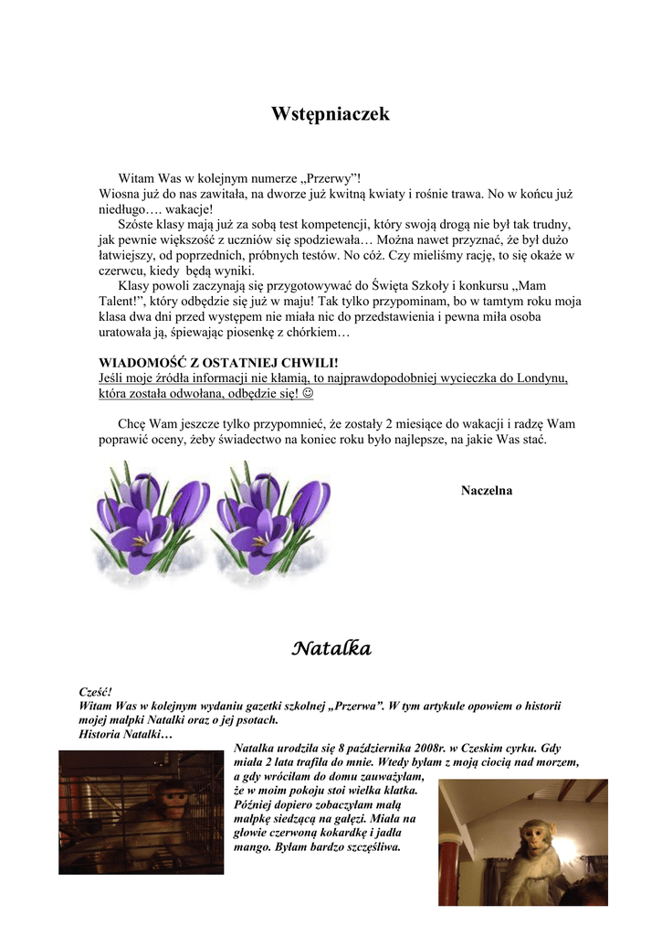 Wstępniaczek Witam Was w kolejnym numerze „Przerwy”! Wiosna już do nas zawitała, na dworze już kwitną kwiaty i rośnie trawa. No w końcu już niedługo…. wakacje! Szóste klasy mają już za sobą test kompetencji, który swoją drogą nie był tak trudny, jak pewnie większość z uczniów się spodziewała… Można nawet przyznać, że był dużo łatwiejszy, od poprzednich, próbnych testów. No cóż. Czy mieliśmy rację, to się okaże w czerwcu, kiedy będą wyniki. Klasy powoli zaczynają się przygotowywać do Święta Szkoły i konkursu „Mam Talent!”, który odbędzie się już w maju! Tak tylko przypominam, bo w tamtym roku moja klasa dwa dni przed występem nie miała nic do przedstawienia i pewna miła osoba uratowała ją, śpiewając piosenkę z chórkiem… WIADOMOŚĆ Z OSTATNIEJ CHWILI! Jeśli moje źródła informacji nie kłamią, to najprawdopodobniej wycieczka do Londynu, która została odwołana, odbędzie się! Chcę Wam jeszcze tylko przypomnieć, że zostały 2 miesiące do wakacji i radzę Wam poprawić oceny, żeby świadectwo na koniec roku było najlepsze, na jakie Was stać. Naczelna Natalka Cześć! Witam Was w kolejnym wydaniu gazetki szkolnej „Przerwa”. W tym artykule opowiem o historii mojej małpki Natalki oraz o jej psotach. Historia Natalki… Natalka urodziła się 8 października 2008r. w Czeskim cyrku. Gdy miała 2 lata trafiła do mnie. Wtedy byłam z moją ciocią nad morzem, a gdy wróciłam do domu zauważyłam, że w moim pokoju stoi wielka klatka. Później dopiero zobaczyłam małą małpkę siedzącą na gałęzi. Miała na głowie czerwoną kokardkę i jadła mango. Byłam bardzo szczęśliwa. Popołudniowa drzemka… Pewnego dnia wróciłam do domu i zobaczyłam, że Natalki nie ma w klatce. Bardzo się przestraszyłam. Zaczęłam jej wszędzie szukać i… znalazłam. Była w koszu na pranie i spała ze swoim misiem. Ucieczka z więzienia… Dawałam Natalce jeść. Nagle zadzwoniła moja komórka i musiałam przejść do innego pokoju. Gdy wróciłam małpy nie było w klatce. Drzwiczki były otwarte. Spojrzałam na stół i zobaczyłam na nim Natalkę jedzącą czekoladę. Goniłam ją po całym domu i w końcu po 15 minutach złapałam zbiega, lecz nie przyznała się do zarzucanego jej czynu. Natalka w szkole… Dnia 24.05.2012r. Natalka pierwszy raz była w szkole. Niestety nie oduczyła się w niej gryźć. Wtedy zostały poszkodowane 2 osoby, ale na szczęście nic im się nie stało. Tylko lekko je drasnęła swoimi małymi ząbkami. Zepsuty czajnik… Pewnego dnia Natalka ponownie uciekła z klatki. Bardzo się zdenerwowała, gdy zaczęliśmy ją gonić i… rzuciła czajnikiem. Nie przeżył takiego upadku. Kolejny wybryk… Tym razem Natalka zadarła z Księdzem. Gdy przyszedł do nas w święta zabrała mu czapkę. Niestety nie udało jej się już uratować, a Natalka już pewnie nie otrzyma rozgrzeszenia. Natalka potrafi być też bardzo niebezpieczna… Kąpaliśmy ją i nagle wgryzła się w rękę mojej babci. Chyba jej nie polubiła. Paszport… Natalka posiada również swój paszport, w którym zapisana jest jej data urodzenia, jakiego jest rodzaju oraz skąd pochodzi. Ciekawostki… Natalka nie lubi bananów Ma lęk wysokości Uwielbia czekoladę Pije z butelki Jest rodzaju Makaki. Są to drugie najmądrzejsze małpy na świecie Żyją około 35 lat Ten rodzaj małp pochodzi z Indii Samiec w złości potrafi podnieść 80kg, a samica 50kg Mam nadzieję, że Wam się podobało. Do zobaczenia w następnej gazetce. Kaja Baj 6a i Natalka Mamy złoto !!!! W poniedziałek, 7 kwietnia br. na hali sportowej przy Zespole Szkół nr.1 w Bobowej rozegrano Rejonowe Mistrzostwa w mini-siatkówce. Podczas turnieju cztery zespoły zmagały się o awans do finału wojewódzkiego. Mecze były rozgrywane w systemie trzy setowym. Kiedy wszystkie drużyny rozegrały mecze według zasady każdy z każdym. Nasze „ złotka” wywalczyły I miejsce – i awansowały do finału wojewódzkiego !!! Okiem Krytyczek Na Szkołę Witamy Was w kolejnym artykule "Krytyczek". Jak wam mija rok szkolny? Pomyśleć, że jeszcze tylko nieco 2 miesiące i opuścimy szkolne mury, zmierzając w stronę wakacji. Niedawno, bo 1 kwietnia szóstoklasiści pisali najważniejszy test w szkole podstawowej- test kompetencji . Jak Wam poszło? Mamy nadzieję, że dobrze, bo my jesteśmy bardzo zadowolone :) Jednak jak to na krytyczki przystało trzeba coś skrytykować. Długo zastanawiałyśmy się nad tematem i wstyd się przyznać, ale powoli brakuje nam pomysłów. W szkole można skrytykować mnóstwo rzeczy, ale najlepiej przyjmuje się UZASADNIONĄ krytykę. Ostatnio wzięłyśmy pod uwagę sklepik szkolny. Czemu by teraz nie skomentować jego zawartości. Nie będziemy długo opisywać. Prosiłybyśmy tylko o jakieś owoce, może batony zbożowe? Drugim, myślimy, że ważniejszym tematem, jest sala gimnastyczna. w-f to ulubiony przedmiot wielu uczniów naszej szkoły, tylko... czy mamy odpowiednie warunki? Pewnie jak większość z Was wie, we wakacje odbyć się ma remont. Patrząc na salę Szkoły Podstawowej nr.21 lub numer 3 - jest czego pozazdrościć. Sala na której spokojnie można w coś pograć i konkretnie przygotować się do zawodów. Warto wspomnieć o suficie... w naszej Sali. Dlaczego on jest taki niski i po co jest to... to... no takie metalowe. Dobrze by było, gdyby sufit był wyższy, o wiele lepiej grałoby się np. w siatkówkę. Krytyczki Przed Świętami Wielkanocnymi kilka klas udało się do Galerii Marii Ritter na przedświąteczne warsztaty połączone ze zwiedzaniem mieszczańskiego wnętrza należącego do znamienitej rodziny znanej malarki sądeckiej. Uczniowie klasy III d wykonali z pisanek gustowne kurczaczki wykorzystując do ozdabiania kolorowe tasiemki i piórka oraz kawałki flizeliny. Zabawa była przednia. Dzieci nawet nadały imiona ozdobom wielkanocnym. Święta tuż, tuż, dlatego nasza klas
