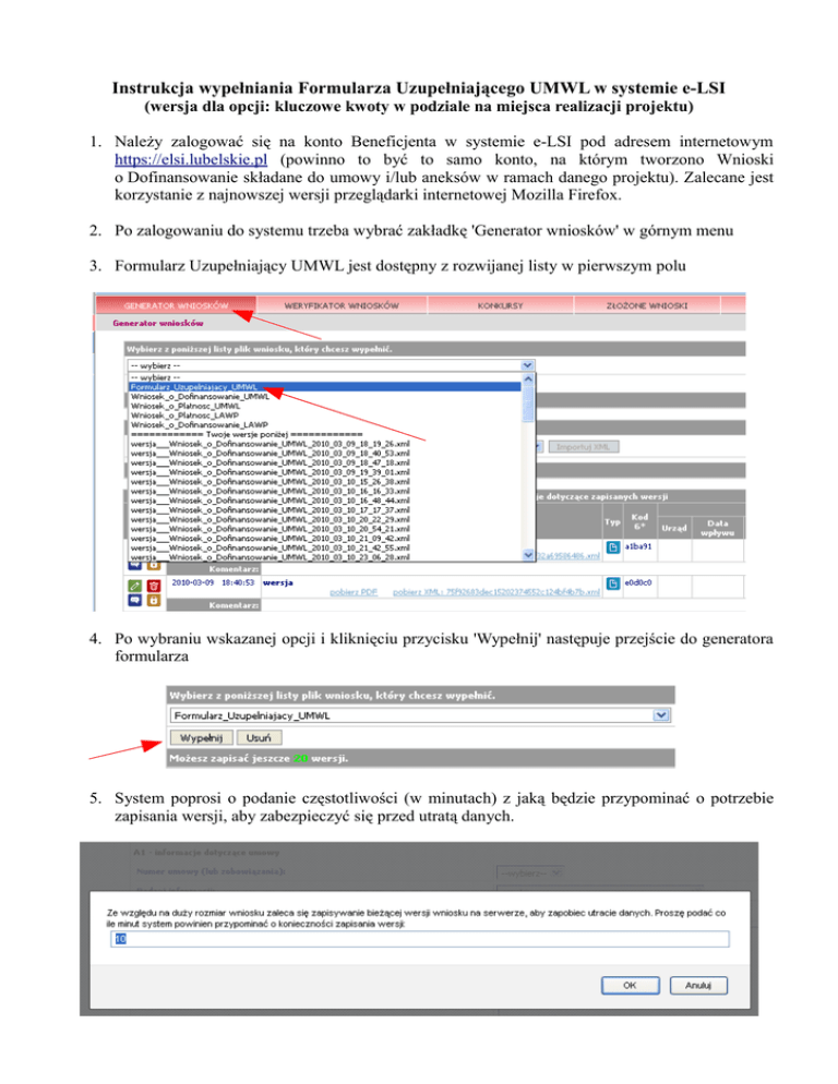 Instrukcja wypełniania Formularza Uzupełniającego UMWL w systemie e-LSI (wersja dla opcji: kluczowe kwoty w podziale na miejsca realizacji projektu) 1. Należy zalogować się na konto Beneficjenta w systemie e-LSI pod adresem internetowym https://elsi.lubelskie.pl (powinno to być to samo konto, na którym tworzono Wnioski o Dofinansowanie składane do umowy i/lub aneksów w ramach danego projektu). Zalecane jest korzystanie z najnowszej wersji przeglądarki internetowej Mozilla Firefox. 2. Po zalogowaniu do systemu trzeba wybrać zakładkę 'Generator wniosków' w górnym menu 3. Formularz Uzupełniający UMWL jest dostępny z rozwijanej listy w pierwszym polu 4. Po wybraniu wskazanej opcji i kliknięciu przycisku 'Wypełnij' następuje przejście do generatora formularza 5. System poprosi o podanie częstotliwości (w minutach) z jaką będzie przypominać o potrzebie zapisania wersji, aby zabezpieczyć się przed utratą danych. Pojawianie się monitu zalecającego zapisanie roboczej wersji formularza nie pociąga za sobą żadnej akcji i ma charakter czysto informacyjny. Do faktycznego zapisywania wersji służy przycisk 'Zapisz wersję' znajdujący się na dole strony. 6. Po wejściu w generator Formularza Uzupełniającego w części A1 należy wybrać numer umowy lub zobowiązania oraz określić typ informacji przedstawianych w formularzu (dane finansowe) – formularz z tak zaznaczoną opcją należy dostarczyć do Instytucji Zarządzającej tylko w przypadku, gdy projekt jest realizowany na terenie więcej niż jednej gminy (określane na podstawie miejsc realizacji projektu przedstawionych w części 'A' Wniosku o Dofinansowanie) 7. Wybranie obu opcji opisanych w punkcie 6. spowoduje zasilenie formularza danymi z najbardziej aktualnej wersji Wniosku o Dofinansowanie złożonej w IZ. Beneficjenci mają możliwość edycji większości informacji w sekcji A (Dane projektu) na wypadek, gdyby dane przechowywane w bazie systemu LSI okazały się nieaktualne. Pola w części A3 i A4 dotyczące wskaźników nie są przedmiotem analizy danych finansowych, przez co są nieaktywne w elektronicznej wersji formularza. 8. W celu przedstawienia właściwych danych finansowych projektu z podziałem na miejsca realizacji należy przejść do sekcji B formularza korzystając z opcji nawigacyjnych dostępnych na dole strony 9. W tabeli B1 Beneficjenci powinni przedstawić cząstkowy udział poszczególnych gmin w kluczowych kwotach projektu (wartość całkowita, całkowite dofinansowanie, dofinansowanie z Europejskiego Funduszu Rozwoju Regionalnego, oszczędności w projekcie) 10. Łączna wartość kwot cząstkowych powinna być zgodna z kwotami zawartymi w części A2, które zostały pobrane z aktualnego Wniosku o Dofinansowanie do umowy/zobowiązania lub aneksu. Bieżącą sumę kwot w tabeli B1 można uzyskać klikając łącze 'sumuj całość'. Prawidłowość przedstawionych kwot można także sprawdzić klikając przycisk 'Zweryfikuj poprawność wypełnienia wniosku' na dole strony. Jeżeli kwoty zawarte w podsumowaniu tabeli B1 okażą się niezgodne z wartościami w części A2 generator wyświetli komunikaty o błędach, zarówno w sekcji A2 jak i w sekcji B1 11. Formularz nie powinien zawierać błędów. W uzasadnionych przypadkach, gdy na podstawie posiadanych dokumentów Beneficjent nie jest w stanie dokładnie określić wskazanych kwot w podziale na miejsca realizacji projektu można podać kwoty cząstkowe w przybliżeniu. W przedstawionej sytuacji należy dodatkowo opisać przyczynę niedokładności w kwotach cząstkowych, podać metodę zastosowaną przy obliczaniu kwot w podziale na miejsca realizacji, a także określić szacowany poziom błędu. 12. Formularz Uzupełniający należy dostarczyć do Instytucji Zarządzającej w wersji elektronicznej (plik XML oraz plik PDF), a także w wersji papierowej (wydruk z pliku PDF). Wersje zawierające błędy (napis 'Formularz testowy' na każdej stronie) nie będą przyjmowane. Plik XML oraz plik PDF można pobrać za pomocą przycisków na dole strony.