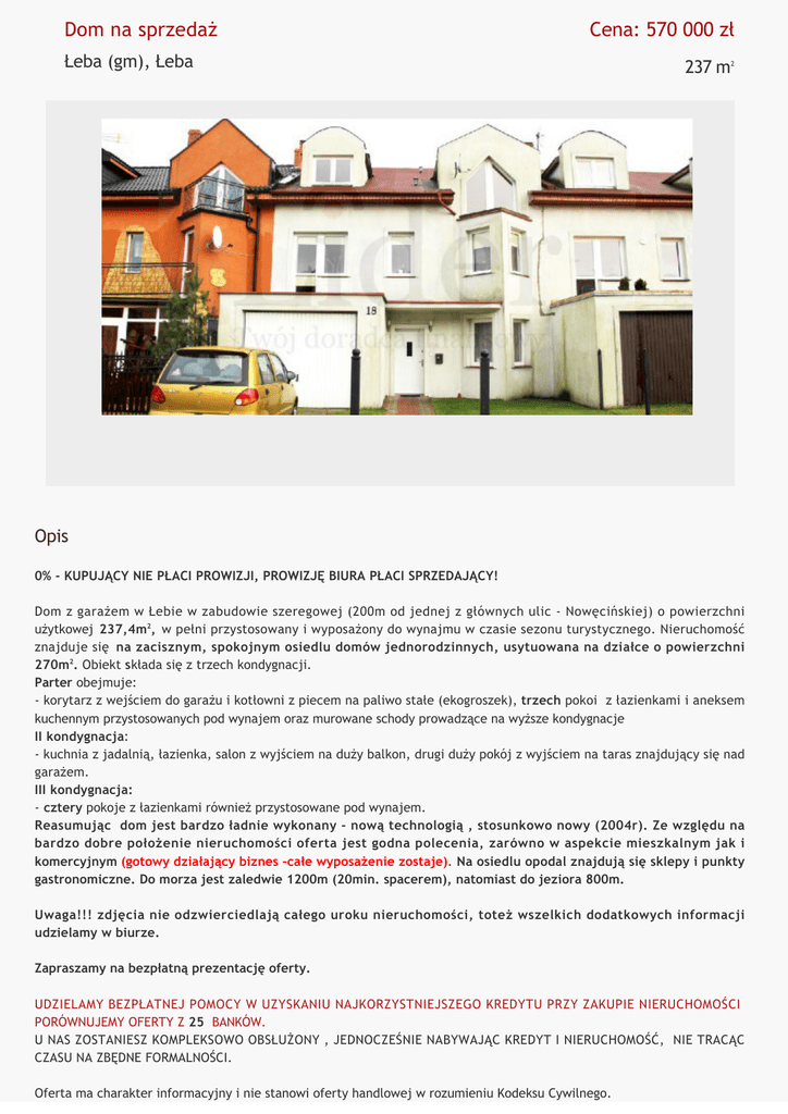 Dom na sprzedaż Cena: 570 000 zł Łeba (gm), Łeba 237 m 2 Opis 0% ‐ KUPUJĄCY NIE PŁACI PROWIZJI, PROWIZJĘ BIURA PŁACI SPRZEDAJĄCY! Dom z garażem w Łebie w zabudowie szeregowej (200m od jednej z głównych ulic ‐ Nowęcińskiej) o powierzchni użytkowej 237,4m2, w pełni przystosowany i wyposażony do wynajmu w czasie sezonu turystycznego. Nieruchomość znajduje się na zacisznym, spokojnym osiedlu domów jednorodzinnych, usytuowana na działce o powierzchni 270m2. Obiekt składa się z trzech kondygnacji. Parter obejmuje: ‐ korytarz z wejściem do garażu i kotłowni z piecem na paliwo stałe (ekogroszek), trzech pokoi z łazienkami i aneksem kuchennym przystosowanych pod wynajem oraz murowane schody prowadzące na wyższe kondygnacje II kondygnacja: ‐ kuchnia z jadalnią, łazienka, salon z wyjściem na duży balkon, drugi duży pokój z wyjściem na taras znajdujący się nad garażem. III kondygnacja: ‐ cztery pokoje z łazienkami również przystosowane pod wynajem. Reasumując dom jest bardzo ładnie wykonany ‐ nową technologią , stosunkowo nowy (2004r). Ze względu na bardzo dobre położenie nieruchomości oferta jest godna polecenia, zarówno w aspekcie mieszkalnym jak i komercyjnym (gotowy działający biznes –całe wyposażenie zostaje). Na osiedlu opodal znajdują się sklepy i punkty gastronomiczne. Do morza jest zaledwie 1200m (20min. spacerem), natomiast do jeziora 800m. Uwaga!!! zdjęcia nie odzwierciedlają całego uroku nieruchomości, toteż wszelkich dodatkowych informacji udzielamy w biurze. Zapraszamy na bezpłatną prezentację oferty. UDZIELAMY BEZPŁATNEJ POMOCY W UZYSKANIU NAJKORZYSTNIEJSZEGO KREDYTU PRZY ZAKUPIE NIERUCHOMOŚCI PORÓWNUJEMY OFERTY Z 25 BANKÓW. U NAS ZOSTANIESZ KOMPLEKSOWO OBSŁUŻONY , JEDNOCZEŚNIE NABYWAJĄC KREDYT I NIERUCHOMOŚĆ, NIE TRACĄC CZASU NA ZBĘDNE FORMALNOŚCI. Oferta ma charakter informacyjny i nie stanowi oferty handlowej w rozumieniu Kodeksu Cywilnego. więcej ofert na www.nieruchomosci‐lider.pl Dane agenta Grzegorz kom. 513136636, 601059692 Osoba odpowiedzialna Kochman nr licencji: 13270 Szczegóły Symbol oferty Lokalizacja Pow. całkowita [m2] Ilość pokoi Cena Nieruchomość LID‐DS‐7892 Łeba (gm), Łeba 237,40 m² 9 570 000 PLN Technologia budowlana Garaż w budynku Okna nowe PCV Instalacje Balkon Ilość balkonów Pomieszczenia Ilość pokoi Wysokość pomieszczeń Podłogi pokoi Typ kuchni Powierzchnia działki [m2] 9 2,5 m terakota, panele z zabudową kuchenną Rodzaj kuchni oddzielna Podłoga kuchni terakota Typ łazienki Ilość łazienek razem z wc 8 Glazura łazienki nowego typu Podłoga łazienki terakota Wyposażenie łazienki natrysk, wanna pustak Zagosp. działki Ukształtowanie działki Kształt działki Rodzaj domu Pokrycie dachu Powierzchnia użytkowa [m2] Stan budynku Podpiwniczenie Rok budowy Plac zabaw Gaz Woda Dojazd Otoczenie Ogrzewanie nowe duży 1 270 m² zagospodarowana płaska prostokąt szereg środkowy papa termozgrzewalna 237,4 m² do zamieszkania nie 2004 nie w ulicy tak ‐ miejska droga utwardzona działki zabudowane etażowe Alarm nie Winda nie Tarasy taras duży Ilość tarasów 1 Drzwi antywłamaniowe nie Prąd tak Kanalizacja tak