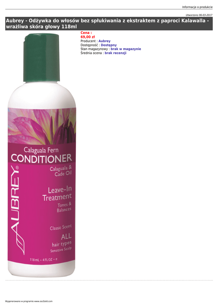 Informacje o produkcie Utworzono 06-03-2017 Aubrey - Odżywka do włosów bez spłukiwania z ekstraktem z paproci Kalawalla wrażliwa skóra głowy 118ml Cena : 69,00 zł Producent : Aubrey Dostępność : Dostępny Stan magazynowy : brak w magazynie Średnia ocena : brak recenzji Wygenerowano w programie www.oscGold.com Lecznicza odżywka normalizuje włosy i skórę głowy. Długotrwałe działanie leczniczych roślin przywraca równowagę i wzmacnia włosy od cebulek aż po same końce. Witaminy z grupy B dodają włosom objętości. Włosy stają się podatne na układanie. Odżywka pomaga osiągnąć efekt pełnych i zdrowych włosów. - w 100% naturalny zapach - bez parabenów - bez glikolu - bez sztucznych barwników - bez silikonu - bez Phenoxyethanolu - bez PEG i SLS - bez składników GMO - fizjologiczne pH - hypoalergiczna Kluczowe składniki: ekstrakt z paproci z Ameryki Południowej i esencja z drzewa jałowca kolczastego - tonizują, wspierają zdrowie włosów i skóry głowy; żywice roślinne - dodają objętości i utrwalają; kompleks aminokwasów - przywraca równowagę i wzmacnia. Polecana: do przetłuszczających się, cienkich włosów Składniki: Aqua, alcohol denat. (38b, lavender*), pinus strobus (white pine) bark extract, aloe barbadensis leaf juice*, panthenol (vitamin B-5), astragalus gummifer (tragacanth) gum, juniperus oxycedrus (cade) wood oil, citrus medica limonum (lemon) peel oil*, acacia senegal (arabic) gum*, rosa rubiginosa (Rosa Mosqueta®) seed oil*, myroxylon balsamum Informacje o produkcie (balsam) oil, citrus aurantium dulcis (sweet orange) oil*, glycerin, citrus grandis (grapefruit) extract, tocopheryl acetate (vitamin E), hamamelis virginiana (witch hazel) water, ascorbic acid (vitamin C), glycine soja oil‡, daucus carota sativa (carrot) root extract, beta-carotene, polypodium leucotomos (calaguala) leaf extract. *Składniki organiczne Wygenerowano w programie www.oscGold.com