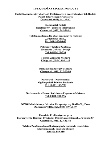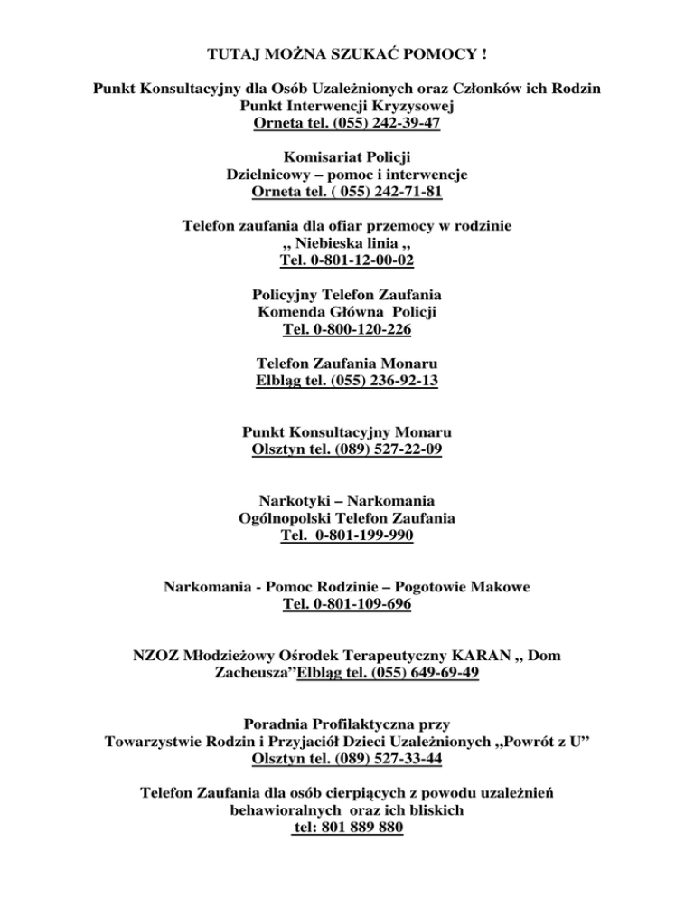 TUTAJ MOśNA SZUKAĆ POMOCY ! Punkt Konsultacyjny dla Osób UzaleŜnionych oraz Członków ich Rodzin Punkt Interwencji Kryzysowej Orneta tel. (055) 242-39-47 Komisariat Policji Dzielnicowy – pomoc i interwencje Orneta tel. ( 055) 242-71-81 Telefon zaufania dla ofiar przemocy w rodzinie „ Niebieska linia „ Tel. 0-801-12-00-02 Policyjny Telefon Zaufania Komenda Główna Policji Tel. 0-800-120-226 Telefon Zaufania Monaru Elbląg tel. (055) 236-92-13 Punkt Konsultacyjny Monaru Olsztyn tel. (089) 527-22-09 Narkotyki – Narkomania Ogólnopolski Telefon Zaufania Tel. 0-801-199-990 Narkomania - Pomoc Rodzinie – Pogotowie Makowe Tel. 0-801-109-696 NZOZ MłodzieŜowy Ośrodek Terapeutyczny KARAN „ Dom Zacheusza”Elbląg tel. (055) 649-69-49 Poradnia Profilaktyczna przy Towarzystwie Rodzin i Przyjaciół Dzieci UzaleŜnionych „Powrót z U” Olsztyn tel. (089) 527-33-44 Telefon Zaufania dla osób cierpiących z powodu uzaleŜnień behawioralnych oraz ich bliskich tel: 801 889 880