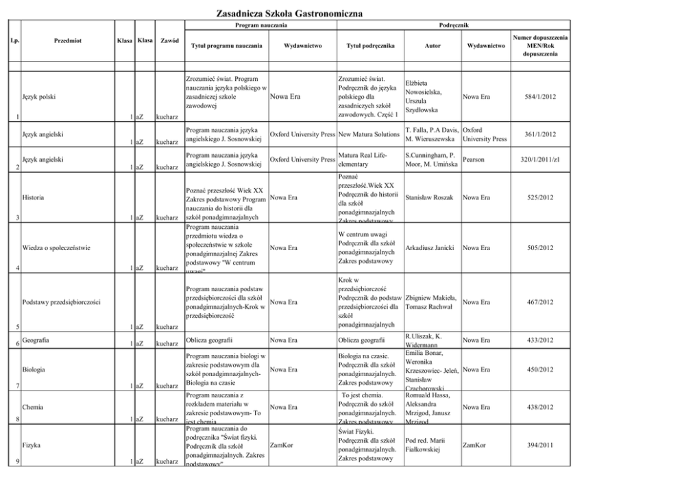 Zasadnicza Szkoła Gastronomiczna Podręcznik Program nauczania Lp. Przedmiot Klasa Klasa Zawód 1 aZ kucharz 1 aZ kucharz Oxford University Press kucharz Program nauczania języka angielskiego J. Sosnowskiej Historia 3 1 aZ kucharz Wiedza o społeczeństwie 4 1 aZ kucharz Podstawy przedsiębiorczości 5 6 Geografia 1 aZ kucharz 1 aZ kucharz Biologia 7 1 aZ kucharz Chemia 8 1 aZ kucharz Fizyka 9 1 aZ Zrozumieć świat. Podręcznik do języka polskiego dla zasadniczych szkół zawodowych. Część 1 Oxford University Press New Matura Solutions Język angielski 1 aZ Tytuł podręcznika Program nauczania języka angielskiego J. Sosnowskiej Język angielski 2 Wydawnictwo Zrozumieć świat. Program nauczania języka polskiego w zasadniczej szkole Nowa Era zawodowej Język polski 1 Tytuł programu nauczania kucharz Autor Elżbieta Nowosielska, Urszula Szydłowska Wydawnictwo Nowa Era T. Falla, P.A Davis, Oxford M. Wieruszewska University Press Numer dopuszczenia MEN/Rok dopuszczenia 584/1/2012 361/1/2012 Matura Real Lifeelementary S.Cunningham, P. Pearson Moor, M. Umińska Poznać przeszłość.Wiek XX Podręcznik do historii dla szkół ponadgimnazjalnych Zakres podstawowy Stanisław Roszak Nowa Era 525/2012 W centrum uwagi Podręcznik dla szkół ponadgimnazjalnych Zakres podstawowy Arkadiusz Janicki Nowa Era 505/2012 Program nauczania podstaw przedsiębiorczości dla szkół Nowa Era ponadgimnazjalnych-Krok w przedsiębiorczość Krok w przedsiębiorczość Podręcznik do podstaw Zbigniew Makieła, Nowa Era przedsiębiorczości dla Tomasz Rachwał szkół ponadgimnazjalnych 467/2012 Oblicza geografii Oblicza geografii Poznać przeszłość Wiek XX Zakres podstawowy Program Nowa Era nauczania do historii dla szkół ponadgimnazjalnych Program nauczania przedmiotu wiedza o społeczeństwie w szkole Nowa Era ponadgimnazjalnej Zakres podstawowy "W centrum uwagi" Nowa Era Program nauczania biologi w zakresie podstawowym dla Nowa Era szkół ponadgimnazjalnychBiologia na czasie Biologia na czasie. Podręcznik dla szkół ponadgimnazjalnych. Zakres podstawowy Program nauczania z rozkładem materiału w Nowa Era zakresie podstawowym- To jest chemia Program nauczania do podręcznika "Świat fizyki. ZamKor Podręcznik dla szkół ponadgimnazjalnych. Zakres podstawowy" To jest chemia. Podręcznik do szkół ponadgimnazjalnych. Zakres podstawowy Świat Fizyki. Podręcznik dla szkół ponadgimnazjalnych. Zakres podstawowy R.Uliszak, K. Nowa Era Widermann Emilia Bonar, Weronika Krzeszowiec- Jeleń, Nowa Era Stanisław Czachorowski Romuald Hassa, Aleksandra Nowa Era Mrzigod, Janusz Mrzigod Pod red. Marii Fiałkowskiej ZamKor 320/1/2011/z1 433/2012 450/2012 438/2012 394/2011 1 aZ kucharz Program nauczania matematyki do zasadniczej WSiP szkoły zawodowej (aut. programu: Maciej Bryński, Karol Szymański) Program nauczania. Informatyka dla szkół MiGra ponadgimnazjalnych - zakres podstawowy 1 aZ kucharz Koncepcja edukacji fizycznej. Oficyna Wydawnicza Zdrowie. Sport. Rekreacja. "Impuls"2012 1 aZ kucharz Matematyka 10 1 aZ kucharz Informatyka 11 Wychowanie fizyczne 12 13 Edukacja dla bezpieczeństwa Wyposażenie i zasady bezpieczeństwa w gastronomii 14 1 aZ kucharz Język angielski w gastronomii 1 aZ kucharz Język angielski w gastronomii 15 1 aZ kucharz Technologia gastronomiczna z towaroznawstwem 16 1 aZ 17 Procesy technologiczne w gastronomii 1 aZ 18 Religia 1 aZ kucharz kucharz kucharz Etyka 19 1 aZ 1 aZ kucharz 1 bZ Język angielski - Wydawnictwa Szkolne i Pedagogiczne ( WSiP ) Informatyka dla szkół ponadgimnazjalnych zakres podstawowy. Grażyna Koba MiGra 536/2012 B.Boniek Operon 409/2012 Wyposażenie i zasady bezpieczeństwa w gastronomii Agnieszka Kasperek, Marzanna Kondratowicz REA 53/2013 Hotels and catering V. Evans,J. Dooley, Egis, Express V. Garza Publishing Cooking V. Evans, J. Dooley, R. Hayley Technologia gastronomiczna z towaroznawstwem część I Małgorzata Konarzewska brak podręcznika Edukacja dla bezpieczeństwa Procesy technologiczne Iwona Namysław w gastronomii Lidia Górska Z Chrystusem przez świat KEP Mocni wiarą Etyka.Zakres podstawowy Operon Etyka Wędrując ku dorosłości. Program nauczania dla klas I- Rubikon III szkoły ponadgimnazjalnej Zrozumieć świat. Program nauczania języka polskiego w zasadniczej szkole Nowa Era zawodowej Język polski 21 Program nauczania dla zawodu kucharz 512001 o strukturze przedmiotowej (2/2013/2014/ZSG/kucharz) Program nauczania dla zawodu kucharz 512001 o strukturze przedmiotowej (2/2013/2014/ZSG/kucharz) Program nauczania dla zawodu kucharz 512001 o strukturze przedmiotowej (2/2013/2014/ZSG/kucharz) Program nauczania dla zawodu kucharz 512001 o strukturze przedmiotowej (2/2013/2014/ZSG/kucharz) Program nauczania dla zawodu kucharz 512001 o strukturze przedmiotowej (2/2013/2014/ZSG/kucharz) Leokadia Wojciechowska, Maciej Bryński, Karol Szymański kucharz Wychowanie do życia w rodzinie 20 Edukacja dla bezpieczeństwa Operon Matematyka do zasadniczych szkół zawodowych kucharz Program nauczania języka angielskiego J. Sosnowskiej 580/1/2012 Egis, Express Publishing WSiP 69/2013 WSiP ks. Tadeusz Panuś, Renata Św. Stanisław Chrzanowska BM, Kraków Jakub Kapiszewski,Paweł Operon Kołodziński Paweł Kołodziński KR- 41-04/12-KR2/12 408/2011 Wędrując ku dorosłości T. Król, M. Ryś Rubikon 663/2013 Zrozumieć świat. Podręcznik do języka polskiego dla zasadniczych szkół zawodowych. Część 1 Nowa Era 584/1/2012 Oxford University Press New Matura Solutions Elżbieta Nowosielska, Urszula Szydłowska T. Falla, P.A Davis, Oxford M. Wieruszewska University Press 361/1/2012 Język angielski 22 1 bZ kucharz Historia 23 1 bZ kucharz Wiedza o społeczeństwie 24 1 bZ kucharz Podstawy przedsiębiorczości 25 26 Geografia 1 bZ kucharz 1 bZ kucharz Biologia 27 1 bZ kucharz W centrum uwagi Podręcznik dla szkół ponadgimnazjalnych Zakres podstawowy Arkadiusz Janicki Nowa Era 505/2012 Program nauczania podstaw przedsiębiorczości dla szkó