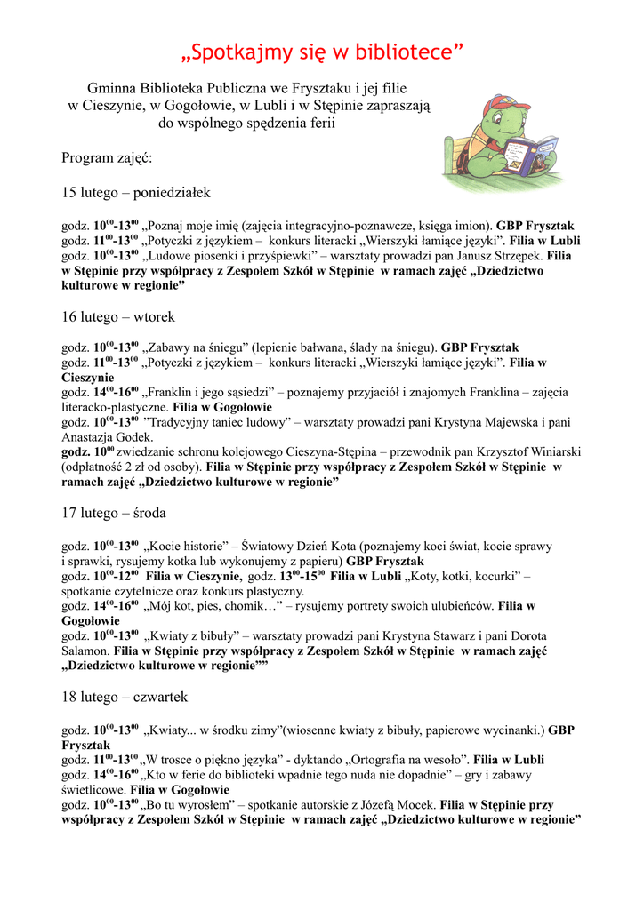 „Spotkajmy się w bibliotece” Gminna Biblioteka Publiczna we Frysztaku i jej filie w Cieszynie, w Gogołowie, w Lubli i w Stępinie zapraszają do wspólnego spędzenia ferii Program zajęć: 15 lutego – poniedziałek godz. 1000-1300 „Poznaj moje imię (zajęcia integracyjno-poznawcze, księga imion). GBP Frysztak godz. 1100-1300 „Potyczki z językiem – konkurs literacki „Wierszyki łamiące języki”. Filia w Lubli godz. 1000-1300 „Ludowe piosenki i przyśpiewki” – warsztaty prowadzi pan Janusz Strzępek. Filia w Stępinie przy współpracy z Zespołem Szkół w Stępinie w ramach zajęć „Dziedzictwo kulturowe w regionie” 16 lutego – wtorek godz. 1000-1300 „Zabawy na śniegu” (lepienie bałwana, ślady na śniegu). GBP Frysztak godz. 1100-1300 „Potyczki z językiem – konkurs literacki „Wierszyki łamiące języki”. Filia w Cieszynie godz. 1400-1600 „Franklin i jego sąsiedzi” – poznajemy przyjaciół i znajomych Franklina – zajęcia literacko-plastyczne. Filia w Gogołowie godz. 1000-1300 ”Tradycyjny taniec ludowy” – warsztaty prowadzi pani Krystyna Majewska i pani Anastazja Godek. godz. 1000 zwiedzanie schronu kolejowego Cieszyna-Stępina – przewodnik pan Krzysztof Winiarski (odpłatność 2 zł od osoby). Filia w Stępinie przy współpracy z Zespołem Szkół w Stępinie w ramach zajęć „Dziedzictwo kulturowe w regionie” 17 lutego – środa godz. 1000-1300 „Kocie historie” – Światowy Dzień Kota (poznajemy koci świat, kocie sprawy i sprawki, rysujemy kotka lub wykonujemy z papieru) GBP Frysztak godz. 1000-1200 Filia w Cieszynie, godz. 1300-1500 Filia w Lubli „Koty, kotki, kocurki” – spotkanie czytelnicze oraz konkurs plastyczny. godz. 1400-1600 „Mój kot, pies, chomik…” – rysujemy portrety swoich ulubieńców. Filia w Gogołowie godz. 1000-1300 „Kwiaty z bibuły” – warsztaty prowadzi pani Krystyna Stawarz i pani Dorota Salamon. Filia w Stępinie przy współpracy z Zespołem Szkół w Stępinie w ramach zajęć „Dziedzictwo kulturowe w regionie”” 18 lutego – czwartek godz. 1000-1300 „Kwiaty... w środku zimy”(wiosenne kwiaty z bibuły, papierowe wycinanki.) GBP Frysztak godz. 1100-1300 „W trosce o piękno języka” - dyktando „Ortografia na wesoło”. Filia w Lubli godz. 1400-1600 „Kto w ferie do biblioteki wpadnie tego nuda nie dopadnie” – gry i zabawy świetlicowe. Filia w Gogołowie godz. 1000-1300 „Bo tu wyrosłem” – spotkanie autorskie z Józefą Mocek. Filia w Stępinie przy współpracy z Zespołem Szkół w Stępinie w ramach zajęć „Dziedzictwo kulturowe w regionie” 19 lutego – piątek godz. 1000-1300 „Poranek muzyczny – posłuchaj kolego” (zapraszamy do udziału dzieci grające na instrumentach). GBP Frysztak godz. 1100-1300 „W trosce o piękno języka” – dyktando „Ortografia na wesoło”. Filia w Cieszynie godz. 1400-1600 „Bibułkowy kwiat upominkiem dla każdej pani” – papierowe wycinanki. Filia w Gogołowie 22 lutego – poniedziałek godz. 1000-1300 „Wierszyki łamiące języki” – Międzynarodowy Dzień Języka Ojczystego (konkursy językowe, dyktando). GBP Frysztak godz. 1100-1300 „Muzyka łagodzi obyczaje” – spotkanie czytelnicze oraz konkurs kaligrafii „Mam talent”. Filia w Lubli godz. 1000-1300 „Historyczna przynależność do regionu – miejscowy strój ludowy – warsztaty prowadzi pani Joanna Dziok. Filia w Stępinie przy współpracy z Zespołem Szkół w Stępinie w ramach zajęć „Dziedzictwo kulturowe w regionie” 23 lutego – wtorek godz. 1000-1300 „Świat w kawałkach” (układanie puzzli, gry i zabawy stolikowe). GBP Frysztak godz. 1100-1300 „Muzyka łagodzi obyczaje” – spotkanie czytelnicze oraz konkurs kaligrafii „Mam talent”. Filia w Cieszynie godz. 1400-1600 „Zgadnij z jakiej bajki jest ta ilustracja” – wesołe malowanie, rozwiązywanie krzyżówek literackich i rebusów. Filia w Gogołowie godz. 1000-1300 „Wyroby ze słomy” – warsztaty prowadzi pani Adela Papuga. godz. 1000 zwiedzanie schronu kolejowego Cieszyna-Stępina – przewodnik pan Krzysztof Winiarski (odpłatność 2 zł od osoby). Filia w Stępinie przy współpracy z Zespołem Szkół w Stępinie w ramach zajęć „Dziedzictwo kulturowe w regionie” 24 lutego – środa godz. 1000-1300 „Ja i mój instrument – poranek muzyczny”. GBP Frysztak godz. 1000-1200 „Mistrz rakietki” - turniej tenisa stołowego. Filia w Cieszynie godz. 1300-1500 „Zgadywanki, układanki” – quizy i zagadki literackie, łamigłówki, rebusy, krzyżówki. Filia w Lubli godz. 1400-1600 „Franklin mówi Kocham Cię” – konkurs na „Najładniejszą Pocztówkę z Ferii . Filia w Gogołowie godz. 1000-1300 „Filemon kontra Reksio – czyli psy i koty w książkach” - czytanie historyjek, zajęcia plastyczne – zwierzaki z makulatury. Filia w Stępinie 25 lutego – czwartek godz. 1000-1300 „Śnieżne pejzaże – zajęcia plastyczne na sztalugach. GBP Frysztak godz. 1100-1300 „Czym skorupka za młodu ...”podsumowanie zajęć, wręczenie nagród i upominków. Filia w Lubli godz. 1400-1600 „Zima za oknem – śniegowe oczarowanie” – ziarnkowe układanki – zajęcia literacko-plastyczne. Filia w Gogołowie godz. 1000-1300 „Zimowe szaleństwo – zabawy na śniegu, „Ferie moich marzeń” - tworzymy książeczki, podsumowanie zajęć, wręczenie nagród i upominków. Filia w Stępinie 26 lutego – piątek godz. 1000-1300 „Z książką weselej” (gry i zabawy literackie, podsumowanie zajęć, wręczenie nagród i upominków) GBP Frysztak godz. 1100-1300 „Czym skorupka za młodu...” – podsumowanie zajęć, wręczenie nagród i upominków. Filia w Cieszynie godz. 1400-1600 „Wilka się nie boję, śpiącą królewnę narysuję, kota w butach pomaluję” – konkurs czytelniczy, podsumowanie zajęć, wręczenie nagród i upominków. Filia w Gogołowie