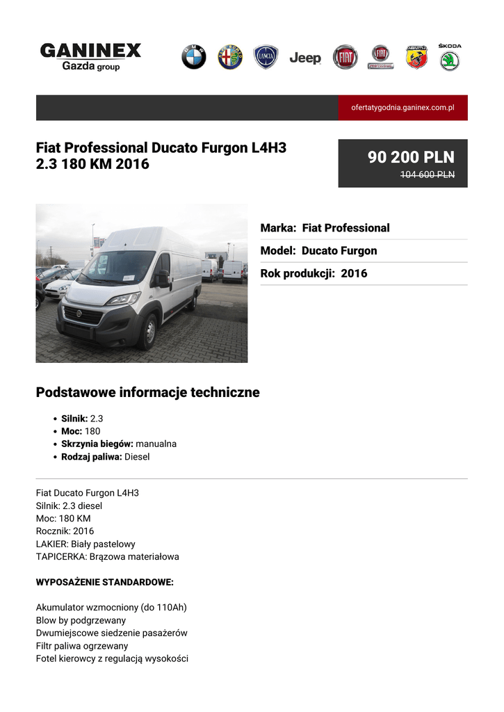 ofertatygodnia.ganinex.com.pl Fiat Professional Ducato Furgon L4H3 2.3 180 KM 2016 90 200 PLN Marka: Fiat Professional Model: Ducato Furgon Rok produkcji: 2016 Podstawowe informacje techniczne Silnik: 2.3 Moc: 180 Skrzynia biegów: manualna Rodzaj paliwa: Diesel Fiat Ducato Furgon L4H3 Silnik: 2.3 diesel Moc: 180 KM Rocznik: 2016 LAKIER: Biały pastelowy TAPICERKA: Brązowa materiałowa WYPOSAŻENIE STANDARDOWE: Akumulator wzmocniony (do 110Ah) Blow by podgrzewany Dwumiejscowe siedzenie pasażerów Filtr paliwa ogrzewany Fotel kierowcy z regulacją wysokości 104 600 PLN Kolumna kierownicy z regulacją wysokości Pełnowymiarowe koło zapasowe Podłokietnik i regulacja lędźwiowa siedzenia kierowcy Poduszka powietrzna kierowcy Servotronic System ESC (ABS+EBD+HBA+ASR+MSR+ESC+Hill Holder) System podtrzymujący koło zapasowe Szyby przednie sterowane elektrycznie Światła do jazdy dziennej Trwała przegroda z blachy z centralnie umieszczoną szybą Uchwyt na kubek Uniwersalny uchwyt do urządzeń mobilnych WYPOSAŻENIE DODATKOWE Pakiet SX PLUS Światła do jazdy dziennej w technologii LED Tempomat z ogranicznikiem prędkości Zawieszenie tylne z podwójnymi resorami Zbiornik paliwa o pojemności 125L Podana cena jest ceną netto Katowice Katowice (Škoda) Pszczyna Gliwice Gliwice (BMW) al. Roździeńskiego 170 tel. 32 351 27 50 al. Roździeńskiego 182 tel. 32 203 66 00 ul. Bielska 31c tel. 32 210 10 00 ul. Pszczyńska 306 tel. 32 230 17 30 ul. Pszczyńska 322 tel. 32 700 10 00