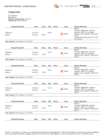 Zapytanie Z: Pyskowice Gliwice Do: 01.04.13 06:00 (Odjazd) Podró» w jedn¡ stron¦: Odj./Przyj. Stacja/Przystanek Data Pyskowice 01.04.13 Gliwice 01.04.13 Czas trwania: Data Pyskowice 01.04.13 Gliwice 01.04.13 Data Pyskowice 01.04.13 Gliwice 01.04.13 Data Pyskowice 01.04.13 Gliwice 01.04.13 Dalsze informacje 64200 REGIO Przewozy Regionalne, przewóz rowerów, tylko 2 kl., poci¡g z elektrycznych zespoªów trakcyjnych (EZT) 2 poª¡czenia alternatywne (co 100 182 minut). Przyj. Odj. Peron Czym Dalsze informacje 07:34 64202 REGIO Przewozy Regionalne, przewóz rowerów, tylko 2 kl., poci¡g z elektrycznych zespoªów trakcyjnych (EZT) 07:49 Przyj. Odj. Peron Czym Dalsze informacje 64204 REGIO Przewozy Regionalne, przewóz rowerów, tylko 2 kl., poci¡g z elektrycznych zespoªów trakcyjnych (EZT) 10:36 10:50 Przyj. Odj. Peron Czym Dalsze informacje 13:36 64206 REGIO Przewozy Regionalne, przewóz rowerów, tylko 2 kl., poci¡g z elektrycznych zespoªów trakcyjnych (EZT) 13:51 Czym Dalsze informacje 64208 REGIO Przewozy Regionalne, przewóz rowerów, tylko 2 kl., poci¡g z elektrycznych zespoªów trakcyjnych (EZT) Czym Dalsze informacje 0:15; kursuje 1. Kwi 2013 Stacja/Przystanek Data Pyskowice 01.04.13 Gliwice 01.04.13 Czas trwania: 05:54 06:08 Czym 0:14; kursuje 1. Kwi 2013 Stacja/Przystanek Czas trwania: Peron 0:15; kursuje 1. Kwi 2013 Stacja/Przystanek Czas trwania: Odj. 0:14; kursuje 1. Kwi 2013 Stacja/Przystanek Czas trwania: Przyj. Przyj. Odj. Peron 16:34 16:48 0:14; kursuje 1. Kwi 2013 Stacja/Przystanek Data Przyj. Odj. Peron 01.04.13 - Korzystaj¡c z systemu www.rozklad-pkp.pl akceptujesz jego Regulamin. Informacje rozkªadowe wyª¡cznie do u»ytku osobistego. Przed rozpocz¦ciem podró»y zasi¦gnij informacji na stronie www.rozklad-pkp.pl na temat ewentualnych zmian w rozkªadzie jazdy. Stacja/Przystanek Data Pyskowice 01.04.13 Strzelce Opolskie 01.04.13 Strzelce Opolskie 01.04.13 Gliwice 01.04.13 Czas trwania: Odj. Peron 17:05 17:41 18:09 1/ 18:45 Czym Dalsze informacje 46215 REGIO Przewozy Regionalne, przewóz rowerów, tylko 2 kl., poci¡g z elektrycznych zespoªów trakcyjnych (EZT) IR 64124 LOMPA interREGIO Przewozy Regionalne, przewóz rowerów, tylko 2 kl., poci¡g z elektrycznych zespoªów trakcyjnych (EZT) Czym Dalsze informacje 64210 REGIO Przewozy Regionalne, przewóz rowerów, 1. i 2. kl., poci¡g z elektrycznych zespoªów trakcyjnych (EZT) 2 poª¡czenia alternatywne (co 49 96 minut). Czym Dalsze informacje 1:40; kursuje 1. Kwi 2013 Stacja/Przystanek Data Pyskowice 01.04.13 Gliwice 01.04.13 Czas trwania: Przyj. Przyj. Odj. Peron 19:45 19:59 0:14; kursuje 1. Kwi 2013 Stacja/Przystanek Data Przyj. Odj. Peron Osobowy Pyskowice 01.04.13 Gliwice 01.04.13 Czas trwania: KS 44226 21:38 Koleje l¡skie, tylko 2 kl., poci¡g z elektrycznych zespoªów trakcyjnych (EZT) 0:17; kursuje codziennie, oprócz 14. Kwi do 8. Cze 2013 Stacja/Przystanek Data Pyskowice 01.04.13 Gliwice 01.04.13 Czas trwania: 21:21 Przyj. Odj. Peron 22:10 22:24 Czym Dalsze informacje 64212 REGIO Przewozy Regionalne, przewóz rowerów, tylko 2 kl., poci¡g z elektrycznych zespoªów trakcyjnych (EZT) Czym Dalsze informacje 0:14; kursuje 1. do 13. Kwi 2013 Stacja/Przystanek Data Przyj. Odj. Peron Osobowy Pyskowice 01.04.13 Lubliniec 01.04.13 Lubliniec 02.04.13 Katowice 02.04.13 23:13 KS 44227 23:57 02:36 04:29 III/4 TLK83200 Koleje l¡skie, tylko 2 kl., poci¡g z elektrycznych zespoªów trakcyjnych (EZT) POMERANIA TLK PKP Intercity, poci¡g z rezerwacj¡ miejsc, wagon sypialny, wagon z miejscami do le»enia, przesyªki konduktorskie za opªat¡ Osobowy Katowice 02.04.13 Gliwice 02.04.13 04:45 05:24 II/3 KS 40711 Koleje l¡skie, tylko 2 kl., poci¡g z elektrycznych zespoªów trakcyjnych (EZT) 5 poª¡czenia alternatywne (co 15 30 minut). 01.04.13 - Korzystaj¡c z systemu www.rozklad-pkp.pl akceptujesz jego Regulamin. Informacje rozkªadowe wyª¡cznie do u»ytku osobistego. Przed rozpocz¦ciem podró»y zasi¦gnij informacji na stronie www.rozklad-pkp.pl na temat ewentualnych zmian w rozkªadzie jazdy. Stacja/Przystanek Czas trwania: Data Przyj. Odj. Peron Czym Dalsze informacje 6:11; kursuje 1. do 4. Kwi 2013 01.04.13 - Korzystaj¡c z systemu www.rozklad-pkp.pl akceptujesz jego Regulamin. Informacje rozkªadowe wyª¡cznie do u»ytku osobistego. Przed rozpocz¦ciem podró»y zasi¦gnij informacji na stronie www.rozklad-pkp.pl na temat ewentualnych zmian w rozkªadzie jazdy.