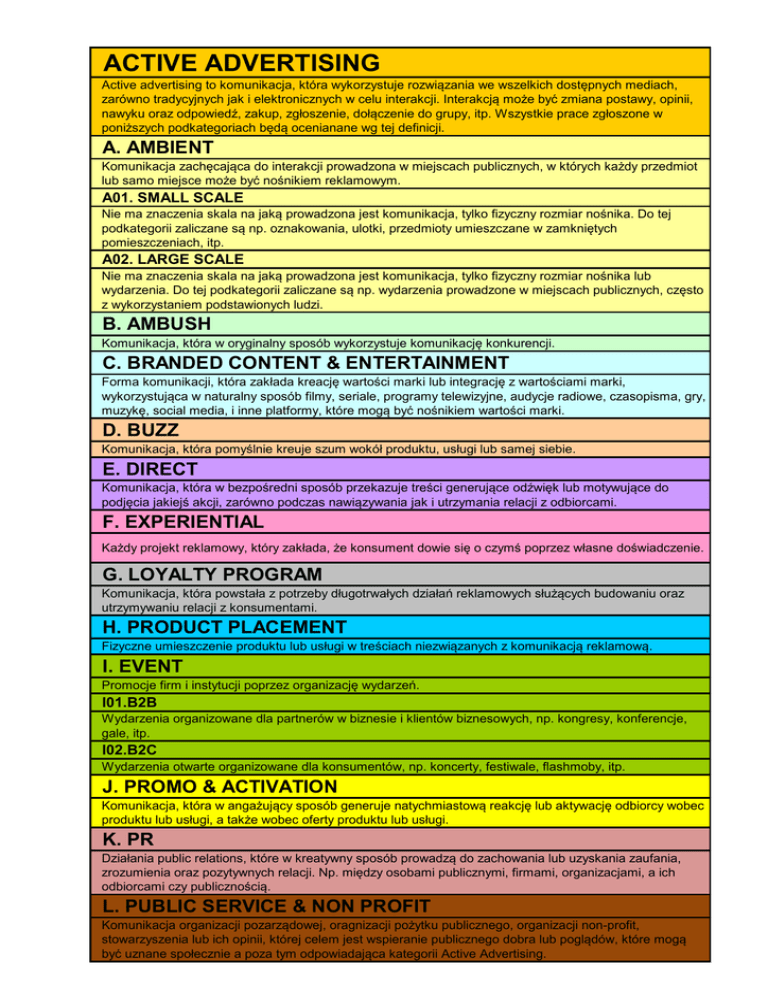 ACTIVE ADVERTISING Active advertising to komunikacja, która wykorzystuje rozwiązania we wszelkich dostępnych mediach, zarówno tradycyjnych jak i elektronicznych w celu interakcji. Interakcją może być zmiana postawy, opinii, nawyku oraz odpowiedź, zakup, zgłoszenie, dołączenie do grupy, itp. Wszystkie prace zgłoszone w poniższych podkategoriach będą ocenianane wg tej definicji. A. AMBIENT Komunikacja zachęcająca do interakcji prowadzona w miejscach publicznych, w których każdy przedmiot lub samo miejsce może być nośnikiem reklamowym. A01. SMALL SCALE Nie ma znaczenia skala na jaką prowadzona jest komunikacja, tylko fizyczny rozmiar nośnika. Do tej podkategorii zaliczane są np. oznakowania, ulotki, przedmioty umieszczane w zamkniętych pomieszczeniach, itp. A02. LARGE SCALE Nie ma znaczenia skala na jaką prowadzona jest komunikacja, tylko fizyczny rozmiar nośnika lub wydarzenia. Do tej podkategorii zaliczane są np. wydarzenia prowadzone w miejscach publicznych, często z wykorzystaniem podstawionych ludzi. B. AMBUSH Komunikacja, która w oryginalny sposób wykorzystuje komunikację konkurencji. C. BRANDED CONTENT & ENTERTAINMENT Forma komunikacji, która zakłada kreację wartości marki lub integrację z wartościami marki, wykorzystująca w naturalny sposób filmy, seriale, programy telewizyjne, audycje radiowe, czasopisma, gry, muzykę, social media, i inne platformy, które mogą być nośnikiem wartości marki. D. BUZZ Komunikacja, która pomyślnie kreuje szum wokół produktu, usługi lub samej siebie. E. DIRECT Komunikacja, która w bezpośredni sposób przekazuje treści generujące odźwięk lub motywujące do podjęcia jakiejś akcji, zarówno podczas nawiązywania jak i utrzymania relacji z odbiorcami. F. EXPERIENTIAL Każdy projekt reklamowy, który zakłada, że konsument dowie się o czymś poprzez własne doświadczenie. G. LOYALTY PROGRAM Komunikacja, która powstała z potrzeby długotrwałych działań reklamowych służących budowaniu oraz utrzymywaniu relacji z konsumentami. H. PRODUCT PLACEMENT Fizyczne umieszczenie produktu lub usługi w treściach niezwiązanych z komunikacją reklamową. I. EVENT Promocje firm i instytucji poprzez organizację wydarzeń. I01.B2B Wydarzenia organizowane dla partnerów w biznesie i klientów biznesowych, np. kongresy, konferencje, gale, itp. I02.B2C Wydarzenia otwarte organizowane dla konsumentów, np. koncerty, festiwale, flashmoby, itp. J. PROMO & ACTIVATION Komunikacja, która w angażujący sposób generuje natychmiastową reakcję lub aktywację odbiorcy wobec produktu lub usługi, a także wobec oferty produktu lub usługi. K. PR Działania public relations, które w kreatywny sposób prowadzą do zachowania lub uzyskania zaufania, zrozumienia oraz pozytywnych relacji. Np. między osobami publicznymi, firmami, organizacjami, a ich odbiorcami czy publicznością. L. PUBLIC SERVICE & NON PROFIT Komunikacja organizacji pozarządowej, oragnizacji pożytku publicznego, organizacji non-profit, stowarzyszenia lub ich opinii, której celem jest wspieranie publicznego dobra lub poglądów, które mogą być uznane społecznie a poza tym odpowiadająca kategorii Active Advertising.