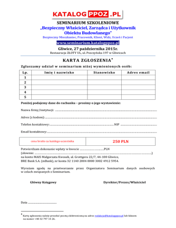 SEMINARIUM SZKOLENIOWE „Bezpieczny Właściciel, Zarządca i Użytkownik Obiektu Budowlanego” Bezpieczny Mieszkaniec, Pracownik, Klient, Widz, Uczeń i Pacjent www.seminarium.katalogppoz.pl Gliwice, 27 października 2015r. Restauracja ZŁOTY UL, ul. Pszczyńska 197 w Gliwicach KARTA ZGŁOSZENIA Zgłaszamy udział w seminarium niżej wymienionych osób: Lp. Imię i nazwisko Stanowisko Adres email 1 2 3 4 5 Poniżej podajemy dane do rachunku – prosimy o jego wystawienie: Nazwa firmy/instytucji: ....................................................................................................................................................... Adres (z kodem): ...................................................................................................................................................................... Telefon kontaktowy: ............................................................................................... NIP ...................................................... Email kontaktowy:................................................................................................................................................................... cena brutto za każdego uczestnika 250 PLN Potwierdzam dokonanie wpłaty w kwocie ……………………..….PLN (słownie: …………………………..………………………………………………………………………………………………….) na konto MAIS Małgorzata Kwosek, ul. Grottgera 22/7, 44-100 Gliwice, BRE Bank S.A. (mBank), nr konta 32 1140 2004 0000 3002 4912 5954. Wyrażam zgodę na przetwarzanie przez Organizatora Seminarium danych osobowych w celach związanych z Seminarium. Główny Księgowy Dyrektor/Prezes/Właściciel Data ........................................... Kartę zgłoszenia należy przesłać pocztą elektroniczną na adres [email protected] lub faksem na numer +48 32 797 14 26.