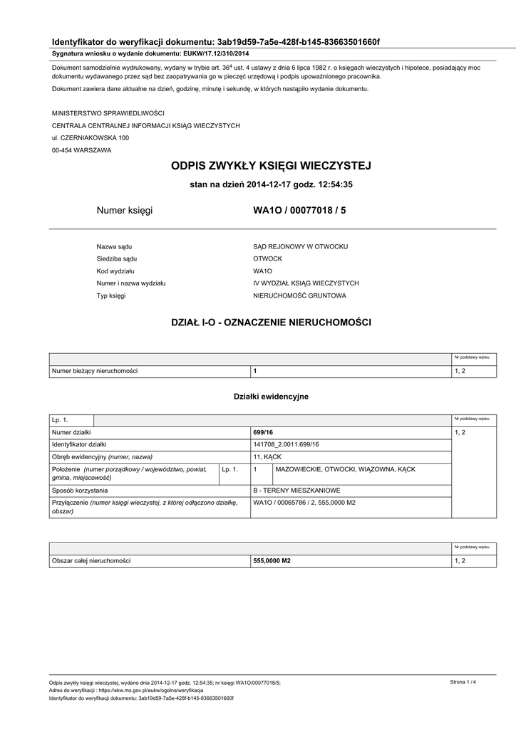 Identyfikator do weryfikacji dokumentu: 3ab19d59-7a5e-428f-b145-83663501660f Sygnatura wniosku o wydanie dokumentu: EUKW/17.12/310/2014 Dokument samodzielnie wydrukowany, wydany w trybie art. 364 ust. 4 ustawy z dnia 6 lipca 1982 r. o księgach wieczystych i hipotece, posiadający moc dokumentu wydawanego przez sąd bez zaopatrywania go w pieczęć urzędową i podpis upoważnionego pracownika. Dokument zawiera dane aktualne na dzień, godzinę, minutę i sekundę, w których nastąpiło wydanie dokumentu. MINISTERSTWO SPRAWIEDLIWOŚCI CENTRALA CENTRALNEJ INFORMACJI KSIĄG WIECZYSTYCH ul. CZERNIAKOWSKA 100 00-454 WARSZAWA ODPIS ZWYKŁY KSIĘGI WIECZYSTEJ stan na dzień 2014-12-17 godz. 12:54:35 Numer księgi WA1O / 00077018 / 5 Nazwa sądu SĄD REJONOWY W OTWOCKU Siedziba sądu OTWOCK Kod wydziału WA1O Numer i nazwa wydziału IV WYDZIAŁ KSIĄG WIECZYSTYCH Typ księgi NIERUCHOMOŚĆ GRUNTOWA DZIAŁ I-O - OZNACZENIE NIERUCHOMOŚCI Nr podstawy wpisu Numer bieżący nieruchomości 1 1, 2 Działki ewidencyjne Nr podstawy wpisu Lp. 1. Numer działki 699/16 Identyfikator działki 141708_2.0011.699/16 Obręb ewidencyjny (numer, nazwa) 11, KĄCK Położenie (numer porządkowy / województwo, powiat, gmina, miejscowość) Lp. 1. 1 1, 2 MAZOWIECKIE, OTWOCKI, WIĄZOWNA, KĄCK Sposób korzystania B - TERENY MIESZKANIOWE Przyłączenie (numer księgi wieczystej, z której odłączono działkę, obszar) WA1O / 00065786 / 2, 555,0000 M2 Nr podstawy wpisu Obszar całej nieruchomości 555,0000 M2 Odpis zwykły księgi wieczystej, wydano dnia 2014-12-17 godz. 12:54:35; nr księgi WA1O/00077018/5; Adres do weryfikacji : https://ekw.ms.gov.pl/eukw/ogolna/weryfikacja Identyfikator do weryfikacji dokumentu: 3ab19d59-7a5e-428f-b145-83663501660f 1, 2 Strona 1 / 4 Sygnatura wniosku o wydanie dokumentu: EUKW/17.12/310/2014 DZIAŁ I-SP - SPIS PRAW ZWIĄZANYCH Z WŁASNOŚCIĄ BRAK WPISÓW DZIAŁ II - WŁASNOŚĆ Właściciele Nr podstawy wpisu Lp. 1. Lista wskazań udziałów w prawie (numer udziału w prawie/ wielkość udziału/rodzaj wspólności) Lp. 1. Inna osoba prawna lub jednostka organizacyjna niebędąca osobą prawną (Nazwa, siedziba, REGON) 1 1 /1 3, 7 GRAFICON FACTORY SPÓŁKA Z OGRANICZONĄ ODPOWIEDZIALNOŚCIĄ SPÓŁKA KOMANDYTOWA, WARSZAWA, 14167534900000 DZIAŁ III - PRAWA, ROSZCZENIA I OGRANICZENIA BRAK WPISÓW DZIAŁ IV - HIPOTEKA Nr podstawy wpisu Lp. 1. Numer hipoteki (roszczenia) 1 Rodzaj hipoteki (roszczenia) HIPOTEKA UMOWNA ŁĄCZNA Suma (słownie), waluta 9900000,00 (DZIEWIĘĆ MILIONÓW DZIEWIĘĆSET TYSIĘCY) ZŁ Wierzytelność i stosunek prawny (numer wierzytelności / wierzytelność, stosunek prawny) Księga współobciążona Lp. 1. Lp. 2. 4, 5, 6, 8 Lp. 1. 1 KREDYT, UMOWA NR 5039959 Z DNIA 29.06.2011R ZMIENIONA ANEKSEM NR 4 Z DNIA 30 KWIETNIA 2014 R., ORAZ UMOWA NR 5039959/1 Z DNIA 30 KWIETNIA 2014 R. Lp. 2. 2 ODSETKI KAPITAŁOWE, KARNE, UMOWA NR 5039959 Z DNIA 29.06.2011R ZMIENIONA ANEKSEM NR 4 Z DNIA 30 KWIETNIA 2014 R., ORAZ UMOWA NR 5039959/1 Z DNIA 30 KWIETNIA 2014 R. Lp. 3. 3 PROWIZJE, UMOWA NR 5039959 Z DNIA 29.06.2011R ZMIENIONA ANEKSEM NR 4 Z DNIA 30 KWIETNIA 2014 R., ORAZ UMOWA NR 5039959/1 Z DNIA 30 KWIETNIA 2014 R. Lp. 4. 4 OPŁATY, KOSZTY WINDYKACJI, KOSZTY POSTĘPOWANIA SĄDOWEGO, EGZEKUCYJNEGO, UMOWA NR 5039959 Z DNIA 29.06.2011R ZMIENIONA ANEKSEM NR 4 Z DNIA 30 KWIETNIA 2014 R., ORAZ UMOWA NR 5039959/1 Z DNIA 30 KWIETNIA 2014 R. Lp. 5. 5 INNE KOSZTY, UMOWA NR 5039959 Z DNIA 29.06.2011R ZMIENIONA ANEKSEM NR 4 Z DNIA 30 KWIETNIA 2014 R., ORAZ UMOWA NR 5039959/1 Z DNIA 30 KWIETNIA 2014 R. Nr księgi wieczystej WA1O / 00066754 / 6 Nr hipoteki 1 Nr księgi wieczystej WA1O / 00077013 / 0 Nr hipoteki 1 Odpis zwykły księgi wieczystej, wydano dnia 2014-12-17 godz. 12:54:35; nr księgi WA1O/00077018/5; Adres do weryfikacji : https://ekw.ms.gov.pl/eukw/ogolna/weryfikacja Identyfikator do weryfikacji dokumentu: 3ab19d59-7a5e-428f-b145-83663501660f Strona 2 / 4 Sygnatura wniosku o wydanie dokumentu: EUKW/17.12/310/2014 Lp. 3. Lp. 4. Lp. 5. Lp. 6. Lp. 7. Nr księgi wieczystej WA1O / 00077014 / 7 Nr hipoteki 1 Nr księgi wieczystej WA1O / 00077015 / 4 Nr hipoteki 1 Nr księgi wieczystej WA1O / 00077012 / 3 Nr hipoteki 1 Nr księgi wieczystej WA1O / 00077017 / 8 Nr hipoteki 1 Nr księgi wieczystej WA1O / 00065786 / 2 Nr hipoteki 1 Wierzyciel hipoteczny Inna osoba prawna lub jednostka organizacyjna niebędąca osobą prawną (nazwa, siedziba, REGON) Lp. 1. WIELKOPOLSKI BANK SPÓŁDZIELCZY- NEOBANK, POZNAŃ, 63001249000000 DOKUMENTY BĘDĄCE PODSTAWĄ WPISU / DANE O WNIOSKU Nr podstawy wpisu 1 MAPA, 2010-06-01, STAROSTA OTWOCKI, OTWOCK; 90, WA1O/00065786/2 (podstawa oznaczenia, data sporządzenia, nazwa organu, siedziba organu; położenie dokumentu - numer karty akt, położenie dokumentu numer księgi wieczystej) DZ. KW./WA1O/00010675/14/001, 2014-12-04 14:32:49, 2014-12-16-13.14.57.796646, NIE, 1-2 (rodzaj i numer dziennika, chwila wpływu, chwila wpisu, czy z urzędu, położenie wniosku – numer karty akt) 2 WYPIS Z REJESTRU GRUNTÓW, 2014-12-04, STAROSTA OTWOCKI, OTWOCK; 4, WA1O/00077012/3 (podstawa oznaczenia, data sporządzenia, nazwa organu, siedziba organu; położenie dokumentu - numer karty akt, położenie dokumentu numer księgi wieczystej) DZ. KW./WA1O/00010675/14/001, 2014-12-04 14:32:49, 2014-12-16-13.14.57.796646, NIE, 1-2 (rodzaj i numer dziennika, chwila wpływu, chwila wpisu, czy z urzędu, położenie wniosku – numer karty akt) 3 UMOWA PRZENIESIENIA WŁASNOŚCI, 1338/2009, 2009-03-23, TADEUSZ SOJKA, WARSZAWA; 25-28, WA1O/00065786/2 (tytuł aktu, numer rep A, data sporządzenia, notariusz – imię/imiona i nazwisko/nazwiska, siedziba; położenie dokumentu - numer karty akt, położenie dokumentu - numer księgi wieczystej) DZ. KW./WA1O/00010675/14/001, 2014-12-04 14:32:49, 2014-12-16-13.14.57.796646, NIE, 1-2 (rodzaj i numer dziennika, chwila wpływu, chwila wpisu, czy z urzędu, położenie wniosku – numer karty akt) 4 OŚWIADCZENIE BANKU, 2011-06-30, 