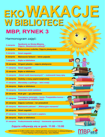3 sierpnia Spotkanie ze Strażą Miejską. Zajęcia „Bezpieczne wakacje” 4 sierpnia Makaronowe cudeńka. Zajęcia plastyczne 5 sierpnia Dzień zagadek 6 sierpnia Malowanie farbami – letnie pejzaże 7 sierpnia Bajka w bibliotece 10 sierpnia Origami płaskie – zajęcia plastyczne 11 sierpnia Dzień zagadek 12 sierpnia Bajka w bibliotece 13 sierpnia „Dzień osób leworęcznych” – malowanki lewą ręką 14 sierpnia Ozdoby z masy papierowej/solnej 17 sierpnia Warsztaty z quillingu – letni motyl 18 sierpnia Bajka w bibliotece 19 sierpnia Kolorowe słoiki ozdobne 20 sierpnia Klub gier – gry planszowe 21 sierpnia Poznajemy zwierzęta – konie. Przejażdżka konna – wycieczka do stadniny koni 24 sierpnia Zajęcia ruchowe – tor przeszkód 25 sierpnia Malowanie palcami – „Wakacyjne marzenia” 26 sierpnia Dzień zagadek 27 sierpnia Kolorowe wycinanki z papieru 28 sierpnia Bajka w bibliotece 31 sierpnia Podsumowanie wakacji – losowanie upominków Dofinansowano ze środków budżetu miasta w Kędzierzynie-Koźlu, przeznaczonych na edukację ekologiczną w ramach Miejskiego Centrum Ekologicznego „Zielona Biblioteka”