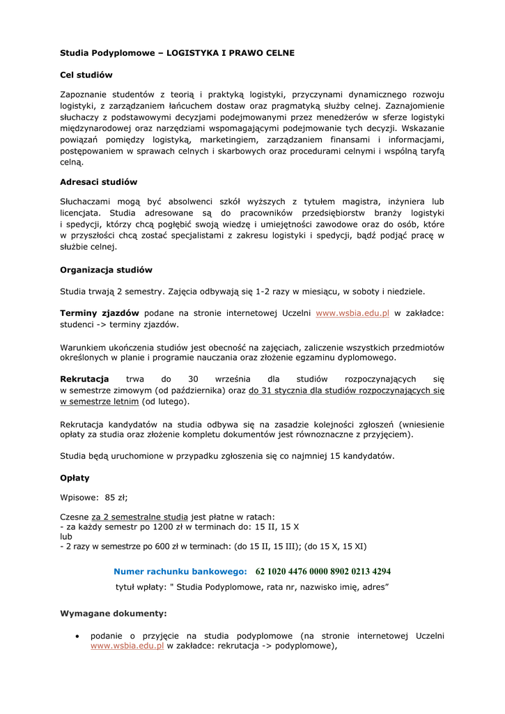 Studia Podyplomowe – LOGISTYKA I PRAWO CELNE Cel studiów Zapoznanie studentów z teorią i praktyką logistyki, przyczynami dynamicznego rozwoju logistyki, z zarządzaniem łańcuchem dostaw oraz pragmatyką służby celnej. Zaznajomienie słuchaczy z podstawowymi decyzjami podejmowanymi przez menedżerów w sferze logistyki międzynarodowej oraz narzędziami wspomagającymi podejmowanie tych decyzji. Wskazanie powiązań pomiędzy logistyką, marketingiem, zarządzaniem finansami i informacjami, postępowaniem w sprawach celnych i skarbowych oraz procedurami celnymi i wspólną taryfą celną. Adresaci studiów Słuchaczami mogą być absolwenci szkół wyższych z tytułem magistra, inżyniera lub licencjata. Studia adresowane są do pracowników przedsiębiorstw branży logistyki i spedycji, którzy chcą pogłębić swoją wiedzę i umiejętności zawodowe oraz do osób, które w przyszłości chcą zostać specjalistami z zakresu logistyki i spedycji, bądź podjąć pracę w służbie celnej. Organizacja studiów Studia trwają 2 semestry. Zajęcia odbywają się 1-2 razy w miesiącu, w soboty i niedziele. Terminy zjazdów podane na stronie internetowej Uczelni www.wsbia.edu.pl w zakładce: studenci -> terminy zjazdów. Warunkiem ukończenia studiów jest obecność na zajęciach, zaliczenie wszystkich przedmiotów określonych w planie i programie nauczania oraz złożenie egzaminu dyplomowego. Rekrutacja trwa do 30 września dla studiów rozpoczynających się w semestrze zimowym (od października) oraz do 31 stycznia dla studiów rozpoczynających się w semestrze letnim (od lutego). Rekrutacja kandydatów na studia odbywa się na zasadzie kolejności zgłoszeń (wniesienie opłaty za studia oraz złożenie kompletu dokumentów jest równoznaczne z przyjęciem). Studia będą uruchomione w przypadku zgłoszenia się co najmniej 15 kandydatów. Opłaty Wpisowe: 85 zł; Czesne za 2 semestralne studia jest płatne w ratach: - za każdy semestr po 1200 zł w terminach do: 15 II, 15 X lub - 2 razy w semestrze po 600 zł w terminach: (do 15 II, 15 III); (do 15 X, 15 XI) Numer rachunku bankowego: 62 1020 4476 0000 8902 0213 4294 tytuł wpłaty: " Studia Podyplomowe, rata nr, nazwisko imię, adres” Wymagane dokumenty: podanie o przyjęcie na studia podyplomowe (na stronie internetowej Uczelni www.wsbia.edu.pl w zakładce: rekrutacja -> podyplomowe), odpis dyplomu ukończenia szkoły wyższej (dyplom licencjata, inżyniera lub magistra), kserokopia 2 stron dowodu osobistego, dowód wpłaty wpisowego, oświadczenie o zapoznaniu się z Regulaminem Studiów WSBiA (Regulamin znajduje się na stronie www.wsbia.edu.pl w zakładce: uczelnia -> akty prawne), 3 fotografie o wymiarach 37x52 mm. Program Studiów STUDIA PODYPLOMOWE - Logistyka i Prawo Celne 1 Zarządzanie procesami logistycznymi 2 Systemy logistyczne 3 Infrastruktura logistyczna 4 Środki transportu i ekonomika transportu 5 Finanse i ubezpieczenia w logistyce 6 Logistyka zaopatrzenia i dystrybucji 7 Logistyka produkcji 8 Systemy informatyczne w logistyce 9 Wprowadzenie do towaroznawstwa i Wspólna Taryfa Celna 10 Unijny Kodeks Celny i polityka handlowa Unii Europejskiej 11 Procedury celne 12 Aspekty postępowania administracyjnego 13 Metody ustalania wartości celnej i należności podatkowych 14 Postępowanie w sprawach celnych i skarbowych 15 Dług celny i jego egzekucja 16 Przestępstwa i wykroczenia celno-skarbowe Razem: 180 godz. 60 pkt. ECTS Wykładowcy Zajęcia prowadzone są przez pracowników Wyższej Szkoły Biznesu oraz praktyków Służby Celnej. Kierownik studiów: prof. nzw. dr hab. Marian Mroziewski