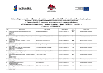 Lista rankingowa wniosków o dofinansowanie projektu w ramach Priorytetu IX Rozwój wykształcenia i kompetencji w regionach Programu Operacyjnego Kapitał Ludzki konkursu na wsparcie realizacji projektów w ramach Działania 9.2 Podniesienie jakości i atrakcyjności szkolnictwa zawodowego z XXIV posiedzenia Komisji Oceny Projektów obradującej w dniach 27.03.2013 r. - 24.04.2013 r. Nr konkursu 1/1/9.2/POKL/2013 Lp. 1. 2. 3. 4. 5. 6. 7. 8. 9. 10. Nazwa i adres Powiat Końskie/Zespół Szkół Ponadgimnazjalnych nr 1 w Końskich ul. Staszica 5 26-200 Końskie Powiat Buski/Specjalny Ośrodek Szkolno - Wychowawczy w Broninie Bronina 59 28-100 Busko - Zdrój Powiat Kielecki / Powiatowy Urząd Pracy w Kielcach ul. Kolberga 4 25-620 Kielce Centrum Rozwoju Edukacji Renata Mamroł Plac Na Stawach 1/500 30-107 Kraków Gmina Kielce/Zespół Szkół Elektrycznych w Kielcach ul. Prezydenta R. Kaczorowskiego 8 25-317 Kielce Gmina Kielce/Zespół Szkół Elektrycznych ul. Prezydenta R. Kaczorowskiego 8 25-317 Kielce Stowarzyszenie Lokalna Grupa Działania "Ziemia Jędrzejowska Gryf" ul. Armii Krajowej 9 28-300 Jędrzejów Stowarzyszenie Edukacja przez Internet ul. Olszewskiego 6 25-663 Kielce Powiat Ostrowiecki/Zespół Szkól Nr 4 ul. Adama Mickiewicza 1 27-400 Ostrowiec Świętokrzyski Powiat Pińczowski/ Zespół Szkół Zawodowych im. Stanisława Staszica w Pińczowie ul. Spółdzielcza 6 28-400 Pińczów Szkoła zawodowego sukcesu POKL.09.02.00-26-077/13 Pkt ogółem 105,5 Nowe umiejętności - Większe moŜliwości POKL.09.02.00-26-059/13 104 Wniosek oceniony pozytywnie Rozwój uczniów, rozwojem szkoły! POKL.09.02.00-26-037/13 100 Wniosek oceniony pozytywnie Zawodowcy z Włoszczowy POKL.09.02.00-26-047/13 91,5 Wniosek oceniony pozytywnie Przyszłość dla elektronika i energetyka POKL.09.02.00-26-015/13 88 Wniosek oceniony pozytywnie Kształcenie praktyczne gwarancją sukcesu POKL.09.02.00-26-081/13 87,5 Wniosek oceniony pozytywnie Praktyka szansą na sukces POKL.09.02.00-26-009/13 87,5 Wniosek oceniony pozytywnie Szkoła, staŜ, praca-Twoja droga do sukcesu! POKL.09.02.00-26-053/13 87,5 Wniosek oceniony pozytywnie StaŜ - praca - kariera! POKL.09.02.00-26-007/13 87 Wniosek oceniony pozytywnie Dobry zawód - pewna przyszłość POKL.09.02.00-26-046/13 86 Wniosek oceniony pozytywnie Tytuł Projektu Numer wniosku Wynik oceny Wniosek oceniony pozytywnie 11. 12. 13. 14. 15. 16. 17. 18. 19. 20. 21. 22. 23. 24. 25. Agencja Rozwoju Lokalnego Sp. z o.o. w Ostrowcu Świętokrzyskim ul. Sandomierska 26 a 27-400 Ostrowiec Świętokrzyski Agencja Rozwoju Lokalnego Sp. z o. o. w Ostrowcu Świętokrzyskim ul. Sandomierska 26a 27-400 Ostrowiec Świętokrzyski Zakład Doskonalenia Zawodowego w Kielcach ul. Paderewskiego 55 25-950 Kielce WyŜsza Szkoła Ekonomii i Prawa im. prof. Edwarda Lipińskiego w Kielcach ul. Jagiellońska 109 A 25-734 Kielce Stowarzyszenie Nadzieja Rodzinie ul. Karczówkowska 36 25-711 Kielce Stowarzyszenie PROREW ul. Szymanowskiego 3/58 25-361 Kielce Powiat Kielce/ Zespół Szkół Ponadgimnazjalnych Nr 5 w Łopusznie ul. Konecka 2 26-070 Łopuszno Powiat Kielce/ Zespół Szkół Ponadgimnazjalnych Nr 5 w Łopusznie ul. Konecka 2 26-070 Łopuszno ŚWIĘTOKRZYSKIE CENTRUM SZKOLENIOWE Tomasz Zagrajek ul. Świętokrzyska 1A 27-400 Ostrowiec Świętokrzyski Gmina Kielce/Zespół Szkół Przemysłu SpoŜywczego Rynek 1 25-303 Kielce Zakład Doskonalenia Zawodowego w Kielcach ul. Paderewskiego 55 25-950 Kielce Gmina Suchedniów/Zespół Szkół im. Henryka Sienkiewicza w Suchedniowie ul. Sportowa 3 26-130 Suchedniów Fundacja na Rzecz Wspierania Rodziny oraz Dzieci i MłodzieŜy "Fundacja z Uśmiechem" ul. Paderewskiego 11/39 25-001 Kielce ZAPROJEKTUJ SWOJĄ KARIERĘ! POKL.09.02.00-26-078/13 86 Wniosek oceniony pozytywnie TWOJA SZKOŁA - TWÓJ SUKCES POKL.09.02.00-26-022/13 86 Wniosek oceniony pozytywnie Innowacje Twoją szansą! POKL.09.02.00-26-074/13 82 Wniosek oceniony pozytywnie Masz zawód- masz pracę POKL.09.02.00-26-005/13 81,5 Wniosek oceniony pozytywnie Informatyka - moja przyszłość POKL.09.02.00-26-071/13 79,5 Wniosek oceniony pozytywnie Absolwent na rynku pracy 2 POKL.09.02.00-26-035/13 79 Wniosek oceniony pozytywnie Skazani na sukces POKL.09.02.00-26-051/13 77,5 Wniosek oceniony pozytywnie Nowoczesne kształcenie kluczem do Europy POKL.09.02.00-26-062/13 77,5 Wniosek oceniony pozytywnie First Step-up Manager - inwestycją w przyszłość poprzez rozwój kluczowych kompetencji POKL.09.02.00-26-055/13 77 Wniosek oceniony pozytywnie WyŜsza poprzeczka w kształceniu lepszy start w przyszłość POKL.09.02.00-26-008/13 76,5 Wniosek oceniony pozytywnie Specjaliści w zawodzie POKL.09.02.00-26-043/13 76 Wniosek oceniony pozytywnie Suchedniowscy zawodowcy POKL.09.02.00-26-044/13 74,5 Wniosek oceniony pozytywnie Chcesz dostać pracę - zdobądź dodatkowe kwalifikacje POKL.09.02.00-26-023/13 62,5 Wniosek oceniony pozytywnie POKL.09.02.00-26-016/13 65,5 POKL.09.02.00-26-010/13 64,5 Wniosek odrzucony: wniosek nie uzyskał 60% pkt. w częściach wniosku podlegających ocenie* Wniosek odrzucony: wniosek nie uzyskał 60% pkt. W częściach wniosku podlegających ocenie* Powiat Kazimierski Gotowi na wyzwania II ul. Tadeusza Kościuszki 12 28-500 Kazimierza Wielka Technikum Zawodowe "Uniwerek" w Kielcach/Świętokrzyskie Kompetencje miarą sukcesu zawodowego Centrum Kształcenia MłodzieŜy i Dorosłych "Uniwerek" Sp. z o. o. Plac Niepodległości 1 25-506 Kielce 26. 27. 28. 29. 30. 31. 32. 33. 34. 35. 36. 37. 38. 39. 40. 41. 42. Stowarzyszenie Przestrzeń Inicjatyw Społeczno Kulturalnych PISK Sudoł 115 27-400 Ostrowiec Świętokrzyski Stowarzyszenie Lokalna Grupa Działania "Perły Czarnej Nidy" ul. Kielecka 38 26-026 Morawica Firma Handlowo-Usługowa Biuro Rachunkowe Proffice Aneta Florczyk-Dziurdź ul. Gimnazjalna 125 26-200 Końskie Powiat Kielecki/Zespół Szkół nr 8 w Nowej Słupi ul. Szkolna 10 26-006 Nowa Słupia Sidrom Sp. z o.o. ul. Bohaterów Warszawy 7 28-100 Busko - Zdr