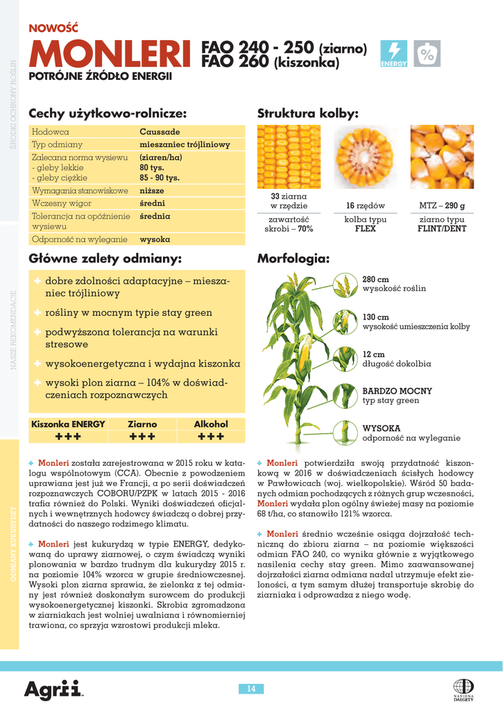 ŚRODKI OCHRONY ROŚLIN NOWOŚĆ MONLERI POTRÓJNE ŹRÓDŁO ENERGII FAO 240 - 250 (ziarno) FAO 260 (kiszonka) Struktura kolby: Cechy użytkowo-rolnicze: Hodowca Caussade Typ odmiany mieszaniec trójliniowy Zalecana norma wysiewu - gleby lekkie - gleby ciężkie (ziaren/ha) 80 tys. 85 - 90 tys. Wymagania stanowiskowe niższe Wczesny wigor średni Tolerancja na opóźnienie wysiewu średnia Odporność na wyleganie wysoka Główne zalety odmiany: NASZE REKOMENDACJE ® rośliny w mocnym typie stay green stresowe ® wysoki plon ziarna – 104% w doświad- kolba typu FLEX ziarno typu FLINT/DENT BARDZO MOCNY typ stay green czeniach rozpoznawczych ODMIANY KUKURYDZY zawartość skrobi – 70% 12 cm długość dokolbia ® wysokoenergetyczna i wydajna kiszonka +++ MTZ – 290 g 130 cm wysokość umieszczenia kolby ® podwyższona tolerancja na warunki +++ 16 rzędów 280 cm wysokość roślin niec trójliniowy Ziarno 33 ziarna w rzędzie Morfologia: ® dobre zdolności adaptacyjne – miesza- Kiszonka ENERGY ENERGY Alkohol WYSOKA odporność na wyleganie +++ Monleri została zarejestrowana w 2015 roku w katalogu wspólnotowym (CCA). Obecnie z powodzeniem uprawiana jest już we Francji, a po serii doświadczeń rozpoznawczych COBORU/PZPK w latach 2015 - 2016 trafia również do Polski. Wyniki doświadczeń oficjalnych i wewnętrznych hodowcy świadczą o dobrej przydatności do naszego rodzimego klimatu. Monleri potwierdziła swoją przydatność kiszonkową w 2016 w doświadczeniach ścisłych hodowcy w Pawłowicach (woj. wielkopolskie). Wśród 50 badanych odmian pochodzących z różnych grup wczesności, Monleri wydała plon ogólny świeżej masy na poziomie 68 t/ha, co stanowiło 121% wzorca. Monleri średnio wcześnie osiąga dojrzałość techniczną do zbioru ziarna – na poziomie większości odmian FAO 240, co wynika głównie z wyjątkowego nasilenia cechy stay green. Mimo zaawansowanej dojrzałości ziarna odmiana nadal utrzymuje efekt zieloności, a tym samym dłużej transportuje skrobię do ziarniaka i odprowadza z niego wodę. Monleri jest kukurydzą w typie ENERGY, dedykowaną do uprawy ziarnowej, o czym świadczą wyniki plonowania w bardzo trudnym dla kukurydzy 2015 r. na poziomie 104% wzorca w grupie średniowczesnej. Wysoki plon ziarna sprawia, że zielonka z tej odmiany jest również doskonałym surowcem do produkcji wysokoenergetycznej kiszonki. Skrobia zgromadzona w ziarniakach jest wolniej uwalniana i równomierniej trawiona, co sprzyja wzrostowi produkcji mleka. 14