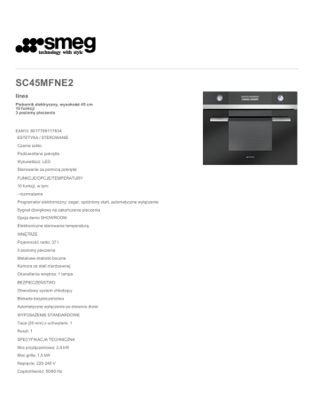 SC45MFNE2 linea Piekarnik elektryczny, wysokość 45 cm 10 funkcji 3 poziomy pieczenia EAN13: 8017709117634 ESTETYKA / STEROWANIE Czarne szkło Podświetlane pokrętła Wyświetlacz: LED Sterowanie za pomocą pokręteł FUNKCJE/OPCJE/TEMPERATURY 10 funkcji, w tym: - rozmrażanie Programator elektroniczny: zegar, opóźniony start, automatyczne wyłączenie Sygnał dźwiękowy na zakończenie pieczenia Opcja demo SHOWROOM Elektroniczne sterowanie temperaturą WNĘTRZE Pojemność netto: 37 l 3 poziomy pieczenia Metalowe drabinki boczne Komora ze stali nierdzewnej Oświetlenie wnętrza: 1 lampa BEZPIECZEŃSTWO Obwodowy system chłodzący Blokada bezpieczeństwa Automatyczne wyłączenie po otwarciu drzwi WYPOSAŻENIE STANDARDOWE Taca (20 mm) z uchwytami: 1 Ruszt: 1 SPECYFIKACJA TECHNICZNA Moc przyłączeniowa: 2,9 kW Moc grilla: 1,5 kW Napięcie: 220-240 V Częstotliwość: 50/60 Hz Functions Wersje SC45MF2 - srebrne szkło Stopsol + stal nierdzewna SMEG S.p.A. Via Leonardo da Vinci, 4 42016 Guastalla (RE) Tel. 0522 821 1 SC45MFNE2 linea URZĄDZENIA KOMPAKTOWE 60 cm czarne szkło klasa energochłonności A piekarniki elektryczne Klasa A: Klasa A piekarnika zapewnia niskie zużycie energii. URZADZENIA KOMPAKTOWE: Urządzenia o wysokości 45 cm, o różnym zastosowaniu i funkcjach. Występują w różnych liniach wzorniczych. DUŻA POJEMNOŚĆ: Wybrane piekarniki firmy Smeg o wysokości 60 cm posiadają dużą pojemność netto - 37 l PRZYGOTOWYWANIE POTRAW NA WIELU POZIOMACH: Jednoczesne pieczenie kilku potraw na rożnych poziomach w naszych piekarnikach elektrycznych umożliwia przygotowanie całego dania bez mieszania się zapachów. Dzięki temu zyskujemy znaczną oszczędność czasu i energii, niezbędnej do przygotowania potraw. POZIOMY PIEKARNIKA: Piekarniki firmy SMEG z maksymalna pojemnością 72 litrów posiadają 3 poziomów, co zapewnia maksymalną elastyczność w użytkowaniu. Pozwala to na oszczędność czasu potrzebnego do przyrządzenia kilku potraw w tym samym czasie albo konieczności przygotowania dużych ilości. POTRÓJNIE OSZKLONE DRZWI: Zewnętrzna powierzchnia nawet podczas długiego pieczenia pozostaje zimna, co zapewnia maksymalne bezpieczeństwo użytkowania. Natomiast dwie wewnętrzne szyby odbijają ciepło, co ma znaczenie dla efektywności używanej energii. ELEKTRONICZNA KONTROLA TEMPERATURY: Pozwala na utrzymanie temperatury we wnętrzu piekarnika w granicach tolerancji 2-3 ° C. Umożliwia to przyrządzanie dań wrażliwych na zmiany temperatury np. ciast, sufletów, puddingów. STATYCZNY SYSTEM CHŁODZENIA: Innowacyjny STATYCZNY system chłodzenia pomaga chronić meble od nadmiernej temperatury podczas pracy urządzenia. BLOKADA BEZPIECZEŃSTWA: Blokady przeciwko dzieciom są stosowane w takich urządzeniach jak kuchenki, płyty grzewcze i zmywarki. Gdy opcja jest włączona wszystkie funkcje i programy są zablokowane, włącznie z funkcjami włączania i wyłączania urządzenia, co zapewnia pełne bezpieczeństwo dla dzieci. OŚWIETLENIE WNĘTRZA LED: Wybrane modele zostały wyposażone w wewnętrzne oświetlenie LED, które gwarantuje oszczędność energii elektrycznej oraz świeże i dokładne oświetlenie wnętrza. PODŚWIETLANE POKRĘTŁA: W niektórych modelach piekarników firmy SMEG, ekspresów do kawy i płyt grzewczych pokrętła są podświetlane, kiedy urządzenie jest włączone. Ten sam mechanizm działa w niektórych płytach grzewczych, kiedy gaz jest włączony, co dodatkowo służy bezpieczeństwu. GRZAŁKA GÓRNA I DOLNA: Włączenie tych 2 grzałek stosuje się w pieczeniu tradycyjnym, odpowiednim do przygotowanie potraw wymagających delikatnego podgrzewania, jak np. pieczenie ciasta. Piekarnik powinien zostać wstępnie nagrzany do wymaganej temperatury, a naczynie ustawione po środku. Jest to metoda , która najlepiej sprawdza się w przypadku większych, pojedynczych wypieków. 1/2 GRZAŁKA GRILLA: Funkcja uzywana do szybkiego podgrzewania małych potraw. Tylko środkowa część grzałki jest aktywna. GRZAŁKA GRILLA: Funkcja uzywana do szybkiego podgrzewania. Aby uzyskać najlepsze rezultaty należy małe potrawy umieścić na górnej półce, a potrawy większe - na dolnej (np. mięso, lub kiełbasę). Najlepsze efekty uzyskuje się przy zamkniętych drzwiczkach, chyba że przepis podpowiada co innego. ECO: Ustawienie ECO pozwala na szybkie wstępne podgrzanie piekarnika. Włączenie dolnej grzałki, grzałki grilla i wentylatora zapewnienia optymalną wydajność. Funkcja jest użyteczna w połączeniu z wybranym zasadniczym programem pieczenia. WENTYLATOR, GRZAŁKA GÓRNA I DOLNA: Grzałki w połączeniu z wentylatorem zapewniają równomierną temperaturę w całej komorze. Jest to metoda dająca podobne efekty do pieczenia tradycyjnego. Mniej wydajna od użycia wentylatora i 3 grzalek. Najlepsza do wypieku ciast. WENTYLATOR I GRZAŁKA GRILLA: Pieczenie przy uzyciu tej funkcji musi przebiegać przy zamkniętych drzwiczkach. Wentylator łagodzi silne grzanie grilla, jednocześnie zapewniając doskonałe grillowanie bez potrzeby odwracania pieczonej potrawy. Otrzymujemy potrawę doskonale przypieczoną, a zarazem soczystą. Najlepsze efekty zapewnia pieczenie na dwóch górnych półkach. Dolna część piekarnika może być w tym czasie wykorzystana do podgrzania innych potraw. WENTYLATOR, GRZAŁKA DOLNA: Dodanie dolnej grzałki do wymuszonego obiegu podnosi temperaturę w dolnej części potrawy, zapewniając jej skuteczniejsze pieczenie środka bez przypiekania powierzchni. WENTYLATOR, GRZAŁKA PIERŚCIENIOWA: Grzałka w połączeniu z wentylatorem zapewniają równomierną temperaturę w całej komorze, na wszystkich półkach. Podczas pieczenia potraw ponad 20 minut, niepotrzebne jest stosowanie wstepnego rozgrzania piekarnika. Jest to metoda dająca oszczędność energii, kótszy czas podgrzewania. idealna do odgrzewania zimnych potraw. WENTYLATOR, GRZAŁKA PIERŚCIENIOWA, GÓRNA I DOLNA: Grzałki w połączeniu z w
