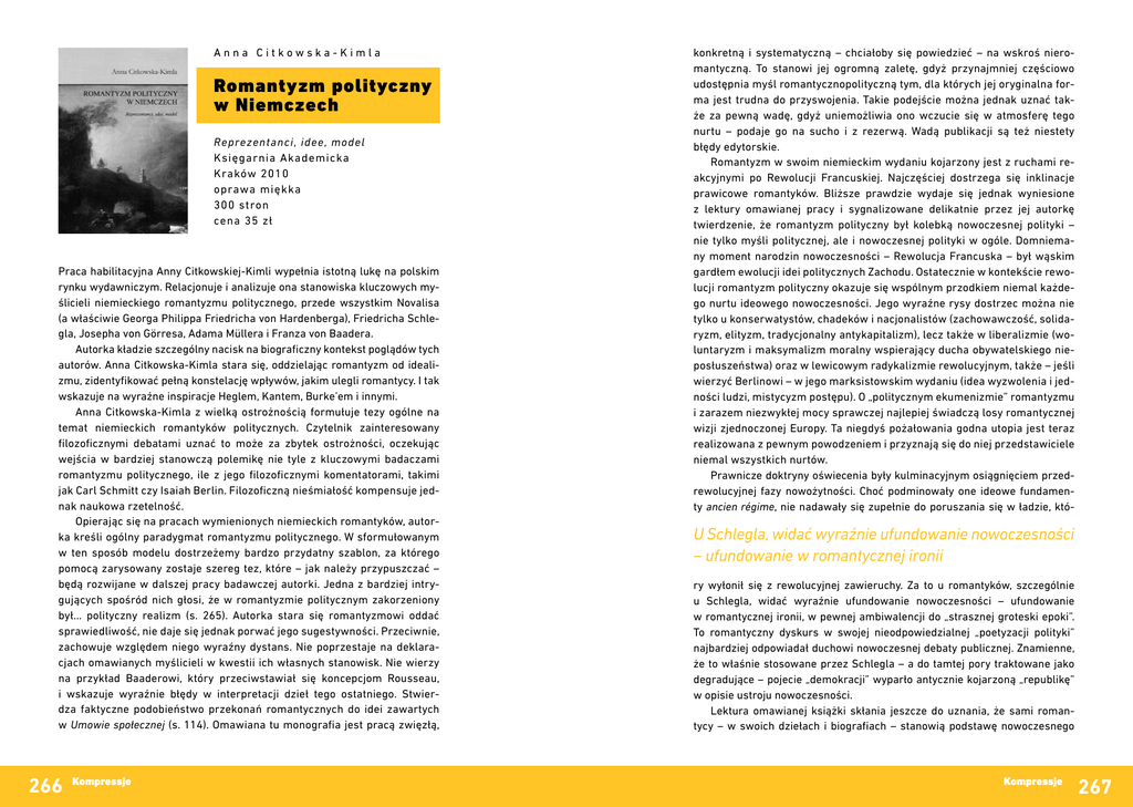 Anna Citkowska-Kimla Romantyzm polityczny w Niemczech Reprezentanci, idee, model Księgarnia Akademicka Kraków 2010 oprawa miękka 300 stron cena 35 zł Praca habilitacyjna Anny Citkowskiej-Kimli wypełnia istotną lukę na polskim rynku wydawniczym. Relacjonuje i analizuje ona stanowiska kluczowych myślicieli niemieckiego romantyzmu politycznego, przede wszystkim Novalisa (a właściwie Georga Philippa Friedricha von Hardenberga), Friedricha Schlegla, Josepha von Görresa, Adama Müllera i Franza von Baadera. Autorka kładzie szczególny nacisk na biograficzny kontekst poglądów tych autorów. Anna Citkowska-Kimla stara się, oddzielając romantyzm od idealizmu, zidentyfikować pełną konstelację wpływów, jakim ulegli romantycy. I tak wskazuje na wyraźne inspiracje Heglem, Kantem, Burke’em i innymi. Anna Citkowska-Kimla z wielką ostrożnością formułuje tezy ogólne na temat niemieckich romantyków politycznych. Czytelnik zainteresowany filozoficznymi debatami uznać to może za zbytek ostrożności, oczekując wejścia w bardziej stanowczą polemikę nie tyle z kluczowymi badaczami romantyzmu politycznego, ile z jego filozoficznymi komentatorami, takimi jak Carl Schmitt czy Isaiah Berlin. Filozoficzną nieśmiałość kompensuje jednak naukowa rzetelność. Opierając się na pracach wymienionych niemieckich romantyków, autorka kreśli ogólny paradygmat romantyzmu politycznego. W sformułowanym w ten sposób modelu dostrzeżemy bardzo przydatny szablon, za którego pomocą zarysowany zostaje szereg tez, które – jak należy przypuszczać – będą rozwijane w dalszej pracy badawczej autorki. Jedna z bardziej intrygujących spośród nich głosi, że w romantyzmie politycznym zakorzeniony był… polityczny realizm (s. 265). Autorka stara się romantyzmowi oddać sprawiedliwość, nie daje się jednak porwać jego sugestywności. Przeciwnie, zachowuje względem niego wyraźny dystans. Nie poprzestaje na deklaracjach omawianych myślicieli w kwestii ich własnych stanowisk. Nie wierzy na przykład Baaderowi, który przeciwstawiał się koncepcjom Rousseau, i wskazuje wyraźnie błędy w interpretacji dzieł tego ostatniego. Stwierdza faktyczne podobieństwo przekonań romantycznych do idei zawartych w Umowie społecznej (s. 114). Omawiana tu monografia jest pracą zwięzłą, 266 Kompressje konkretną i systematyczną – chciałoby się powiedzieć – na wskroś nieromantyczną. To stanowi jej ogromną zaletę, gdyż przynajmniej częściowo udostępnia myśl romantycznopolityczną tym, dla których jej oryginalna forma jest trudna do przyswojenia. Takie podejście można jednak uznać także za pewną wadę, gdyż uniemożliwia ono wczucie się w atmosferę tego nurtu – podaje go na sucho i z rezerwą. Wadą publikacji są też niestety błędy edytorskie. Romantyzm w swoim niemieckim wydaniu kojarzony jest z ruchami reakcyjnymi po Rewolucji Francuskiej. Najczęściej dostrzega się inklinacje prawicowe romantyków. Bliższe prawdzie wydaje się jednak wyniesione z lektury omawianej pracy i sygnalizowane delikatnie przez jej autorkę twierdzenie, że romantyzm polityczny był kolebką nowoczesnej polityki – nie tylko myśli politycznej, ale i nowoczesnej polityki w ogóle. Domniemany moment narodzin nowoczesności – Rewolucja Francuska – był wąskim gardłem ewolucji idei politycznych Zachodu. Ostatecznie w kontekście rewolucji romantyzm polityczny okazuje się wspólnym przodkiem niemal każdego nurtu ideowego nowoczesności. Jego wyraźne rysy dostrzec można nie tylko u konserwatystów, chadeków i nacjonalistów (zachowawczość, solidaryzm, elityzm, tradycjonalny antykapitalizm), lecz także w liberalizmie (woluntaryzm i maksymalizm moralny wspierający ducha obywatelskiego nieposłuszeństwa) oraz w lewicowym radykalizmie rewolucyjnym, także – jeśli wierzyć Berlinowi – w jego marksistowskim wydaniu (idea wyzwolenia i jedności ludzi, mistycyzm postępu). O „politycznym ekumenizmie” romantyzmu i zarazem niezwykłej mocy sprawczej najlepiej świadczą losy romantycznej wizji zjednoczonej Europy. Ta niegdyś pożałowania godna utopia jest teraz realizowana z pewnym powodzeniem i przyznają się do niej przedstawiciele niemal wszystkich nurtów. Prawnicze doktryny oświecenia były kulminacyjnym osiągnięciem przedrewolucyjnej fazy nowożytności. Choć podminowały one ideowe fundamenty ancien régime, nie nadawały się zupełnie do poruszania się w ładzie, któ- U Schlegla, widać wyraźnie ufundowanie nowoczesności – ufundowanie w romantycznej ironii ry wyłonił się z rewolucyjnej zawieruchy. Za to u romantyków, szczególnie u Schlegla, widać wyraźnie ufundowanie nowoczesności – ufundowanie w romantycznej ironii, w pewnej ambiwalencji do „strasznej groteski epoki”. To romantyczny dyskurs w swojej nieodpowiedzialnej „poetyzacji polityki” najbardziej odpowiadał duchowi nowoczesnej debaty publicznej. Znamienne, że to właśnie stosowane przez Schlegla – a do tamtej pory traktowane jako degradujące – pojecie „demokracji” wyparło antycznie kojarzoną „republikę” w opisie ustroju nowoczesności. Lektura omawianej książki skłania jeszcze do uznania, że sami romantycy – w swoich dziełach i biografiach – stanowią podstawę nowoczesnego Kompressje 267 podziału socjopolitycznego, który jeszcze bardziej właściwy jest dla naszej ponowoczesności. Podział ten przetrwał wszystkie doraźne podziały frakcyjne i partyjne na państwo i Kościół, burżuazję i arystokrację, miasto i wieś, pracodawców i pracobiorców. Chodzi o podział, który zrozumieliśmy dopiero po 1968 roku – podział na młodych i starych. To właśnie wtedy zbuntowana młodzież w kinach w USA i Europie usłyszała z ust Charltona Hestona: „Pamiętaj, nigdy nie ufaj nikomu po trzydziestce”. Ten właśnie podział – mieszczący się w życiorysie niejednego romantyka – wyznaczał stosunek do kluczowych problemów poli