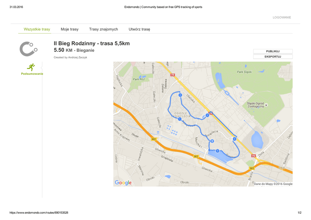 31.03.2016 Endomondo | Community based on free GPS tracking of sports LOGOWANIE Wszystkie trasy Moje trasy Trasy znajomych Utwórz trasę II Bieg Rodzinny trasa 5,5km 5.50 KM Bieganie Created by Andrzej Zaczyk PUBLIKUJ EKSPORTUJ Podsumowanie Dane do Mapy ©2016 Google https://www.endomondo.com/routes/690153528 1/2 31.03.2016 Endomondo | Community based on free GPS tracking of sports O nas Blog Prasa Dla rm https://www.endomondo.com/routes/690153528 Funkcje Sklep Regulamin i prywatność Pomoc Polski 2/2