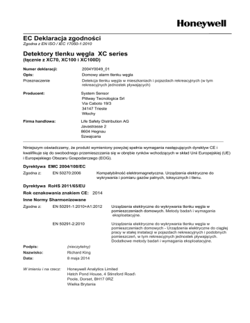 EC Deklaracja zgodności Zgodna z EN ISO / IEC 17050-1:2010 Detektory tlenku węgla XC series (łącznie z XC70, XC100 i XC100D) Numer deklaracji: 2004Y0049_01 Opis: Domowy alarm tlenku węgla Przeznaczenie Detekcja tlenku węgla w mieszkaniach i pojazdach rekreacyjnych (w tym rekreacyjnych jednostek pływających) Producent: System Sensor Pittway Tecnologica Srl Via Caboto 19/3 34147 Trieste Włochy Firma handlowa: Life Safety Distribution AG Javastrasse 2 8604 Hegnau Szwajcaria Niniejszym oświadczamy, że produkt wymieniony powyżej spełnia wymagania następujących dyrektyw CE i kwalifikuje się do swobodnego przemieszczania się w obrębie rynków wchodzących w skład Unii Europejskiej (UE) i Europejskiego Obszaru Gospodarczego (EOG). Dyrektywa EMC 2004/108/EC Zgodna z: EN 50270:2006 Kompatybilność elektromagnetyczna. Urządzenia elektryczne do wykrywania i pomiaru gazów palnych, toksycznych i tlenu. Dyrektywa RoHS 2011/65/EU Rok oznakowania znakiem CE: 2014 Inne Normy Sharmonizowane Zgodne z: EN 50291-1:2010+A1:2012 Urządzenia elektryczne do wykrywania tlenku węgla w pomieszczeniach domowych. Metody badań i wymagania eksploatacyjne. EN 50291-2:2010 Urządzenia elektryczne do wykrywania tlenku węgla w pomieszczeniach domowych - Urządzenia elektryczne do ciągłej pracy w stałej instalacji w pojazdach rekreacyjnych i podobnych pomieszczeń, w tym rekreacyjnych jednostek pływających. Dodatkowe metody badań i wymagania eksploatacyjne. Podpis: (nieczytelny) Nazwisko: Richard King Data: 8 maja 2014 W imieniu i na rzecz: Honeywell Analytics Limited Hatch Pond House, 4 Stinsford Road\ Poole, Dorset, BH17 0RZ Wielka Brytania EC Declaration of Conformity In accordance with EN ISO / IEC 17050-1:2010 XC Series CO Alarms (including XC70, XC100 & XC100D) Declaration Number: Description: Intended Use: 2004Y0049_01 Domestic Carbon Monoxide Alarm Carbon monoxide detection in dwellings and recreational vehicles (including recreational craft) Manufacturer: System Sensor Pittway Tecnologica Srl Via Caboto 19/3 34147 Trieste Italy Trading Company: Life Safety Distribution AG Javastrasse 2 8604 Hegnau Switzerland We hereby declare that the product identified above meets the requirements of the following EC Directives and therefore qualifies for free movement within markets comprising the European Union (EU) and the European Economic Area (EEA). EMC Directive 2004/108/EC Conforms to: EN 50270:2006 Electromagnetic compatibility. Electrical apparatus for the detection and measurement of combustible gases, toxic gases and oxygen RoHS Directive 2011/65/EU Year of CE Marking: 2014 Other Harmonised Standards Conforms to: EN 50291-1:2010+A1:2012 Electrical apparatus for the detection of carbon monoxide in domestic premises Test methods and performance requirements EN 50291-2:2010 Electrical apparatus for the detection of carbon monoxide in domestic premises -Electrical apparatus for continuous operation in a fixed installation in recreational vehicles and similar premises including recreational craft. Additional test methods and performance requirements Signature: Name: Richard King Date: 8th May 2014 For and on behalf of: Honeywell Analytics Limited Hatch Pond House, 4 Stinsford Road Poole, Dorset. BH17 0RZ United Kingdom A04306 Registered Office: Honeywell House, Arlington Business Park, Bracknell, Berkshire RG12 1EB Registered in England No. 412070