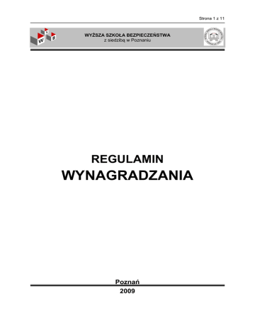 Strona 1 z 11 WYŻSZA SZKOŁA BEZPIECZEŃSTWA z siedzibą w Poznaniu REGULAMIN WYNAGRADZANIA Poznań 2009 Strona 2 z 11 SPIS TREŚCI: Rozdział 1 Przepisy ogólne............................................................................................... strona 3 Rozdział 2 Wynagrodzenie za pracę................................................................................. 3 Rozdział 3 Świadczenia związane z pracą........................................................................ 4 Rozdział 4 Przepisy końcowe............................................................................................ 7 Strona 3 z 11 Rozdział 1 PRZEPISY OGÓLNE § 1. Podstawę prawną Regulaminu Wynagradzania Wyższej Szkoły Bezpieczeństwa stanowią przepisy art. 772 Kodeksu pracy (Dz.U. z 1998 r. Nr 21, poz. 94 z późn. zm.) oraz ustawy z dnia 27 lipca 2005 r. - Prawo o szkolnictwie wyższym (Dz. U. Nr 164, poz. 1365 ze zm.) § 2. Regulamin wynagradzania określa warunki wynagrodzenia za pracę i przyznawania innych świadczeń związanych z pracą w Wyższej Szkole Bezpieczeństwa (dalej WSB). § 3. Ilekroć w Regulaminie jest mowa o: 1) regulaminie – należy przez to rozumieć Regulamin Wynagradzania obowiązujący w WSB; 2) pracodawcy lub Uczelni – należy przez to rozumieć Wyższą Szkołę Bezpieczeństwa z siedzibą w Poznaniu; 3) pracownikach – należy przez to rozumieć wszystkie osoby zatrudnione w WSB na podstawie przepisów prawa pracy, bez względu na charakter zawartej umowy, rodzaj wykonywanej pracy, zajmowane stanowisko i wymiar czasu pracy; 4) wynagrodzeniu zasadniczym – należy przez to rozumieć wynagrodzenie wynikające z indywidualnie przyznanej danemu pracownikowi, w umowie o pracę, stawce wynagrodzenia zasadniczego; 5) prawie pracy – należy przez to rozumieć wszystkie przepisy prawa pracy, a przede wszystkim Kodeksu pracy, regulujące stosunki pomiędzy pracodawcą i pracownikami; 6) rektorze WSB – należy przez to rozumieć organ zarządzający Uczelnią w rozumieniu ustawy Kodeks pracy. § 4. 1. Regulamin dotyczy wszystkich pracowników WSB bez względu na zajmowane stanowisko i rodzaj wykonywanej pracy. 2. Przed dopuszczeniem nowo zatrudnionego do pracy, pracodawca lub inna uprawniona osoba zaznajamia go z treścią Regulaminu, zaś oświadczenie pracownika o zapoznaniu się z Regulaminem umieszcza się w jego aktach osobowych. 3. W odniesieniu do spraw nie uwzględnionych w Regulaminie mają zastosowanie przepisy prawa pracy, oraz zarządzenia rektora WSB. Rozdział 2 WYNAGRODZENIE ZA PRACĘ § 5. 1. Pracownik otrzymuje wynagrodzenie za pracę odpowiadające rodzajowi świadczonej pracy i kwalifikacjom wymaganym przy jej wykonywaniu, z uwzględnieniem ilości i jakości wykonywanej pracy, określonej w umowie o pracę, albo innej umowie stanowiącej podstawę nawiązania stosunku pracy, nie niższe jednak od minimalnego wynagrodzenia za pracę, o którym mowa w ustawie z 10 października 2002 r. o minimalnym wynagrodzeniu za pracę (Dz.U. Nr 200, poz. 1679 z późn. zm.). 2. Gdy minimalne wynagrodzenie, o którym mowa w ust. 1, ulegnie podwyższeniu tak, że przekroczy wysokość wynagrodzenia należnego pracownikowi zatrudnionemu w pełnym wymiarze czasu pracy, nastąpi bezzwłoczna aktualizacja wysokości wynagrodzenia przysługującego takiemu pracownikowi do poziomu nie niższego niż minimalne. Strona 4 z 11 § 6. 1. Wynagrodzenie za pracę wypłacane jest z dołu jeden raz w miesiącu 10 dnia miesiąca kalendarzowego po upływie okresu, za który przysługuje. 2. Jeżeli ustalony dzień wypłaty wynagrodzenia za pracę jest dniem wolnym od pracy, wynagrodzenie wypłaca się w poprzedzającym dniu roboczym. 3. Wypłata wynagrodzenia dokonywana jest w gotówce do rąk własnych pracownika w kasie Uczelni znajdującej się w siedzibie przy ul. Wyspiańskiego 16/4 w Poznaniu w godzinach od 900 do 1300. 4. Wynagrodzenie na pisemny wniosek pracownika może być przekazywane na konto osobiste pracownika w banku przez niego wskazanym. 5. Wypłata wynagrodzenia osobom trzecim wymaga pisemnego upoważnienia pracownika. 6. Składniki wynagrodzenia za pracę, przysługujące pracownikowi za okresy dłuższe niż jeden miesiąc, wypłaca się z dołu w terminach określonych w przepisach prawa pracy. 7. Pracodawca, na żądanie pracownika, jest obowiązany udostępnić do wglądu dokumenty na podstawie, których zostało obliczone jego wynagrodzenie. § 7. Pracownikowi przysługuje wynagrodzenie za pracę wykonaną. Za czas niewykonywania pracy pracownik zachowuje prawo do wynagrodzenia tylko wówczas, gdy tak stanowią przepisy Kodeksu pracy lub inne przepisy prawa pracy. § 8. Ustala się: 1) tabelę miesięcznych stawek wynagrodzenia zasadniczego pracowników będących nauczycielami akademickimi oraz stawek dodatku funkcyjnego dla nauczycieli akademickich pełniących funkcje administracyjne - stanowiącą załącznik nr 1 do niniejszego regulaminu; 2) tabelę stanowisk, zaszeregowań, kwalifikacji pracowników oraz składowych miesięcznego wynagrodzenia zasadniczego, stawek dodatku funkcyjnego i nagród uznaniowych dla pracowników nie będących nauczycielami akademickimi - stanowiącą załącznik nr 2 do niniejszego regulaminu. § 9. Pracownikom zatrudnionym w niepełnym wymiarze czasu pracy przysługuje wynagrodzenie zasadnicze i inne składniki wynagrodzenia w wysokości proporcjonalnej do wymiaru czasu pracy określonego w umowie o pracę. § 10. 1. Poza wynagrodzeniem zasadniczym pracownikowi nie będącemu nauczycielem akademickim przysługuje dodatkowo dodatek za pracę w godzinach nadliczbowych. 2. Poza wynagrodzeniem zasadniczym pracownikowi może dodatkowo przysługiwać: 1) dodatek funkcyjny; 2) dodatek motywacyjny; 3) nagroda uznaniowa. Rozdział 3 ŚWIADCZENIA ZWIĄZANE Z PRACĄ § 11. Za pracę w godzinach nadliczbowych oprócz normalnego wynagrodzenia przysługuje czas wolny od pracy na zasadach określonych w art.1512 Kodeks