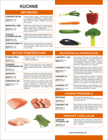 KUCHNIE ZMYWARKI LERADES CM 160 Opakowania: 12 kg Stężenie: 0,5-1,0% WARDOSAL GSM Opakowania: 12 kg Stężenie: 0,5-1,0% LERACID KLARSPULER 308 Opakowania: 10 kg Stężenie: 0,01-0,05% LERAPUR GSM 172 Opakowania: 12 kg Stężenie: 0,5-1,0% Chlorowy preparat myjący z dezynfekcją do użycia w zmywarkach przemysłowych w obszarze gastronomii, stołówkach, kuchniach zakładowych itp. Posiada dobre właściwości myjące i mikrobójcze. Bezpieczny dla aluminium. Bezchlorowy preparat myjący do zmywarek przemysłowych. Usuwa szybko i skutecznie resztki żywności, osady z herbaty i kawy, a także szminkę. Nie ma również szkodliwego działania na srebro, aluminium, tworzywa, stal. Preparat nabłyszczający, wspomaga spłukiwanie. Przeznaczony jest do zmywania naczyń i urządzeń w zmywarkach przemysłowych. Nie pozostawiając kropli oraz smug. Preparat do mycia naczyń szklanych w zmywarkach. Nie zawiera chloru, zastosowano dodatki chroniące mytą powierzchnię. Bardzo dobrze usuwa osady z kawy, herbaty. MYCIE POWIERZCHNI KLARUS GRILL Opakowania: 1 l gotowy do użycia LERAPUR GLASREINIGER 320 Opakowania: 1 l gotowy do użycia WARDOFIX Opakowania: 10 kg Stężenie: 0,5-1,5% LERAPUR N 304 Opakowania: 10, 30 kg Stężenie: 1-2% Preparat do mycia grili, frytownic, pieców i piekarników. • skuteczny i wydajny • butelka ze spryskiwaczem Preparat do mycia szyb, luster i innych powierzchni szklanych. Nie pozostawia smug. Posiada przyjemny zapach. Butelka ze spryskiwaczem – aplikacja w formie pianki. DEZYNFEKCJA POWIERZCHNI LERASEPT L 420 Opakowania: 10 kg Stężenie: 1-3% LERASEPT D 402 Opakowania: 10 kg Stężenie: 1-2% Preparat na bazie alkoholu do mycia powierzchni jak: tworzywa sztuczne, glazura, płytki podłogowe, kamień, linoleum, PVC, drzwi, stoły, szkło, emalii. Czyszczone powierzchnie schną szybko, bez powstawania smug. Uniwersalny środek do do ręcznego mycia naczyń i innych powierzchni wewszystkich obszarach przetwórstwa spożywczego i gastronomii. Preparat skutecznie odtłuszcza naczynia, stoły i blaty robocze, podłogi płytki ceramicznych, lady sklepowe oraz urządzenia. LERASEPT FI Opakowania: 10 l gotowy do użycia LERADES C 57 Opakowania: 10, 30 kg Stężenie: 2-5% Lekko alkaliczny środek do mycia i dezynfekcji wszelkich powierzchni w gastronomii. Posiada dobre właściwości odtłuszczające i mikrobójcze. Oparty na czwartorzedowych związkach amonowych i niejonowych detergentach. Polecany do mycia i dezynfekcji powierzchni konatktujących się z żywnością. Preparat dezynfekcyjny na bazie kombinacji czwartorzedowych związków amonowych o szerokim spektrum bójczym (bakterie, grzyby, pleśnie). Stosowany w formie piany, oprysku i użytku ręcznego. W stężeniu roboczym praktycznie bezzapachowy. Gotowy do użycia preparat do szybkiej i skutecznej dezynfekcji delikatnych powierzchni w przemyśle spożywczym. Szczególnie nadaje się do odkażania linii pakowania, taśm z tworzyw sztucznych, wag, maszyn tnących i innych urządzeń. Nie wymaga spłukiwania. Preparat dezynfekcyjny na bazie podchlorynu sodu. Do udrażniania i dezynfekcji kratek i kanałów ściekowych, odkażania pojemników na odpady HIGIENA PERSONELU SEPTASAN Opakowania: 10 l gotowy do użycia LERASEPT HR Opakowania: 10 l gotowy do użycia Mydło myjąco dezynfekcyjne do rąk. Nie wysusza skóry rąk. Zawiera składniki pielęgnujące i chroniące skórę rąk. Płynny, preparat na bazie alkoholu przeznaczony do odkażania dłoni. Posiada neutralne dla skóry pH oraz specjalne składniki przeciwdziałające utracie wilgotności oraz tłuszczu, które pielęgnują skórę. PRODUKTY SPECJALNE LERAPUR PFLEGEOL 309 Opakowania: 10 l gotowy do użycia Preparat do stali inox. Konserwuje i chroni przed korozją urządzenia ze stali nierdzewnej. Neutralny zapachowo i smakowo, bezbarwny. Dopuszczenie do kontaktu z żywnością. www.novachem.pl HOTELE I BAZA ZABIEGOWA PODŁOGI – MYCIE WARDOFIX Opakowania: 10 kg Stężenie: 0,5-1,5% HALLENREINIGER Opakowania: 10, 30 kg Stężenie robocze: 1-2% TP 300 JUMBO CLEAN Opakowania: 25 kg Stężenie: 1-2% Preparat na bazie alkoholu do mycia podłóg. Czyszczone powierzchnie schną szybko, bez powstawania smug. Polecany do podłóg wykonanych z płytek glazurowanych, kamienia, linoleum, PCV itp Uniwersalny środek do mycia wszelkiego rodzaju podłóg. Przeznaczony do mycia ręcznego oraz maszynowego (automaty szorująco-zbierające). Odtłuszcza i czyści podłogi, nadaje im przyjemny zapach i zapobiega osadzaniu się zabrudzeń. Silnie skoncetrowany środek do mycia i doczyszczania silnie zabrudzonych posadzek. Usuwa tłuszcze, oleje, smary i ślady gumy. Lekko pieniący. Nadaje się do mycia ręcznego i maszynowego. PODŁOGI – ZABEZPIECZANIE KT SILIMAT GRUNDREINIGER Opakowania: 10 kg Stężenie: 10% KT PERFEKT GLANZWISCHPFLEGE Opakowania: 10 kg Stężenie: 1-2% pielęgnacja 100% do zabezpieczenia KARAT FRESH Opakowania: 10 kg Stężenie robocze: 1-2% Specjalistyczny środek do usuwania wosków, polimerów, warstw zabezpieczających i nabłyszczających z wszelkiego rodzaju podłóg (z wyjątkiem podłóg drewnianych). Przeznaczony do użytku ręcznego i maszynowego. Uniwersalny, neutralny preparat do zabezpieczania i nabłyszczania posadzek. Przeznaczony do wszystkich podłóg wodoodpornych. Powstała powłoka ma działanie ochronne i antypoślizgowe. Stosowac 2-3 warstwy. Opakowania: 20 kg LAWINE BLAU Opakowania: 10 kg LERACID SAN 210 Opakowania: 1 l Stężenie: 5-10% lub w koncentracie Neutralna emulsja z dodatkiem polimerów do czyszczenia i pielęgnacji zabezpieczonych podłóg. Pozostawia na powierzchniach warstwę ochronną. Polecany do podłóg z tworzyw sztucznych i kamienia. Posiada przyjemny zapach Proszek do prania przeznaczony do użytku profesjonalnego. Zalecany do tkanin kolorowych i białych. Posiada bardzo przyjemny zapach. Skutecznie usuwa wszelkie plamy juz w niskich temperaturach. Profesjonalny proszek do prania w wersji kompakt. Zawier