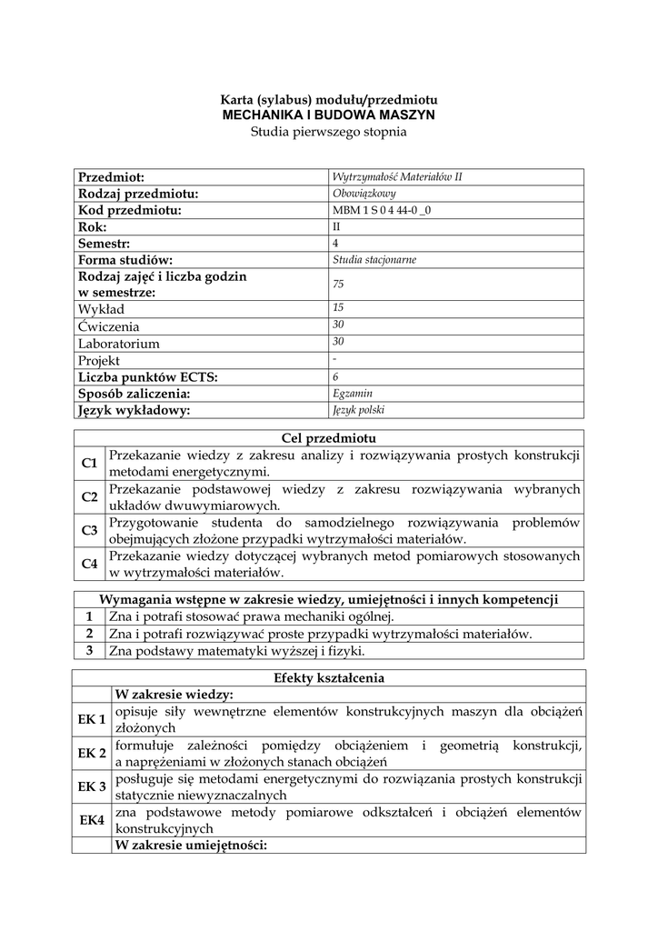 Karta (sylabus) modułu/przedmiotu MECHANIKA I BUDOWA MASZYN Studia pierwszego stopnia Przedmiot: Rodzaj przedmiotu: Kod przedmiotu: Rok: Semestr: Forma studiów: Rodzaj zajęć i liczba godzin w semestrze: Wykład Ćwiczenia Laboratorium Projekt Liczba punktów ECTS: Sposób zaliczenia: Język wykładowy: C1 C2 C3 C4 Wytrzymałość Materiałów II Obowiązkowy MBM 1 S 0 4 44-0 _0 II 4 Studia stacjonarne 75 15 30 30 6 Egzamin Język polski Cel przedmiotu Przekazanie wiedzy z zakresu analizy i rozwiązywania prostych konstrukcji metodami energetycznymi. Przekazanie podstawowej wiedzy z zakresu rozwiązywania wybranych układów dwuwymiarowych. Przygotowanie studenta do samodzielnego rozwiązywania problemów obejmujących złożone przypadki wytrzymałości materiałów. Przekazanie wiedzy dotyczącej wybranych metod pomiarowych stosowanych w wytrzymałości materiałów. Wymagania wstępne w zakresie wiedzy, umiejętności i innych kompetencji 1 Zna i potrafi stosować prawa mechaniki ogólnej. 2 Zna i potrafi rozwiązywać proste przypadki wytrzymałości materiałów. 3 Zna podstawy matematyki wyższej i fizyki. Efekty kształcenia EK 1 EK 2 EK 3 EK4 W zakresie wiedzy: opisuje siły wewnętrzne elementów konstrukcyjnych maszyn dla obciążeń złożonych formułuje zależności pomiędzy obciążeniem i geometrią konstrukcji, a naprężeniami w złożonych stanach obciążeń posługuje się metodami energetycznymi do rozwiązania prostych konstrukcji statycznie niewyznaczalnych zna podstawowe metody pomiarowe odkształceń i obciążeń elementów konstrukcyjnych W zakresie umiejętności: potrafi dobierać wymiary przekrojów elementów konstrukcyjnych oraz określić przemieszczenia w złożonych przypadkach obciążeń analizuje otrzymane wyniki obliczeń wytrzymałościowych dla złożonych EK6 przypadków obciążeń potrafi korzystać z typowej aparatury laboratoryjnej stosowanej EK7 w wytrzymałości materiałów W zakresie kompetencji społecznych: EK8 pracuje samodzielnie rozwiązując przedstawiony problem EK9 potrafi pracować zespołowo w trakcie zajęć praktycznych Treści programowe przedmiotu Forma zajęć – wykłady Treści programowe Metody energetyczne dla układów statycznie wyznaczalnych. Układy W1 liniowo-sprężyste Clapeyrona. Energia sprężysta. Siły i przemieszczenia uogólnione. Twierdzenia o wzajemności prac Bettiego i wzajemności przemieszczeń W2 Maxwella. Twierdzenia Castigliano. Uproszczenie Wereszczagina w obliczeniach całek Mohr’a. Metoda siły dodatkowej. Metody energetyczne dla układów statycznie niewyznaczalnych. W3 Twierdzenie Menabrei. W4 Metoda Maxwell’a-Mohr’a. W5 Zasada symetrii i antysymetrii dla układów statycznie niewyznaczalnych. W6 Rozwiązywanie belek wieloprzęsłowych – metoda trzech momentów. W7 Hipotezy wytężeniowe. W8 Wytrzymałość złożona. Powłoki cienkościenne osiowo-symetryczne. Błonowa teoria powłoki W9 równanie Laplace’a. Równania równowagi dla części zbiornika. W10 Rura grubościenna. Zadanie Lamego. Zginanie płyt cienkich. Założenia teorii zginania płyt cienkich. Walcowe W11 zginanie płyty prostokątnej. W12 Czyste zginanie płyt. Sztywność płytowa. W13 Płyta kołowo-symetryczna. W14 Zagadnienie brzegowe dla płyt kołowych. W15 Rozwiązywanie równania ugięcia płyt – przykłady. Forma zajęć – ćwiczenia Treści programowe ĆW1 Energia potencjalna sprężystości układów liniowo-sprężystych – przykłady. ĆW2 Twierdzenie Castigliano – przykłady. ĆW3 Twierdzenie Menabrei – przykłady. ĆW4 Metoda sił – przykłady. Uproszczona metoda całkowania Wereszczagina. ĆW5 Zasada symetrii i antysymetrii dla układów statycznie niewyznaczalnych. ĆW6 Metoda sił – przykłady c.d. ĆW7 Metoda trzech momentów. ĆW8 Kolokwium I. ĆW9 Wytrzymałość złożona. ĆW10 Wytrzymałość złożona. Hipotezy wytężeniowe. EK5 ĆW11 ĆW12 ĆW13 ĆW14 ĆW15 L1 L2 L3 L4 L5 L6 L7 L8 L9 L10 L11 L12 L13 L14 L15 1 2 3 Obliczenia wytrzymałościowe zbiorników cienkościennych. Zadanie Lamego – przykłady. Walcowe zginanie płyt cienkich. Płyty kołowo-symetryczne. Kolokwium II. Forma zajęć – laboratoria Treści programowe Zajęcia wprowadzające: szkolenie BHP oraz organizacja zajęć w laboratorium. Statyczna próba rozciągania metali. Badanie stanu odkształceń i naprężeń w belce przy czystym zginaniu. Wyznaczanie modułu sprężystości G w rurze skręcanej. Zastosowanie techniki tensometrycznej do pomiary odkształceń w płaskim stanie naprężenia na przykładzie rury skręcanej. Udarowa próba zginania. Stateczność prętów smukłych. Statycznie wyznaczalny przypadek osiowego rozciągania. Metoda superpozycji. Badania sprężyny śrubowej. Ścinanie połączeń klejonych. Badania rozkładu naprężeń w przekroju poprzecznym mimośrodowo rozciąganego pręta. Wyznaczanie linii ugięcia belki z zastosowaniem twierdzenia o wzajemności przemieszczeń. Badania wytrzymałości zmęczeniowej materiałów. Badania elastooptyczne. Rozrywanie połączeń klejonych. Dynamometr pierścieniowy. Metody dydaktyczne Wykład problemowy z wykorzystaniem środków audiowizualnych. Ćwiczenia rachunkowe: rozwiązywanie zadań przez studentów pod kontrolą prowadzącego. Laboratorium: metoda praktyczna oparta na obserwacji i pomiarze, pokazy, metoda aktywizująca związana z praktycznym działaniem studentów. Obciążenie pracą studenta Średnia liczba godzin na zrealizowanie Forma aktywności aktywności Godziny kontaktowe z wykładowcą, 80 w tym: Godziny kontaktowe z wykładowcą, realizowane w formie zajęć dydaktycznych – łączna liczba godzin w semestrze Godziny kontaktowe z wykładowcą, realizowane w formie np. konsultacji w odniesieniu – łączna liczba godzin w semestrze Praca własna studenta, w tym: Przygotowanie się do zajęć – łączna liczba godzin 75 5 70 40 w semestrze Przygotowanie się do laboratorium – łączna liczba godzin w semestrze Ł