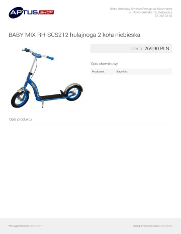 Sklep dziecięcy Smykuś Remigiusz Kaczmarek ul. Nowotoruńska 12, Bydgoszcz 52 362 02 63 BABY MIX RH-SCS212 hulajnoga 2 koła niebieska Cena: 269,90 PLN Opis słownikowy Producent Baby Mix Opis produktu Plik wygenerowano: 06-03-2017 Powered by TCPDF (www.tcpdf.org) Oprogramowanie sklepu: AptusShop