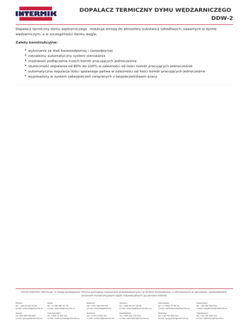 DOPALACZ TERMICZNY DYMU WĘDZARNICZEGO DDW-2 Dopalacz termiczny dymu wędzarniczego redukuje emisję do atmosfery substancji szkodliwych, zawartych w dymie wędzarniczym, a w szczególności tlenku węgla. Zalety konstrukcyjne: wykonanie ze stali kwasoodpornej i żaroodpornej niezależny automatyczny system sterowania możliwość podłączenia trzech komór pracujących jednocześnie skuteczność dopalania od 80% do 100% w zależności od ilości komór pracujących jednocześnie automatyczna regulacja ilości spalanego paliwa w zależności od ilości komór pracujących jednocześnie wyposażony w system zabezpieczeń związanych z bezpieczeństwem pracy Firma Intermik informuje, iż mogą występować różnice pomiędzy maszynami przedstawionymi na stronie internetowej, a oferowanymi w sprzedaży, spowodowane zmianami konstrukcyjnymi bądź indywidualnymi życzeniami klienta. Polska: Rosja: Białoruś: Ukraina: Kaliningrad: Kazachstan: tel.: +48 22 633 42 85 tel. +7 495 981 25 70 tel. +375 162 259 221 tel. +380 44 277 29 34 tel. +7 4012 57 40 16 tel. +48 795 509 314 e-mail: [email protected] e-mail: [email protected] e-mail: [email protected] e-mail: [email protected] e-mail: [email protected] e-mail: [email protected] Gruzja: Turkmenistan: Armenia: Azerbejdżan: Kirgistan: Tadżykistan: tel. 995 599 566 850 tel. +993 12 362 421 tel. +374 10 550 141 tel. +994 502 235 025 tel. +48 795 509 314 tel. +48 795 509 314 e-mail: [email protected] e-mail: [email protected] e-mail: [email protected] e-mail: [email protected] e-mail: [email protected] e-mail: [email protected]