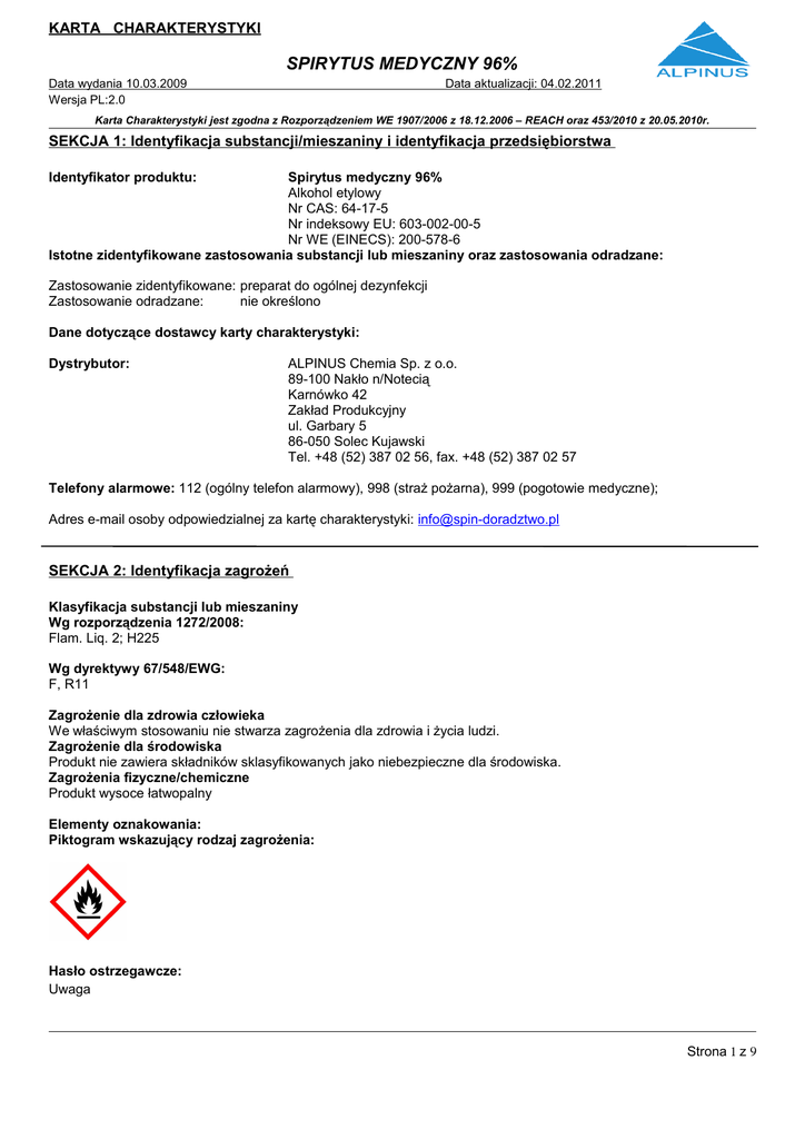 KARTA CHARAKTERYSTYKI SPIRYTUS MEDYCZNY 96% Data wydania 10.03.2009 Wersja PL:2.0 Data aktualizacji: 04.02.2011 Karta Charakterystyki jest zgodna z Rozporządzeniem WE 1907/2006 z 18.12.2006 – REACH oraz 453/2010 z 20.05.2010r. SEKCJA 1: Identyfikacja substancji/mieszaniny i identyfikacja przedsiębiorstwa Identyfikator produktu: Spirytus medyczny 96% Alkohol etylowy Nr CAS: 64-17-5 Nr indeksowy EU: 603-002-00-5 Nr WE (EINECS): 200-578-6 Istotne zidentyfikowane zastosowania substancji lub mieszaniny oraz zastosowania odradzane: Zastosowanie zidentyfikowane: preparat do ogólnej dezynfekcji Zastosowanie odradzane: nie określono Dane dotyczące dostawcy karty charakterystyki: Dystrybutor: ALPINUS Chemia Sp. z o.o. 89-100 Nakło n/Notecią Karnówko 42 Zakład Produkcyjny ul. Garbary 5 86-050 Solec Kujawski Tel. +48 (52) 387 02 56, fax. +48 (52) 387 02 57 Telefony alarmowe: 112 (ogólny telefon alarmowy), 998 (straż pożarna), 999 (pogotowie medyczne); Adres e-mail osoby odpowiedzialnej za kartę charakterystyki: [email protected] SEKCJA 2: Identyfikacja zagrożeń Klasyfikacja substancji lub mieszaniny Wg rozporządzenia 1272/2008: Flam. Liq. 2; H225 Wg dyrektywy 67/548/EWG: F, R11 Zagrożenie dla zdrowia człowieka We właściwym stosowaniu nie stwarza zagrożenia dla zdrowia i życia ludzi. Zagrożenie dla środowiska Produkt nie zawiera składników sklasyfikowanych jako niebezpieczne dla środowiska. Zagrożenia fizyczne/chemiczne Produkt wysoce łatwopalny Elementy oznakowania: Piktogram wskazujący rodzaj zagrożenia: Hasło ostrzegawcze: Uwaga Strona 1 z 9 KARTA CHARAKTERYSTYKI SPIRYTUS MEDYCZNY 96% Data wydania 10.03.2009 Wersja PL:2.0 Data aktualizacji: 04.02.2011 Karta Charakterystyki jest zgodna z Rozporządzeniem WE 1907/2006 z 18.12.2006 – REACH oraz 453/2010 z 20.05.2010r. Zwrot wskazujący rodzaj zagrożenia: H225 – wysoce łatwopalna ciecz i pary Zwroty określające warunki bezpiecznego stosowania: Zapobieganie: P210 - Przechowywać z dala od źródeł ciepła/iskrzenia/otwartego ognia/gorących powierzchni. Palenie wzbronione. P233 - Przechowywać pojemnik szczelnie zamknięty. P243 - Przedsięwziąć środki ostrożności zapobiegające statycznemu rozładowaniu. Reagowanie: P303 + P361 + P353 - W PRZYPADKU KONTATKU ZE SKÓRĄ (lub z włosami): Natychmiast usunąć/zdjąć całą zanieczyszczoną odzież. Spłukać skórę pod strumieniem wody/prysznicem. Przechowywanie P403 + P235 - Przechowywać w dobrze wentylowanym miejscu. Przechowywać w chłodnym miejscu. Usuwanie P501 - Zawartość/pojemnik usuwać zgodnie z krajowymi przepisami. Inne zagrożenia: Brak innych zagrożeń. Brak informacji na temat spełnienia kryteriów PBT lub vPvB zgodnie z załącznikiem XIII rozporządzenia REACH. Odpowiednie badania nie były przeprowadzone. SEKCJA 3: Skład/informacja o składnikach Substancje: Identyfikator produktu Alkohol etylowy CAS: 64-17-5 WE: 200-578-6 Nr indeksowy : 603-002-00-5 Nr REACH: substancja podlega przepisom okresu przejściowego Zawartość % 70 - 100 Klasyfikacja wg 67/548/EWG F: R11 Klasyfikacja CLP Kody Klasa zagrożenia zwrotów i wskazujących kody kategorii rodzaj zagrożenia Flam. Liq. 2 H225 Pełna treść zwrotów R i H w sekcji 16 Dodatkowo zawiera chlorheksydyne, która nie jest klasyfikowana jako niebezpieczna. SEKCJA 4: Środki pierwszej pomocy W przypadku kontaktu ze skórą: Zdjąć całą zabrudzoną odzież, obmyć skórę wodą z mydłem spłukać dokładnie dużą ilością wody. W przypadku wystąpienia podrażnień skontaktować się z lekarzem. W przypadku kontaktu z oczami: Strona 2 z 9 KARTA CHARAKTERYSTYKI SPIRYTUS MEDYCZNY 96% Data wydania 10.03.2009 Wersja PL:2.0 Data aktualizacji: 04.02.2011 Karta Charakterystyki jest zgodna z Rozporządzeniem WE 1907/2006 z 18.12.2006 – REACH oraz 453/2010 z 20.05.2010r. Przepłukać oczy przez kilkanaście minut (ok. 15) dużą ilością wody, trzymając powieki szeroko rozwarte. Unikać silnego strumienia, ze względu na niebezpieczeństwo uszkodzenia rogówki, natychmiast skontaktować się z lekarzem. Narażenie inhalacyjne: W razie zawrotów głowy lub nudności wyprowadzić poszkodowanego na świeże powietrze, w razie braku szybkiej poprawy zasięgnąć porady lekarza. W przypadku połknięcia: Sprowokować wymioty, a następnie wypić dużą ilość wody. Nie podawać niczego doustnie osobie nieprzytomnej. Najważniejsze ostre i opóźnione objawy oraz skutki narażenia: Kontakt ze skórą: możliwe delikatne podrażnienia w przypadku częstego, powtarzającego się, długotrwałego, bezpośredniego kontaktu. Kontakt z oczami: możliwie podrażnienia, zaczerwienienie, ból, łzawienie. Układ oddechowy: przy wdychaniu dużych stężeń produktu podrażnienia chemiczne błon śluzowych nosa, gardła i dalszych odcinków układu oddechowego, możliwa absorpcja i objawy upojenia alkoholowego. Przewód pokarmowy: podrażnienia chemiczne jamy ustnej, języka, gardła, dalszych odcinków przewodu pokarmowego, objawy upojenia alkoholowego, w przypadku zatrucia alkoholowego – denaturacja krwi. Wskazania dotyczące wszelkiej natychmiastowej pomocy lekarskiej i szczególnego postępowania z poszkodowanym: Decyzję o sposobie postępowania podejmuje lekarz po ocenie stanu poszkodowanego. SEKCJA 5: Postępowanie w przypadku pożaru Środki gaśnicze: Odpowiednie środki gaśnicze: suche proszki gaśnicze, dwutlenek węgla (gaśnica śniegowa), piasek lub ziemia. Stosować metody gaśnicze odpowiednie do warunków otoczenia. Niewłaściwe środki gaśnicze: Silny strumień wody. Szczególne zagrożenia związane z substancją lub mieszaniną: W trakcie pożaru, pod wpływem działania wysokich temperatur uwalniają się toksyczne produkty rozkładu zawierające min. dwutlenek węgla. Pary produktu mogą tworzyć z powietrzem mieszaniny wybuchowe. Informacje dla straży pożarnej: Pojemniki znajdujące się w strefie pożaru chłodzić rozproszonym strumieniem wody, o ile jest to możliwe u