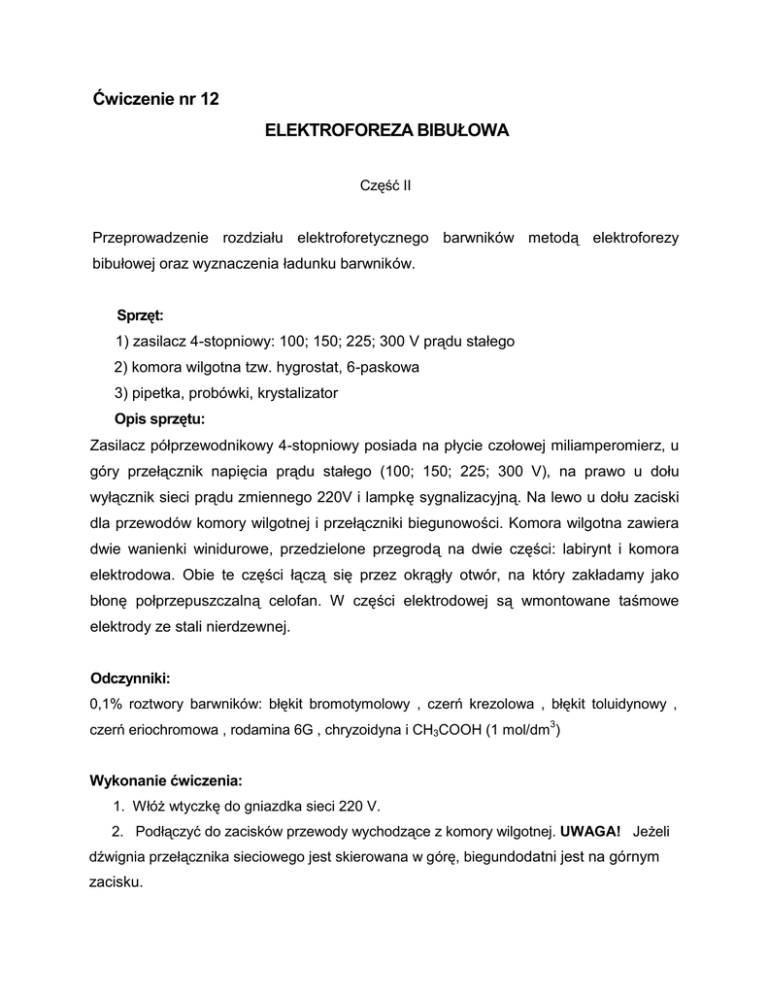 Ćwiczenie nr 12 ELEKTROFOREZA BIBUŁOWA Część II Przeprowadzenie rozdziału elektroforetycznego barwników metodą elektroforezy bibułowej oraz wyznaczenia ładunku barwników. Sprzęt: 1) zasilacz 4-stopniowy: 100; 150; 225; 300 V prądu stałego 2) komora wilgotna tzw. hygrostat, 6-paskowa 3) pipetka, probówki, krystalizator Opis sprzętu: Zasilacz półprzewodnikowy 4-stopniowy posiada na płycie czołowej miliamperomierz, u góry przełącznik napięcia prądu stałego (100; 150; 225; 300 V), na prawo u dołu wyłącznik sieci prądu zmiennego 220V i lampkę sygnalizacyjną. Na lewo u dołu zaciski dla przewodów komory wilgotnej i przełączniki biegunowości. Komora wilgotna zawiera dwie wanienki winidurowe, przedzielone przegrodą na dwie części: labirynt i komora elektrodowa. Obie te części łączą się przez okrągły otwór, na który zakładamy jako błonę połprzepuszczalną celofan. W części elektrodowej są wmontowane taśmowe elektrody ze stali nierdzewnej. Odczynniki: 0,1% roztwory barwników: błękit bromotymolowy , czerń krezolowa , błękit toluidynowy , czerń eriochromowa , rodamina 6G , chryzoidyna i CH3COOH (1 mol/dm3) Wykonanie ćwiczenia: 1. Włóż wtyczkę do gniazdka sieci 220 V. 2. Podłączyć do zacisków przewody wychodzące z komory wilgotnej. UWAGA! Jeżeli dźwignia przełącznika sieciowego jest skierowana w górę, biegundodatni jest na górnym zacisku. 3. Komorę wilgotną napełnić buforem. 4. Na paskach bibuły Whatman 1 o szerokości 3,5 cm i długości 28,5 cm zaznaczyć zwykłym ołówkiem na środku „linię startową". Paski zwilżyć CH3COOH o stęż. 1mol/dm3 i umieścić na rurkach winidurowych w komorze wilgotnej. Po 30 min na trzy paski bibuły nałożyć ok. 0,02 cm3 roztworu analizowanych barwników (dowolnie wybranych) na każdym pasku jeden barwnik a na czwarty pasek nanieść dwa barwniki (dowolnie wybrane). W celu uniknięcia tzw. efektu brzeżnego, próby nałożyć na linię startową tak, aby roztwór nie dotykał skraju paska. Włączyć napięcie 300V; czas elektroforezy wynosi ok. 2 godz. Po wyłączeniu prądu zdjąć pokrywę komory, wyjąć paski i wysuszyć na powietrzu.