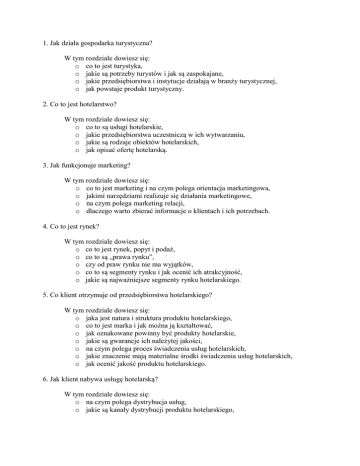 1. Jak działa gospodarka turystyczna? W tym rozdziale dowiesz się: o co to jest turystyka, o jakie są potrzeby turystów i jak są zaspokajane, o jakie przedsiębiorstwa i instytucje działają w branży turystycznej, o jak powstaje produkt turystyczny. 2. Co to jest hotelarstwo? W tym rozdziale dowiesz się: o co to są usługi hotelarskie, o jakie przedsiębiorstwa uczestniczą w ich wytwarzaniu, o jakie są rodzaje obiektów hotelarskich, o jak opisać ofertę hotelarską. 3. Jak funkcjonuje marketing? W tym rozdziale dowiesz się: o co to jest marketing i na czym polega orientacja marketingowa, o jakimi narzędziami realizuje się działania marketingowe, o na czym polega marketing relacji, o dlaczego warto zbierać informacje o klientach i ich potrzebach. 4. Co to jest rynek? W tym rozdziale dowiesz się: o co to jest rynek, popyt i podaż, o co to są „prawa rynku”, o czy od praw rynku nie ma wyjątków, o co to są segmenty rynku i jak ocenić ich atrakcyjność, o jakie są najważniejsze segmenty rynku hotelarskiego. 5. Co klient otrzymuje od przedsiębiorstwa hotelarskiego? W tym rozdziale dowiesz się: o jaka jest natura i struktura produktu hotelarskiego, o co to jest marka i jak można ją kształtować, o jak oznakowane powinny być produkty hotelarskie, o jakie są gwarancje ich należytej jakości, o na czym polega proces świadczenia usług hotelarskich, o jakie znaczenie mają materialne środki świadczenia usług hotelarskich, o jak ocenić jakość produktu hotelarskiego. 6. Jak klient nabywa usługę hotelarską? W tym rozdziale dowiesz się: o na czym polega dystrybucja usług, o jakie są kanały dystrybucji produktu hotelarskiego, o jak przebiega proces przybliżania produktu, przepływu pieniędzy i informacji w procesie dystrybucji produktu hotelarskiego, o na czym polega pionowa i pozioma integracja w kanale dystrybucji usług hotelarskich, o jakie strategie dystrybucji można wyróżnić. 7. Ile powinien wynosić koszt usługi hotelarskiej? W tym rozdziale dowiesz się: o co to jest cena podstawowa i jakimi metodami można ją ustalać, o jakie stosuje się terminy i formy płatności, o jak można różnicować ceny usług hotelarskich, o jakie strategie cenowe może wybrać przedsiębiorstwo hotelarskie. 8. Jak poinformować klientów o ofercie? W tym rozdziale dowiesz się: o co to jest promocja i jakie ma funkcje, o jak może przebiegać proces podejmowania przez klienta decyzji o nabyciu produktu, o co to jest target i jak oceniać działania promocyjne, o co to jest reklama, PR, promocja sprzedaży i promocja bezpośrednia i jak się nimi posługiwać. 9. Kto tworzy produkt hotelarski? W tym rozdziale dowiesz się: o jakie znaczenie mają ludzie dla jakości usług hotelarskich, o jakie wyróżniamy grupy personelu, o jaki wpływ na jakość usługi ma klient i inni goście. 10. Jak poznać potrzeby klienta? W tym rozdziale dowiesz się: o jakie są źródła informacji marketingowej, o czym się różnią badania jakościowe i ilościowe, o jak dobierać jednostki badane w badaniach sondażowych, o czym się różnią badania obserwacyjne od kwestionariuszowych, o jakie są najpopularniejsze techniki badań kwestionariuszowych, o jak mierzymy efektywność świadczenia usług hotelarskich, o jak analizować i przedstawiać wyniki badań marketingowych. 11. Czy goście są jednakowi? W tym rozdziale dowiesz się: o na czym polega segmentacja rynku, o wg jakich kryteriów można wykonać segmentację rynku hotelarskiego, o na czym polegają strategie marketingu masowego, zróżnicowanego, skoncentrowanego, niszowego i indywidualnego. 12. Jak marketingowo zarządzać i planować? W tym rozdziale dowiesz się: o na czym polega planowanie, organizowanie, kierowanie i kontrolowanie, o czym się różnią decyzje operacyjne od strategicznych, o jak budować misję przedsiębiorstwa hotelarskiego, o jak analizować pozycję przedsiębiorstwa w jego otoczeniu, o jak tworzyć plan marketingowy przedsiębiorstwa.
