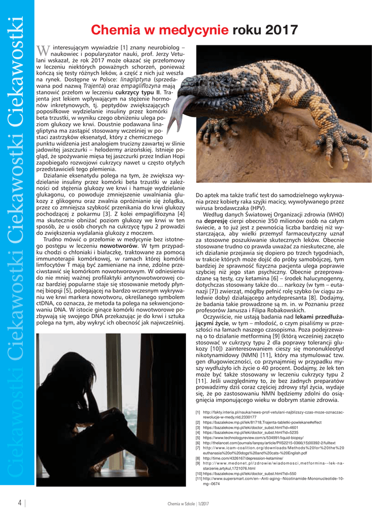 Ciekawostki Ciekawostki Ciekawostki Ciekawostki 4| Chemia w medycynie roku 2017 interesującym wywiadzie [1] znany neurobiolog – naukowiec i popularyzator nauki, prof. Jerzy Vetulani wskazał, że rok 2017 może okazać się przełomowy w leczeniu niektórych poważnych schorzeń, ponieważ kończą się testy różnych leków, a część z nich już weszła na rynek. Dostępne w Polsce: linagliptyna (sprzedawana pod nazwą Trajenta) oraz empagliflozyna mają stanowić przełom w leczeniu cukrzycy typu II. Trajenta jest lekiem wpływającym na stężenie hormonów inkretynowych, tj. peptydów zwiększających poposiłkowe wydzielanie insuliny przez komórki beta trzustki, w wyniku czego obniżeniu ulega poziom glukozy we krwi. Doustnie podawana linagliptyna ma zastąpić stosowany wcześniej w postaci zastrzyków eksenatyd, który z chemicznego punktu widzenia jest analogiem trucizny zawartej w ślinie jadowitej jaszczurki – helodermy arizońskiej. Istnieje pogląd, że spożywanie mięsa tej jaszczurki przez Indian Hopi zapobiegało rozwojowi cukrzycy nawet u często otyłych przedstawicieli tego plemienia. Działanie eksenatydu polega na tym, że zwiększa wydzielanie insuliny przez komórki beta trzustki w zależności od stężenia glukozy we krwi i hamuje wydzielanie glukagonu, co powoduje zmniejszenie uwalniania glukozy z glikogenu oraz zwalnia opróżnianie się żołądka, przez co zmniejsza szybkość przenikania do krwi glukozy pochodzącej z pokarmu [3]. Z kolei empagliflozyna [4] ma skutecznie obniżać poziom glukozy we krwi w ten sposób, że u osób chorych na cukrzycę typu 2 prowadzi do zwiększenia wydalania glukozy z moczem. Trudno mówić o przełomie w medycynie bez istotnego postępu w leczeniu nowotworów. W tym przypadku chodzi o chłoniaki i białaczkę, traktowane za pomocą immunoterapii komórkowej, w ramach której komórki limfocytów T mają być zamieniane na inne, zdolne przeciwstawić się komórkom nowotworowym. W odniesieniu do nie mniej ważnej profilaktyki antynowotworowej coraz bardziej popularne staje się stosowanie metody płynnej biopsji [5], polegającej na bardzo wczesnym wykrywaniu we krwi markera nowotworu, określanego symbolem ctDNA, co oznacza, że metoda ta polega na sekwencjonowaniu DNA. W istocie ginące komórki nowotworowe pozbywają się swojego DNA przekazując je do krwi i sztuka polega na tym, aby wykryć ich obecność jak najwcześniej. W Do aptek ma także trafić test do samodzielnego wykrywania przez kobiety raka szyjki macicy, wywoływanego przez wirusa brodawczaka (HPV). Według danych Światowej Organizacji zdrowia (WHO) na depresję cierpi obecnie 350 milionów osób na całym świecie, a to już jest z pewnością liczba bardziej niż wystarczająca, aby wielki przemysł farmaceutyczny uznał za stosowne poszukiwanie skutecznych leków. Obecnie stosowane trudno co prawda uważać za nieskuteczne, ale ich działanie przejawia się dopiero po trzech tygodniach, w trakcie których może dojść do próby samobójczej, tym bardziej że sprawność fizyczna pacjenta ulega poprawie szybciej niż jego stan psychiczny. Obecnie przeprowadzane są testy, czy ketamina [6] – środek halucynogenny, dotychczas stosowany także do… narkozy (w tym – eutanazji [7]) zwierząt, mógłby pełnić rolę szybko (w ciągu zaledwie doby) działającego antydepresanta [8]. Dodajmy, że badania takie prowadzone są m. in. w Poznaniu przez profesorów Janusza i Filipa Robakowskich. Oczywiście, nie ustają badania nad lekami przedłużającymi życie, w tym – młodość, o czym pisaliśmy w przeszłości na łamach naszego czasopisma. Poza podejrzewaną o to działanie metforminą [9] (którą wcześniej zaczęto stosować w cukrzycy typu 2 dla poprawy tolerancji glukozy [10]) zainteresowaniem cieszy się mononukleotyd nikotynamidowy (NMN) [11], który ma stymulować tzw. gen długowieczności, co przynajmniej w przypadku myszy wydłużyło ich życie o 40 procent. Dodajmy, że lek ten może być także stosowany w leczeniu cukrzycy typu 2 [11]. Jeśli uwzględnimy to, że bez żadnych preparatów prowadzimy dziś coraz częściej zdrowy styl życia, wydaje się, że po zastosowaniu NMN będziemy zdolni do osiągnięcia imponującego wieku w dobrym stanie zdrowia. [1] http://fakty.interia.pl/nauka/news-prof-vetulani-najblizszy-czas-moze-oznaczacrewolucje-w-medy,nId,2330177 [2] https://bazalekow.mp.pl/lek/81718,Trajenta-tabletki-powlekane#effect [3] https://bazalekow.mp.pl/leki/doctor_subst.html?id=4601 [4] https://bazalekow.mp.pl/leki/doctor_subst.html?id=5235 [5] https://www.technologyreview.com/s/534991/liquid-biopsy/ [6] http://thelancet.com/journals/lanpsy/article/PIIS2215-0366(15)00392-2/fulltext [7] http://www.icam-coalition.org/downloads/Methods%20for%20the%20 euthanasia%20of%20dogs%20and%20cats-%20English.pdf [8] http://time.com/4326167/depression-ketamine/ [9] h t t p : / / w w w. m e d o n e t . p l / z d r o w i e / w i a d o m o s c i , m e t f o r m i n a - - l e k - n a starzenie,artykul,1721076.html [10] https://bazalekow.mp.pl/leki/doctor_subst.html?id=550 [11] http://www.supersmart.com/en--Anti-aging--Nicotinamide-Mononucleotide-10mg--0674 Chemia w Szkole | 1/2017 ontynuując tematykę roli chemii w medycynie, odnotujmy polski wkład patentowy do fotodynamicznej metody zwalczania nowotworów, uzupełniającej lub nawet w założeniu zastępującej tradycyjną radio- lub chemioterapię [1, 2]. Ogólnie metoda fotodynamiczna, znana od dawna i stosowana w różnych schorzeniach, polega na wprowadzeniu do chorego miejsca substancji będącej fotouczulaczem, zdolnej do absorpcji promieniowania świetlnego i w tak wysokoenergetycznej formie wzbudzającej, np. cząsteczkę tlenu w stanie podstawowym (tzw. tlen trypletowy) do reaktywnego stanu wzbudzonego (tzw. tlen singletowy). Za pomocą tlenu singletowego, utworzonego z udziałem barwnika werteporfiny leczy się degenerację plamki żółtej [3]. W przypadku nowotworów po