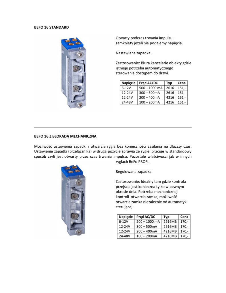 BEFO 16 STANDARD Otwarty podczas trwania impulsu – zamknięty jeżeli nie podajemy napięcia. Nastawiana zapadka. Zastosowanie: Biura kancelarie obiekty gdzie istnieje potrzeba automatycznego sterowania dostępem do drzwi. Napięcie 6-12V 12-24V 12-24V 24-48V Prąd AC/DC 500 – 1000 mA 300 – 500mA 200 – 400mA 100 – 200mA Typ 2616 2616 4216 4216 Cena 151,151,151,151,- BEFO 16 Z BLOKADĄ MECHANICZNĄ Możliwość ustawienia zapadki i otwarcia rygla bez konieczności zasilania na dłuższy czas. Ustawienie zapadki (przełącznika) w drugą pozycje sprawia że rygiel pracuje w standardowy sposób czyli jest otwarty przez czas trwania impulsu. Pozostałe właściwości jak w innych ryglach BeFo PROFI. Regulowana zapadka. Zastosowanie: Idealny tam gdzie kontrola przejścia jest konieczna tylko w pewnym okresie dnia. Potrzeba mechanicznej kontroli otwarcia zamka, możliwość otwarcia zamka niezależnie od automatyki sterującej. Napięcie 6-12V 12-24V 12-24V 24-48V Prąd AC/DC 500 – 1000 mA 300 – 500mA 200 – 400mA 100 – 200mA Typ 2616MB 2616MB 4216MB 4216MB Cena 170,170,170,170,- BEFO 16 Z SYGNALIZACJĄ OTWARCIA DRZWI Sygnalizacja stanu drzwi. Otwarty podczas trwania impulsu napięcia – Zamknięty bez zasilania. Zamek posiada wbudowany kontaktron, którego nie trzeba dodatkowo montować na drzwiach aby monitorować ich stan (otwarte zamknięte). Zamek jest wyższy o 2,7 mm od standardowego typu – bez kontaktronu. Regulowana zapadka. Zastosowanie: Potrzeba kontroli zamknięcia otwarcia drzwi, systemy dostępu z alarmem niedomkniętych drzwi lub sforsowania wejścia. Napięcie 6-12V 12-24V 12-24V 24-48V Prąd AC/DC 500 – 1000 mA 300 – 500mA 200 – 400mA 100 – 200mA Typ 22616 22616 24216 24216 Cena 323,323,323,323,- BEFO 16 Z SYGNALIZACJĄ I BLOKADĄ MECHANICZNA Zamek łączy funkcje dwóch poprzednich zamków posiada sygnalizacje i dźwignię mechaniczną do odblokowania drzwi. Otwarty podczas trwania impulsu – zamknięty bez zasilania. Zamek jest o 2,7 mm wyższy niż wersja bez mikrostyku. Posiada nastawianą zapadkę. Zastosowania: Potrzeba kontroli zamknięcia otwarcia drzwi, systemy dostępu z alarmem niedomkniętych drzwi lub sforsowania wejścia. Idealny tam gdzie kontrola przejścia jest konieczna tylko w pewnym okresie dnia. Potrzeba mechanicznej kontroli otwarcia zamka, możliwość otwarcia zamka niezależnie od automatyki sterującej. Napięcie 6-12V 12-24V 12-24V 24-48V Prąd AC/DC 500 – 1000 mA 300 – 500mA 200 – 400mA 100 – 200mA Typ 22616MB 22616MB 24216MB 24216MB Cena 342,342,342,342,- BEFO 16 REWERSYJNY (NO) Odwrotna funkcja otwierania. Zamek rewersyjny jest zamknięty gdy jest zasilany, w przypadku braku zasilania przejście zostaje otwarte. Zamek posiada specjalną cewkę która może pracować przez bardzo długi czas pod napięciem. Parametry mechaniczne jak w ryglach PROFI. Dostarczany na krótkiej listwie. Regulacja zapadki. Zastosowania: Tam gdzie wymaga się bezpieczeństwa przeciw pożarowego, w ciągach ewakuacyjnych. Sklepy restauracje centra handlowe itp., w miejscu gdzie podczas zaniku napięcia drzwi powinny zostać otwarte. Napięcie Prąd DC Typ Cena 12V 200mA 34216 231,24V 100mA 34216 231,- BEFO 16 REWERSYJNY (NO) Z SYGNALIZACJĄ OTWARCIA DRZWI Odwrotna funkcja otwierania. Zamek rewersyjny jest zamknięty gdy jest zasilany, w przypadku braku zasilania przejście zostaje otwarte. Zamek posiada specjalną cewkę która może pracować przez bardzo długi czas pod napięciem oraz kontaktron do podłączenia sygnalizacji stanu drzwi. Zamek posiada, jest wyższy o 2,7 mm od rygla bez kontaktronu. Dostarczany na krótkiej listwie. Regulacja zapadki. Zastosowania: Tam gdzie wymaga się bezpieczeństwa przeciw pożarowego, w ciągach ewakuacyjnych: sklepy restauracje centra handlowe itp., w miejscu gdzie podczas zaniku napięcia drzwi powinny zostać otwarte. Potrzeba kontroli zamknięcia otwarcia drzwi, systemy dostępu z alarmem niedomkniętych drzwi lub sforsowania wejścia. Napięcie Prąd DC Typ Cena 12V 200mA 324216 411,24V 100mA 324216 411,- BEFO 16 UNIWERSALNY Otwarty podczas trwania impulsu – zamknięty jeżeli nie podajemy napięcia. Oprócz standardowych funkcji posiada szeroki zakres zasilania 8-28V AC/DC bez konieczności przepinania kabli. Zamek otwiera się pod naciskiem na zapadkę 15kg. Regulowana zapadka. Zastosowanie: Biura kancelarie obiekty gdzie istnieje potrzeba automatycznego sterowania dostępem do drzwi. Napięcie prąd AC/DC Typ Cena 8-28V 100 – 300mA 3816 264,- BEFO 16 UNIWERSALNY Z SYGNALIZACJĄ OTWARCIA DZRWI Sygnalizacja stanu otwarcia zamknięcia drzwi. Otwarty podczas trwania impulsu – zamknięty jeżeli nie podajemy napięcia. Zamek posiada kontaktron. Wysokość zamka z sygnalizacją otwarcia jest większa o 2,7 mm od standardowego BeFo 16. Oprócz standardowych funkcji posiada szeroki zakres zasilania 8-28V AC/DC bez konieczności przepinania kabli. Zamek otwiera się pod naciskiem na zapadkę 15kg Regulowana zapadka. Zastosowanie: Potrzeba kontroli zamknięcia otwarcia drzwi, systemy dostępu z alarmem niedomkniętych drzwi lub sforsowania wejścia, odporność na zmiany w zasilaniu. Napięcie prąd AC/DC Typ Cena 8-28V 100 – 300mA 23816 435,- Podane ceny nie zawierają podatku VAT.