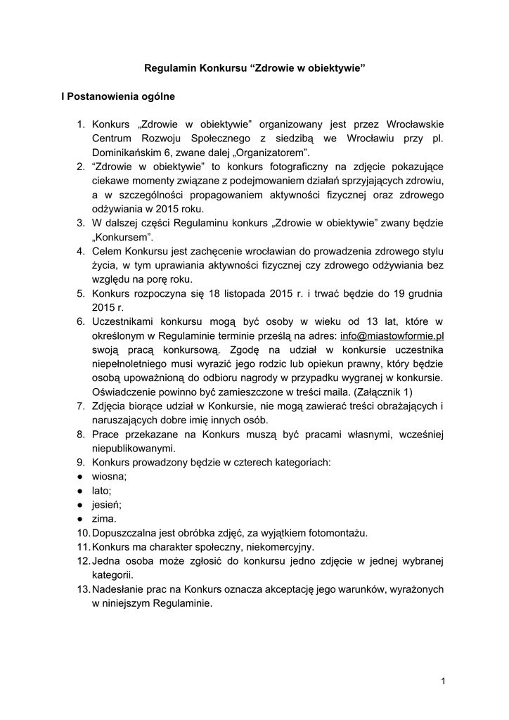 Regulamin Konkursu “Zdrowie w obiektywie” I Postanowienia ogólne 1. Konkurs „Zdrowie w obiektywie” organizowany jest przez Wrocławskie Centrum Rozwoju Społecznego z siedzibą we Wrocławiu przy pl. Dominikańskim 6, zwane dalej „Organizatorem”. 2. “Zdrowie w obiektywie” to konkurs fotograficzny na zdjęcie pokazujące ciekawe momenty związane z podejmowaniem działań sprzyjających zdrowiu, a w szczególności propagowaniem aktywności fizycznej oraz zdrowego odżywiania w 2015 roku. 3. W dalszej części Regulaminu konkurs „Zdrowie w obiektywie” zwany będzie „Konkursem”. 4. Celem Konkursu jest zachęcenie wrocławian do prowadzenia zdrowego stylu życia, w tym uprawiania aktywności fizycznej czy zdrowego odżywiania bez względu na porę roku. 5. Konkurs rozpoczyna się 18 listopada 2015 r. i trwać będzie do 19 grudnia 2015 r. 6. Uczestnikami konkursu mogą być osoby w wieku od 13 lat, które w określonym w Regulaminie terminie prześlą na adres: [email protected] swoją pracą konkursową. Zgodę na udział w konkursie uczestnika niepełnoletniego musi wyrazić jego rodzic lub opiekun prawny, który będzie osobą upoważnioną do odbioru nagrody w przypadku wygranej w konkursie. Oświadczenie powinno być zamieszczone w treści maila. (Załącznik 1) 7. Zdjęcia biorące udział w Konkursie, nie mogą zawierać treści obrażających i naruszających dobre imię innych osób. 8. Prace przekazane na Konkurs muszą być pracami własnymi, wcześniej niepublikowanymi. 9. Konkurs prowadzony będzie w czterech kategoriach: ● wiosna; ● lato; ● jesień; ● zima. 10. Dopuszczalna jest obróbka zdjęć, za wyjątkiem fotomontażu. 11. Konkurs ma charakter społeczny, niekomercyjny. 12. Jedna osoba może zgłosić do konkursu jedno zdjęcie w jednej wybranej kategorii. 13. Nadesłanie prac na Konkurs oznacza akceptację jego warunków, wyrażonych w niniejszym Regulaminie. 1 II Przepisy dotyczące prac 1. Prace konkursowe muszą być wykonane samodzielnie przez uczestnika konkursu i spełniać następujące kryteria: • prace w formacie JPG; • wielkość pliku nie może przekroczyć 4MB; • minimalny rozmiar pliku powinien wynosić 400x600 pikseli. 2. Fotografie należy nadsyłać na adres: [email protected] w formie załączników do listu elektronicznego. W temacie wiadomości należy wpisać „Zdrowie w obiektywie” i dopisać kategorie. Wzór: “Zdrowie w obiektywie lato”. W treści maila prosimy wpisać tytuł zdjęcia, imię i nazwisko oraz numer telefonu i miejsce zamieszkania Uczestnika Konkursu. 3. W załączniku maila musi znaleźć się podpisane oświadczenie: „Wyrażam zgodę na zbieranie, gromadzenie i przetwarzanie moich danych osobowych i osoby nad którą sprawuję opiekę wyłącznie w celu przeprowadzenia konkursu fotograficznego »Zdrowie w obiektywie«, zgodnie z ustawą z dnia 29.08.1997 r. o ochronie danych osobowych (Dz. U. z 2001 r., Nr 101, poz. 926 z późn. zm.). Oświadczam, iż powyższe dane udostępniam dobrowolnie, zostałem/am poinformowany/a o celu zbierania danych osobowych, zakresie ich przetwarzania oraz o tym, że mam prawo dostępu do treści danych, ich poprawiania czy żądania zaprzestania przetwarzania danych osobowych”. Zgłoszenie uczestnika bez tej klauzuli nie będzie rozpatrywane. (Załącznik 2) 4. Dane osobowe Uczestników będą przetwarzane przez Organizatora w celu: realizacji Konkursu, wyłonienia zwycięzców, wręczenia nagród, promocji Konkursu a także jego efektów. Uczestnik Konkursu posiada prawo wglądu w swoje dane osobowe, ich modyfikacji lub wystąpienia o ich usunięcie. 5. Każdy uczestnik konkursu może nadesłać maksymalnie jedną fotografię. 6. Zdjęcia zostaną opublikowane na stronie: https://www.facebook.com/zdrowie.dieta.wroclaw/ po zakończeniu etapu nadsyłania zdjęć (15 grudnia) w odpowiednim albumie. Zdjęcia będą opatrzone będą imieniem i nazwiskiem Uczestnika oraz nazwą zdjęcia. III Terminy 1. Konkurs trwa od 18 listopada 2015 r. do 19 grudnia 2015 r. 2. Pierwszy etap, czyli nadsyłanie prac, trwa od 18 listopada do 15 grudnia, do godz. 24.00. 3. Drugi etap, czyli głosowanie na stronie https://www.facebook.com/zdrowie.dieta.wroclaw/ trwa od 16 grudnia godz. 10.00 do 19 grudnia, godz. 12.00. 6. Zwycięzców konkursu poznamy 19 grudnia o godz. 14.00. 2 7. Zwycięzcy konkursu zostaną powiadomieni o wygranej przez jednokrotne wysłanie wiadomości na adres email Uczestnika lub telefonicznie na numer podany w zgłoszeniu. Lista zwycięzców będzie też ogłaszana na stronie internetowej www.miastowformie.pl. IV Głosowanie 1. Głosowanie będzie się odbywać na stronie https://www.facebook.com/zdrowie.dieta.wroclaw/ w terminie od 16 grudnia, godz. 10.00, do 19 grudnia, godz. 12.00. 2. Głosować będą użytkownicy portalu Facebook, poprzez dodanie komentarza „:)” pod wybranym zdjęciem konkursowym. 3. Głosując na zdjęcie konkursowe, jedna osoba może dodać tylko jeden komentarz pod danym zdjęciem w danej kategorii. 4. Zdjęcie z największą liczbą komentarzy w danej kategorii wygrywa. Wedle liczby komentarzy miejsce drugie i trzecie zajmują kolejne osoby. 5. Dopuszczalne są wszelkie formy promowania swojego zdjęcia. Zdjęcie można udostępniać, jednak w konkursie liczą się komentarze pod zdjęciem na stronie głównej konkursu: https://www.facebook.com/zdrowie.dieta.wroclaw/ V Nagrody i wyróżnienia 1. W konkursie przewidziane są nagrody dla laureatów pierwszego, drugiego i trzeciego miejsca w każdej kategorii. 2. Wygrane zdjęcia zostaną opublikowane na portalu www.miastowformie.pl 3. W konkursie przewidziane są nagrody rzeczowe, m.in. steppery, sprzęt fitness oraz akcesoria fitness, wejściówki do klubów fitness. 4. Nagroda rzeczowa nie podlega zamianie na inną ani zamianie na ekwiwalent pieniężny. 5. Przyjmuje się, że osobą uprawnioną do odbioru nagrody jest osoba, której dane wskazane są w zgłoszeniu jako „