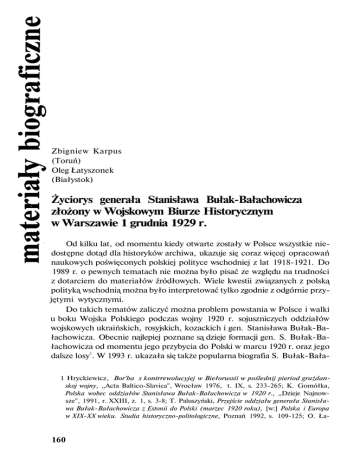 Zbigniew Karpus (Toruń) Oleg Łatyszonek (Białystok) Życiorys generała Stanisława Bułak-Bałachowicza złożony w Wojskowym Biurze Historycznym w Warszawie 1 grudnia 1929 r. Od kilku lat, od momentu kiedy otwarte zostały w Polsce wszystkie nie dostępne dotąd dla historyków archiwa, ukazuje się coraz więcej opracowań naukowych poświęconych polskiej polityce wschodniej z lat 1918-1921. Do 1989 r. o pewnych tematach nie można było pisać ze względu na trudności z dotarciem do materiałów źródłowych. Wiele kwestii związanych z polską polityką wschodnią można było interpretować tylko zgodnie z odgórnie przy jętymi wytycznymi. Do takich tematów zaliczyć można problem powstania w Polsce i walki u boku Wojska Polskiego podczas wojny 1920 r. sojuszniczych oddziałów wojskowych ukraińskich, rosyjskich, kozackich i gen. Stanisława Bułak-Ba łachowicza. Obecnie najlepiej poznane są dzieje formacji gen. S. Bułak-Ba łachowicza od momentu jego przybycia do Polski w marcu 1920 r. oraz jego dalsze losy1. W 1993 r. ukazała się także popularna biografia S. Bułak-Bała1 Hryckiewicz, Bor'ba s kontrrewolucyjej w Biełorussii w poślednij pieriod grażdanskoj wojny, „Acta Baltico-Slavica", Wrocław 1976, t. IX, s. 233-265; K. Gomółka, Polska wobec oddziałów Stanisława Bułak-Bałachowicza w 1920 r., „Dzieje Najnow sze", 1991, r. XXIII, z. 1, s. 3-8; T. Paluszyński, Przejście oddziału generała Stanisła wa Bułak-Bałachowicza z Estonii do Polski (marzec 1920 roku), [w:] Polska i Europa w XIX-XX wieku. Studia historyczno-politologiczne, Poznań 1992, s. 109-125; O. Ła- 160 chowicza2. Najmniej natomiast wiemy o życiu i działalności tej osoby do końca I wojny światowej. Autorzy o tym okresie życia swego bohatera pisali bardzo ogólnie3 lub przyjmowali bezkrytycznie ustalenia zawarte w nieopublikowanym opracowaniu S. Lis-Błońskiego pt. Bałachowcy4. W pozycji tej jest wiele nieścisłości, szczególnie dotyczących pierwszego okresu życia i działalności S. Bułak-Bałachowicza do 1918 r. Tymczasem w zbiorach Centralnego Archiwum Wojskowego (CAW) w Warszawie-Rembertowie w zespole Relacje (I.400.2134) znajduje się, prak tycznie dotąd nie wykorzystany przez historyków zajmujących się tą posta cią, życiorys napisany przez samego gen. S. Bułak-Bałachowicza. Jest to maszynopis liczący 14 stron, złożony w Wojskowym Biurze Historycznym 7 grudnia 1929 r.5 Powstał on w okresie, gdy gen. S. Bułak-Bałachowicz starał się o uznanie go przez polskie władze za kombatanta wojskowego. Życiorys ten znacznie poszerza naszą dotychczasową wiedzę o przod kach S. Bułak-Bałachowicza w linii męskiej oraz jego najbliższej rodzinie. W nowym świetle stawia problem jego wykształcenia, gdyż dotychczas ucho dziło za pewnik, że ukończył on średnią szkołę rolniczą. W pierwszej części życiorysu jest ponadto wiele nowych danych o przebiegu jego kariery zawo dowej i życiu przed wybuchem I wojny światowej6. Dokument ten w znacznym stopniu uzupełnia znane dotąd dane o prze biegu służby wojskowej S. Bułak-Bałachowicza i jego brata Józefa w armii rosyjskiej, zwłaszcza o okresie pobytu w oddziale Punina. Dotychczas nie znane były dokładne informacje o posiadanych odznaczeniach rosyjskich, a szczególnie o okolicznościach ich otrzymania7. Potwierdzone zostały rówtyszonek, Generał Bułak-Bałachowicz — od armii carskiej do armii narodowej,,,Dyskusja", 1990, nr 2-3, s. 32-39, tenże, Generał Bułak-Bałachowicz w wojnie 1919-1920, „Sybirak", 1990, nr 2, s. 7-12; tenże, Spod czerwonej gwiazdy pod biały krzyż, „Zeszyt Naukowy Muzeum Wojska w Białymstoku", 1992, nr 6, s. 41-49; tenże, Mundury i odznaki białoruskich formacji wojskowych 1918-1923, „Zeszyt Naukowy Muzeum Wojska w Białymstoku", 1994, nr 8, s. 31-36; Z. Karpus, Jeńcy i internowani rosyjscy i ukraińscy w Polsce w latach 1918-1924, Toruń 1991, s. 74-79, 112-136; tenże, Obóz internowanych nr 7 w Tucholi (wrzesień 1921 — styczeń 1923), [w:] Mniejszości na rodowe i wyznaniowe w Województwie Pomorskim w okresie międzywojennym, red. M. Wojciechowski, Toruń 1991, s. 143-157; tenże, Działania gen. S. Bułak-Bałacho wicza i jego oddziału w Polsce podczas wojny 1920 r., „Zeszyt Naukowy Muzeum Wojska w Białymstoku", 1990, nr 4, s. 89-101; tenże, Białoruskie formacje wojskowe w Polsce w latach 1919-1921, [w:] Pomorze — Polska — Europa. Studia i materiały do dziejów XIX i XX wieku, Toruń 1995, s. 223-231; Sąsiedzi wobec wojny 1920 roku. Wybór dokumentów, oprac. J. Cisek, Londyn 1990, s. 121-144. 2 Cabanowski, Generał Stanisław Bułak-Bałachowicz, Warszawa 1993. 3 Tamże. O. Łatyszonek, Spod czerwonej gwiazdy pod biały..., s. 41; tenże, Generał Bułak-Bałachowicz w wojnie 1919-1920..., s. 7-8. 4 S. Lis-Błoński, Bałachowcy, (maszynopis), Ossolineum, Wrocław, nr 155545/II. 5 Centralne Archiwum Wojskowe, I.400, sygn. 2134, k. 1-14. 6 Tamże, k. 1-7. 7 Tamże, k. 12-13. 161 nież informacje o dobrej znajomości przez gen. S. Bułak-Bałachowicza oprócz języków polskiego, białoruskiego, rosyjskiego także litewskiego i niemiec kiego8. Tekst życiorysu gen. Stanisława Bułak-Bałachowicza z 1929 r. ze względu na jego walory poznawcze opublikowany jest w całości. Zmodernizowano jedynie pisownię, rozwinięto mniej zrozumiałe skróty oraz poprawiono liczne błędy powstałe przy przepisywaniu tekstu na maszynie w 1929 r. Upowszech nienie tego dokumentu przyczyni się do wzbogacenia naszej wiedzy o tej barw nej postaci. Mamy nadzieję, że życiorys ten będzie wykorzystywany w szerszym stopniu niż dotychczas w badaniach historycznych i zweryfikuje powielane dotychczas błędne informacje o życiu i działalności gen. S. BułakBałachowicza. *** Relacja gen. Stanisława Bułak-Bałachowicza z dnia 7.XII.1929 r. Mój życiorys i moja działalność do czasu wojny światowej, podczas wojny światowej i w czasie pokoju Wobec roz